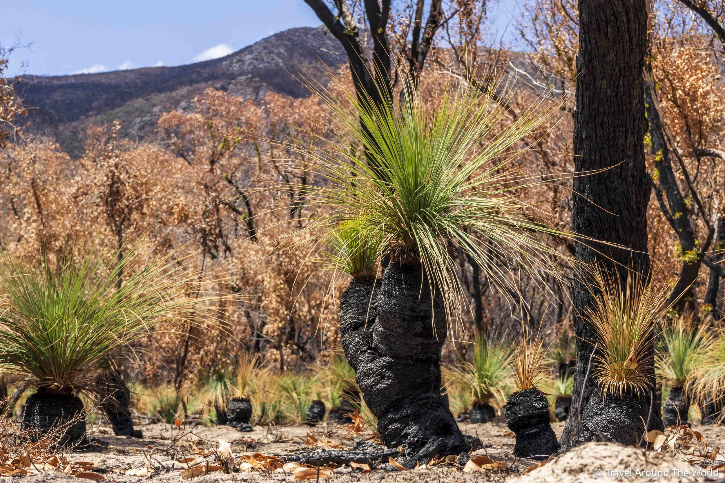 Es hat überhaupt nicht unseren Vorstellungen entsprochen. Weder waren alle Bäume komplett abgebrannt, noch gibt es keinerlei Blätter, Gräser und sonstige Pflanzen mehr. Viele Pflanzen benötigen Feuer, damit sie wieder keimen können. Die Pflanze unten links beispielsweise beginnt innerhalb von acht Tagen nach einem Brand wieder zu wachsen. Der Blütenstängel wächst bis zu 15 cm pro Tag! Anhand unserer Bildergalerie ist am besten ersichtlich, wie es hier ausgesehen hat.