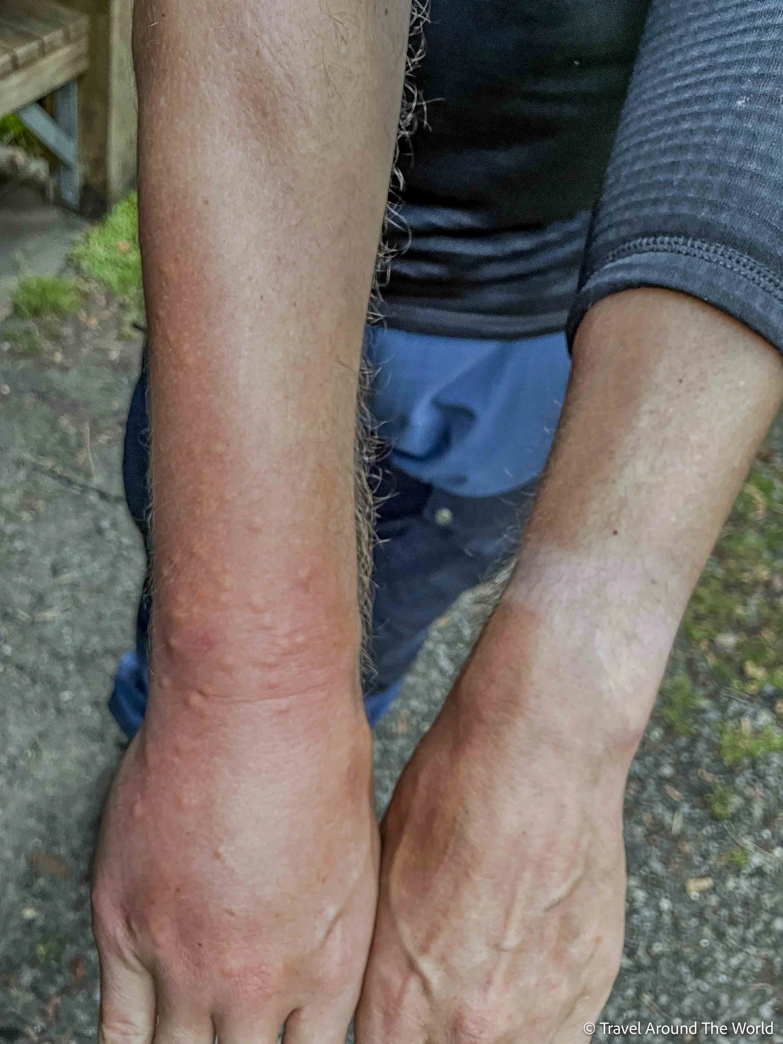 Basil hat dafür Bekanntschaft mit etwas anderem gemacht. Was dieses «Etwas» gewesen sein könnte, blieb lange Zeit rätselhaft. Nach der ersten Nacht war Basils rechter Arm mit diversen «Stichen» übersäht. Da es jedoch nicht juckte, dachten wir uns vorerst nichts weiter dabei. Erst am Abend fanden wir es etwas beunruhigend, weil der Arm stark angeschwollen und regelrecht heiss geworden war. Wir versuchten mit den uns zu Verfügung stehenden (bescheidenen) Mitteln, den Arm zu kühlen: feuchte Wickel mit einem Küchentuch, Kühlen auf der Chromstahlküchenzeile sowie die Einnahme eines Antihistaminikums. Viel gebracht hat dies alles nicht. Wenigstens wurden die Symptome auch nicht schlimmer. Dennoch waren wir beunruhigt, so waren wir doch 5 Gehstunden vom Dorf entfernt und wir hatten keinen Empfang. Niemand wusste recht, was es sein könnte. (Mücken)Stiche wurden aufgrund der hohen Anzahl und Dichte von vielen ausgeschlossen (und auch, weil wir anderen keine Beschwerden/Stiche hatten). Andere vermuteten, dass Basil beim Wandern mit seinem Arm eine Pflanze (Brennnessel o.ä.) gestreift haben könnte. Wobei wir uns nicht vorstellen können, dass du mit deinem gesamten Unterarm eine Brennnessel berührst und es nicht merkst…