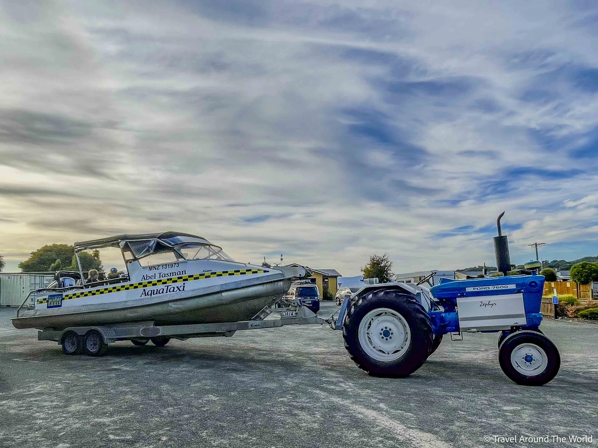Für diese Zweitagestour haben wir uns für eine Zeltübernachtung sowie für eine Wassertaxi-Fahrt entschieden. Der Treffpunkt war direkt beim Visitor Centre. Wir staunten nicht schlecht, als zur vereinbarten Zeit verschiedene Traktoren mit den Wassertaxis auf ihren Anhängern eintrafen. Wir steigen also in «unser» Boot und werden dann vom Traktor an den Strand und bis ins Wasser hinein gefahren. Sobald das Wasser tief genug ist, werden die Wassertaxis vom Anhänger gelassen. Auf einer gemütlichen Bootsfahrt wird man in die gewünschte Bucht gefahren (wobei pro Bucht mindestens ein Wassertaxi mit Platz für ca. 16 Personen fährt). Man kann nun einfach einen schönen Tag in der Bucht verbringen, ein Teilstück laufen und sich von dort wieder abholen lassen oder – so wie wir es gemacht haben – einmal übernachten und am zweiten Tag wieder zurück nach Marahau laufen.