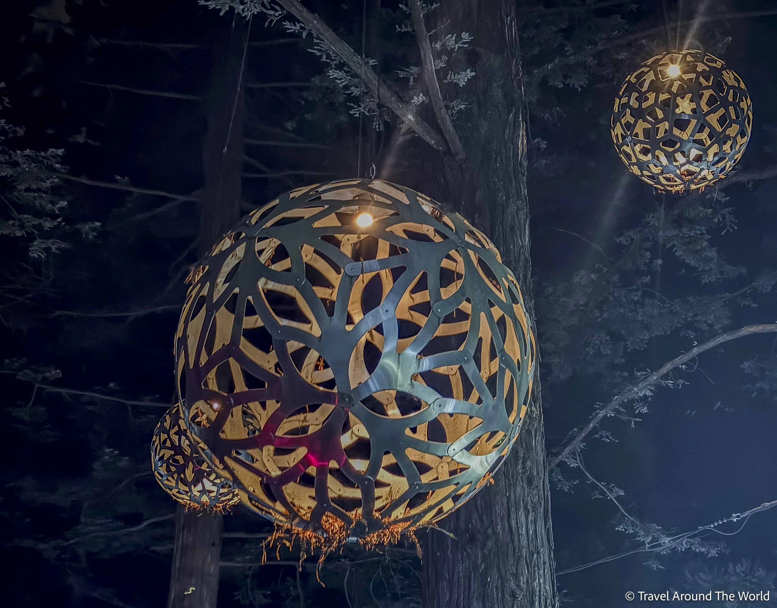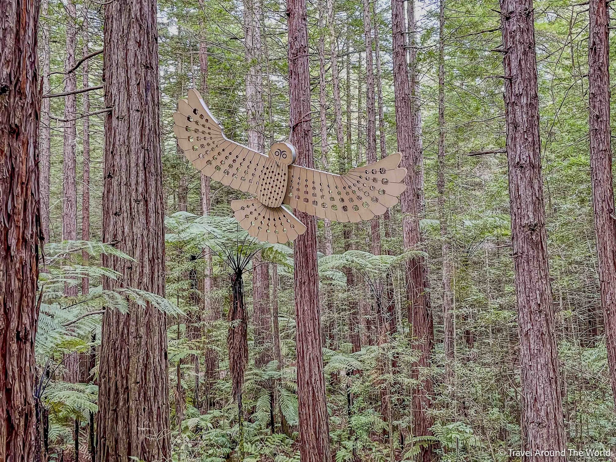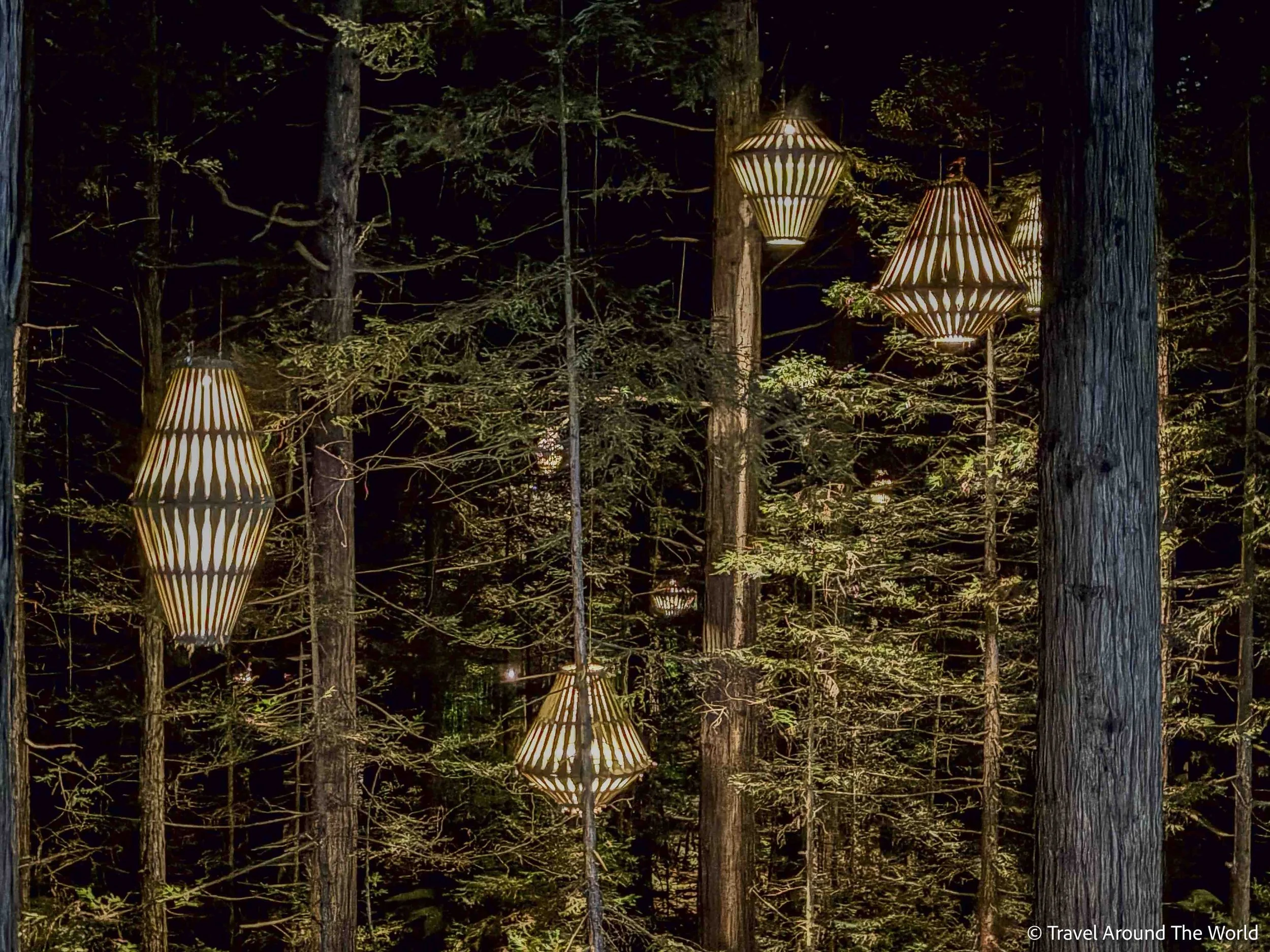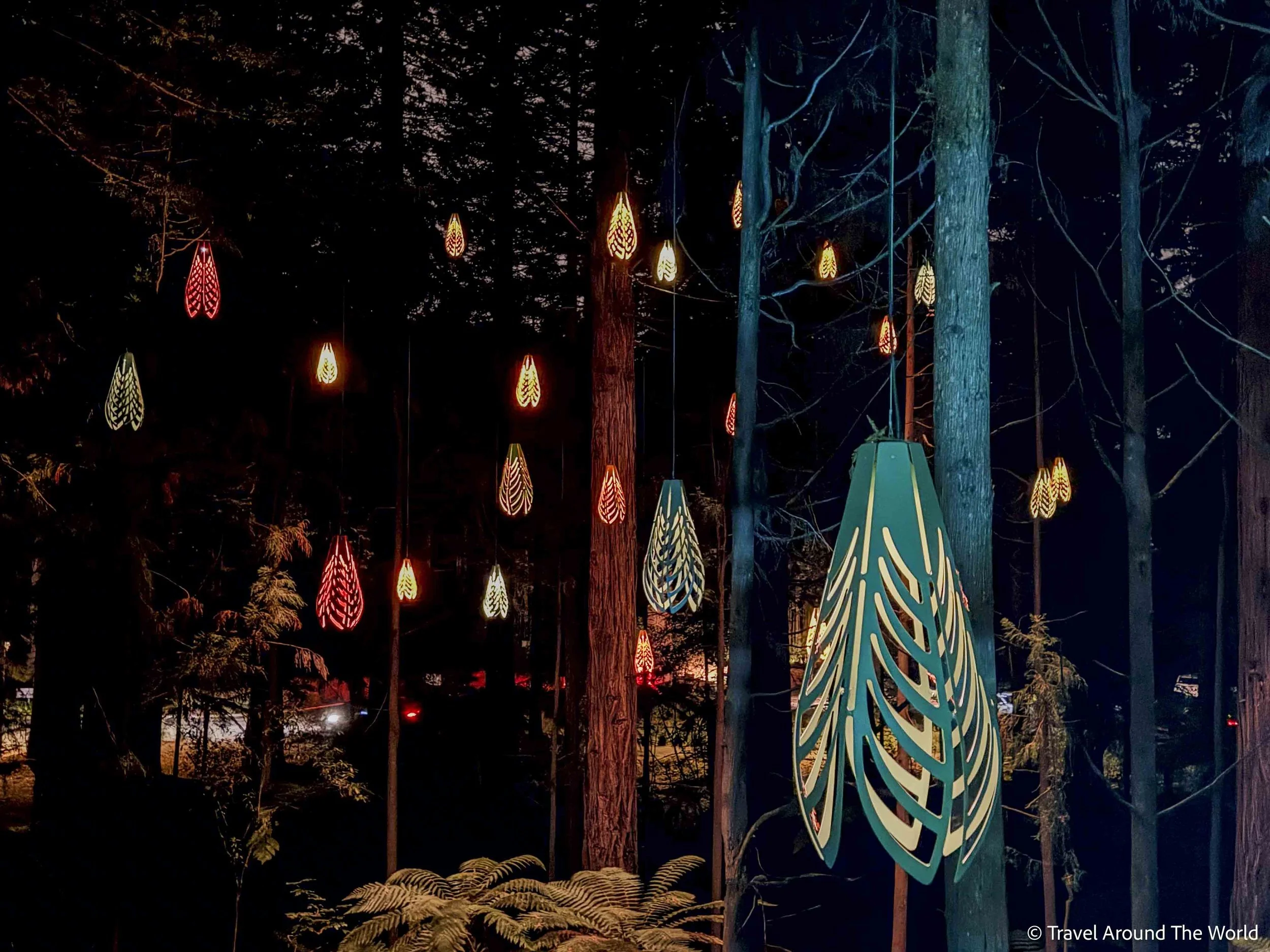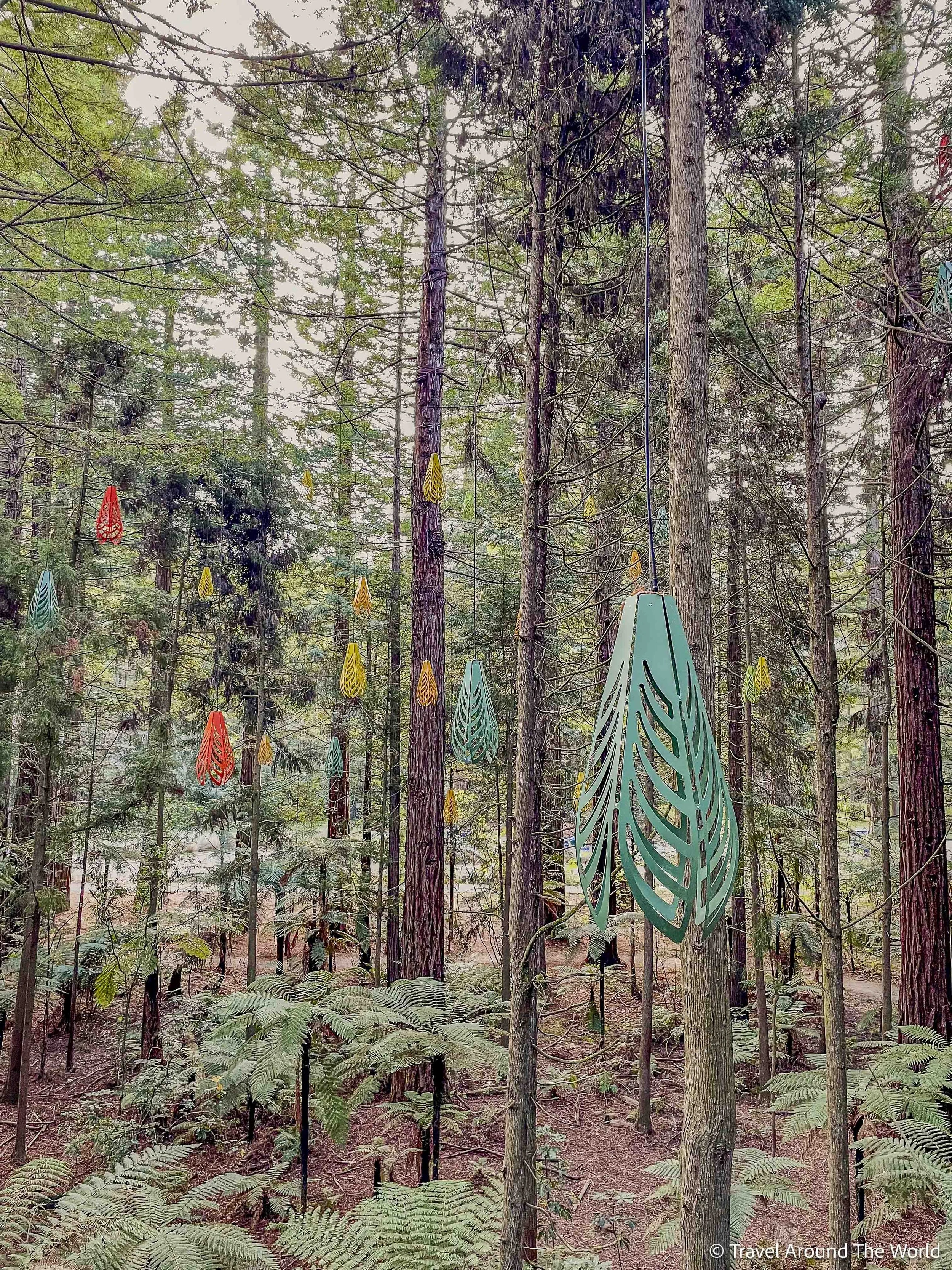 … Redwoods? Die sind doch in Kalifornien? Richtig, aber es gibt auch in Neuseeland einen Redwoods-Wald (der auch unter dem Namen Whakarewarewa Forest bekannt ist). Während auf dem Boden zahlreiche Bike- und Wanderwege durch die Baumgiganten hindurchführen, befindet sich die Hauptattraktion in luftiger Höhe: 28 Brücken führen auf einer Länge von ca. 700 Metern von Baum(plattform) zu Baum(plattform) und lassen einem die Baumriesen aus einer neuen Perspektive entdecken. Schon bei Tage ist es beeindruckend, auf einer Höhe von bis zu 20 Metern auf den Waldboden hinunterzublicken oder den Blick noch weiter nach oben schweifen zu lassen (der höchste Redwood im Whakarewarewa Forest ist über 70 Meter hoch). Tagsüber fallen einem die unscheinbaren Holzinstallationen, die überall in den Bäumen hängen, gar nicht weiter auf. Eine ganz andere Welt eröffnet sich einem, wenn man den Redwoods Treewalk nach Einbruch der Dunkelheit besucht. Zwar lassen sich dann die Bäume nicht mehr ganz so gut bestaunen, dafür erwachen die Holzinstallationen plötzlich zum Leben. Es handelt sich hierbei nämlich um (insgesamt 34) Holzlaternen, die bei Dunkelheit ein zauberhaftes Licht abgeben und die Umgebung in ein wahres Märchenparadies verwandeln. Staunend sind wir den Baumwipfelpfad im Dunkeln gelaufen und fühlten uns kurzzeitig wie in eine andere Welt katapultiert. Was unter Tage bereits eindrücklich war, erreichte am Abend eine ganz andere Dimension. Die vielen Menschen, die sich dieses magische Erlebnis ebenfalls nicht entgehen lassen möchte, muss man dabei so gut wie möglich ausblenden.