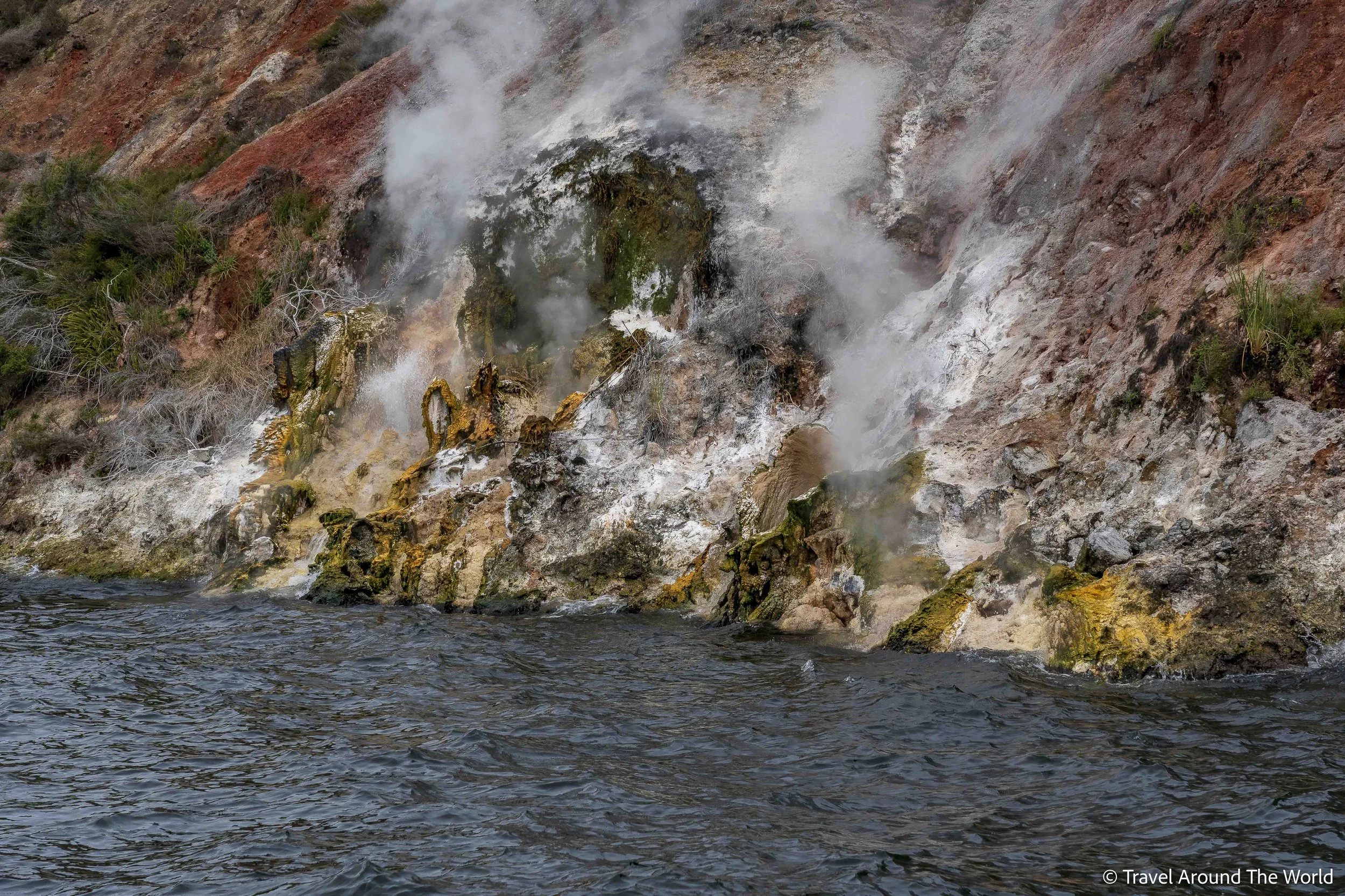 Den ganzen Tag über nur zu baden, wäre nicht so ganz nach Basils Geschmack. Es wäre in der Tat auch etwas schade, denn in der Gegend um Taupo und Rotorua gibt es (nebst den vielen «badbaren» heissen Quellen) auch ganz viele geothermisch aktive Gebiete. Viele sind touristisch gut erschlossen und lassen sich zu Fuss, mit dem Boot oder sogar per Shuttlebus erkunden. Wir lieben es, in diesen Umgebungen unterwegs zu sein. Meistens verrät einem schon der schweflige Geruch, dass das nächste geothermische Gebiet nicht mehr weit entfernt sein kann. Sofort kommen dann auch Erinnerungen an den Yellowstone Nationalpark und Island hoch. Die vielen verschiedenen Farben und Muster bieten fantastische Fotosujets, die an abstrakte Gemälde erinnern. Mit so vielen spannenden Sujets, verlieren wir beim Fotografieren dann gerne auch mal die Zeit etwas aus den Augen (was in der Regel kein Problem ist, wir haben momentan ja wirklich sehr, sehr wenige Verpflichtungen). Im Waimangu-Valley mussten wir zu einer bestimmten Zeit am Bootsanleger sein, um an einer Bootstour teilnehmen zu können. Die uns zur Verfügung stehende Zeit war zwei Stunden. Wir haben am Eingang extra noch gefragt, ob der Weg in dieser Zeit gut machbar sei, auch wenn man stoppe und fotografiere. Die Dame hat nett gelächelt und gemeint, dass wir das loooocker schaffen (man hat ihr richtig angesehen, dass sie noch sagen wollte «wenn ihr wüsstet, wer diesen Weg alles in den angegebenen zwei Stunden zurücklegen kann…»). Notfalls gäbe es ja noch die Shuttlebusse, die wir auch gerne nehmen können. Drei Mal darfst du raten, wer nach nicht mal 2/3 der Strecke plötzlich auf den Shuttle-Bus rennen musste, um die Bootstour nicht zu verpassen.