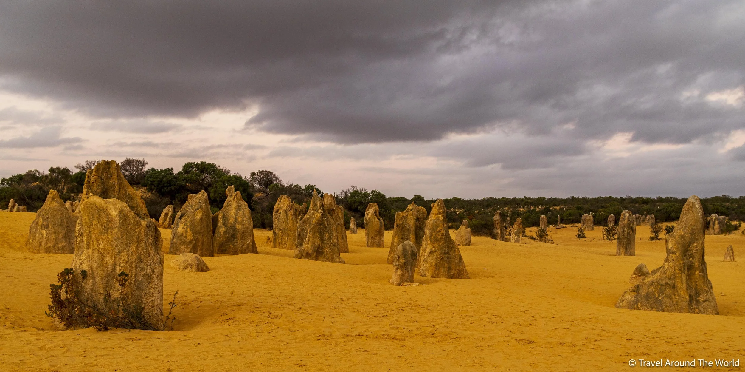Rechtzeitig, um im Nambung National Park die Kalksteinsäulen – die sogenannten Pinnacles – im weichen Spätnachmittagslicht und bei Sonnenuntergang fotografisch einzufangen. Unser Plan ging nur halbwegs auf. Zeitlich waren wir gut dran, doch die dicken Regenwolken, die zwar vorhin noch für einen schönen Kontrast zu den Lancelin Dünen gedient haben, waren jetzt zu dicht, sodass die Sonne untergegangen ist, ohne dass man es gross mitbekommen hat. Der Besuch hat sich jedoch auch ohne spektakulären Sonnenuntergang allemal gelohnt, denn im Nachmittagslicht hat der Sand und das Gestein in kräftigen Gelbtönen geleuchtet. Unabhängig von der Lichtsituation sind die Kalksteinsäulen eindrücklich, ragen sie in diesem Nationalpark doch scheinbar «einfach so» zu Dutzenden aus der Wüste empor (einige erreichen eine stolze Höhe von bis zu 3.5 Metern Höhe). «Einfach so» sind sie natürlich nicht entstanden – es hat Jahrtausende gebraucht, bis aus einem komplizierten Zusammenspiel von Meer, Sand & Wind, aber auch von Muscheln und Pflanzen schliesslich diese Kalksteinsäulen entstanden sind. Erkundet werden können die Pinnacles entweder auf einem kurzem, aber coolen 4x4-Trail oder auch zu Fuss. Uns hat Trail so gut gefallen, dass wir die knapp 4 km lange Strecke gleich zweimal gefahren sind.