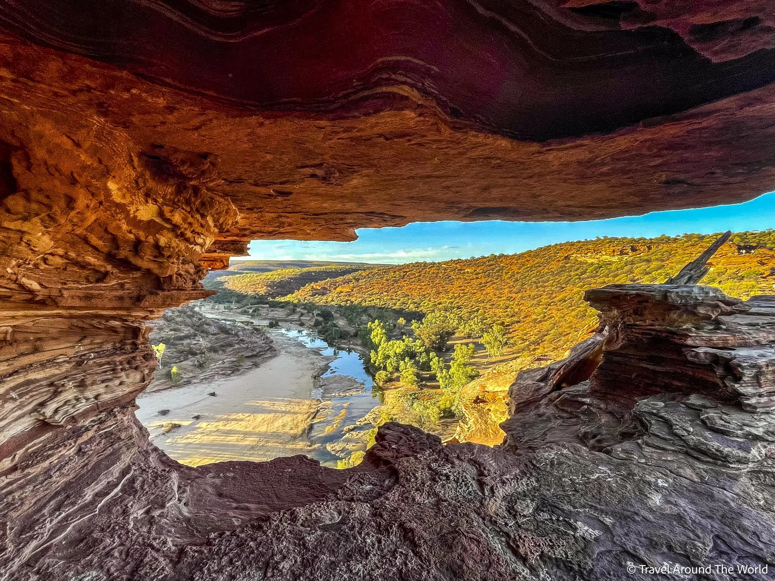 Die weitaus bekannteste Steinformation des Kalbarri National Parks ist das Nature’s Window. Blickt man hindurch, so sieht man in die Schlucht hinab, wo sich – je nach Saison – der Murchison River durchschlängelt. Besonders beliebt ist das Nature’s Window zu Sonnenaufgang, denn dann scheint zu gewissen Zeiten im Jahr die Sonne direkt durch das «Steinfenster». Die Leute pilgern in Scharen den etwa 15-minütigen Fussweg zum Nature’s Window, machen kurz ein Foto und laufen auf direktem Weg wieder zurück zum Parkplatz. Das ist wirklich schade, denn wenn man nur ein wenig weiter geht, kommt man an weiteren «Steinfenstern» vorbei, die genauso schön sind. Wir haben von hier aus eine Wanderung durch die Schlucht unternommen, die uns zuerst entlang des Schluchtenrandes, dann hinunter in die Schlucht und schliesslich wieder hinauf zum Nature’s Window geführt hat. In den Schluchten Australiens kann es unerbittlich heiss werden. Warntafeln weisen dich darauf hin, dass du unbedingt frühzeitig starten sollst und in der (heissen) Regenzeit die Temperaturen auf über 50 Grad steigen können. Zum Glück sind wir in der «kühlen» Trockenzeit unterwegs, sodass die Temperaturen weitaus erträglicher sind. Das Thermometer beim Parkplatz mit der Anzeige für die Temperatur am Boden der Schlucht hat an jenem Tag folgendes angezeigt: 18°C um 06:30 Uhr, 25°C um 09:00 Uhr und 33°C um 12:00 Uhr (bei Rückkehr zum Parkplatz). Für unseren Geschmack sind diese Temperaturen bereits mehr als hoch genug! Die abwechslungsreiche Wanderung mit den vielen schönen Ausblicken hat uns die Hitze etwas vergessen lassen (zumindest bis zu dem Punkt, wo der Aufstieg zur Schlucht hinaus begann). Es ist ein erster Vorgeschmack darauf, dass «Wandern» in Australien komplett andere Dimensionen annimmt. Sind wir in Neuseeland noch locker an die 20 km pro Tag mit einem schweren Trekkingrucksack auf mehrheitlich gut ausgebauten Wegen gewandert, so reichen uns hier 4 km mit einem leichten Tagesrucksack, dafür bei (für unsere Verhältnisse immer noch) brütender Hitze auf eher schlecht ausgebauten, oftmals steinigen «Knöchelverstaucher-Wegen» vollends aus. Ein wenig Extra-Gewicht trägt man auf jeder Wanderung automatisch mit: lästige Fliegen, die dich umschwirren, belagern und auf dir «mitreiten» …