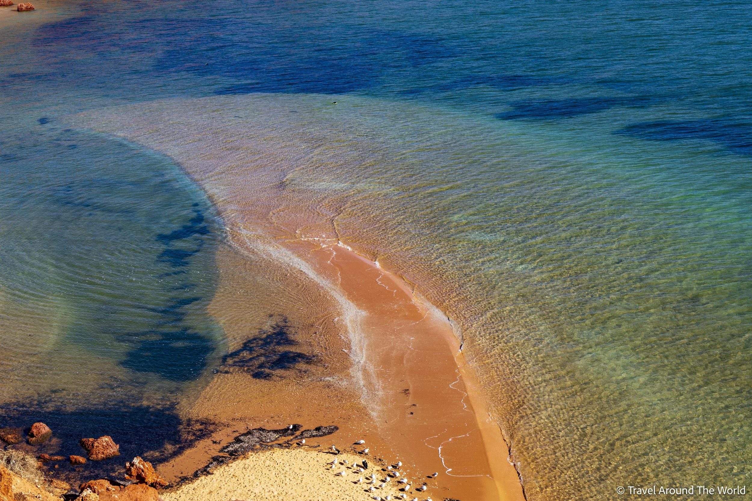 Der wunderschöne Campingplatz in den Dünen nur wenige Meter vom Meer entfernt hat uns für die nervenaufreibende Fahrt mehr als entschädigt. Blöderweise wollten wir aber nicht einfach nur zum erstbesten Campingplatz und wieder zurück, sondern noch weiter raus bis hin zum Cape Peron und dem Skipjack Point fahren. Also ging am nächsten Morgen das «rumeiern» auf der Sandpiste wieder von vorne los. Glücklicherweise ist der Sand morgens viel kühler und kompakter, was die Fahrt vereinfacht hat. Von verschiedenen Aussichtspunkten haben wir die fantastische Aussicht genossen: rotes Gestein, gelber Sand, blaues Wasser, ebenso blauer Himmel. Die vielen kräftigen Farben und Kontraste sind spektakulär. Sogar Haie und Rochen konnten wir direkt vom Festland aus beobachten. So verging die Zeit wie im Flug und natürlich war es längst wieder Nachmittag (wärmerer und schwieriger zu befahrenden Sand…), bis wir uns auf den Rückweg machten. Lange Zeit eierten wir langsam, doch erfolgreich über die Sandpiste. Wir ahnten schon lange, dass es nur eine Frage der Zeit sein würde, bis es knapp nicht mehr reicht und wir irgendwo steckenbleiben würden…