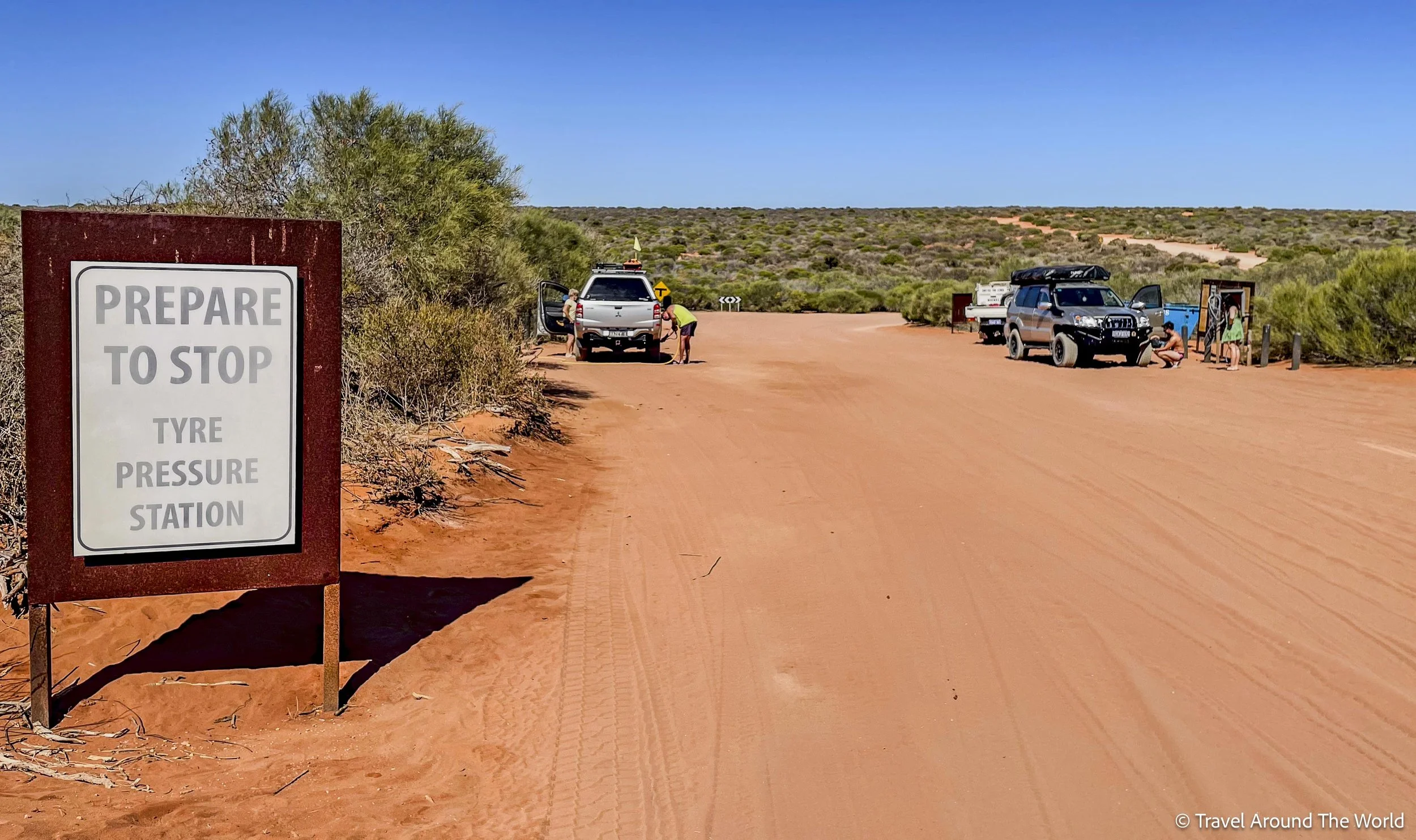 Der François Peron National Park umfasst den nördlichen Zipfel der Peron-Halbinsel. Obwohl wir bis hierhin schon etliche Kilometer gefahren sind, war bisher – abgesehen von der kurzen Strecke durch den Nambung National Park – noch nie ein Offroadfahrzeug von Nöten. Wer den François Peron National Park auf eigene Faust entdecken möchte, der braucht zwingend ein Allradfahrzeug mit viel Bodenfreiheit. Wir haben uns bereits bei den Reisevorbereitungen sehr auf diesen Nationalpark gefreut: endlich eine Gelegenheit, um die Geländegängigkeit unseres Campers, viel mehr jedoch unsere eigenen (Fahr)Fähigkeiten, zu testen. Den ersten Schritt haben wir mit Bravour gemeistert: den Reifendruck bei allen Pneus zu reduzieren (zugegeben, aus irgendetwas Luft rauszulassen ist noch keine grosse Kunst). Wir waren allerdings überrascht, wie schnell dies vonstatten ging. In nicht einmal 10 Minuten hatten wir alle vier Pneus auf den gewünschten Reifendruck (18 psi vorne resp. 23 psi hinten) reduziert. Nun kommen wir zum schwierigeren Teil: auf einer sandigen Piste zu fahren, ohne stecken zu bleiben. Der Sand war stellenweise wirklich sehr tief, was für uns mit einem verhältnismässig sehr schweren Allradfahrzeug (wegen der Wohnkabine) das Fahren zu einer echten Herausforderung machte. Die manuelle Gangschaltung hat uns die Fahrt auch nicht gerade erleichtert. In konstantem und geringem Tempo sind wir über die Piste «geschwommen» und haben immer gehofft, dass uns niemand entgegenkommt, da ein Ausweichen, Anhalten und erneutes Anfahren eine noch viel grössere Herausforderung gewesen wäre. Mit Ach und Krach haben wir es so zu unserem Campingplatz geschafft (wir haben extra den nächstgelegenen gewählt). Phu, geschafft! Entspannt war es nicht. Besonders auf dem letzten Kilometer konnten wir die Geschwindigkeit gerade noch so halten, um den Motor vor dem Abwürgen zu bewahren.