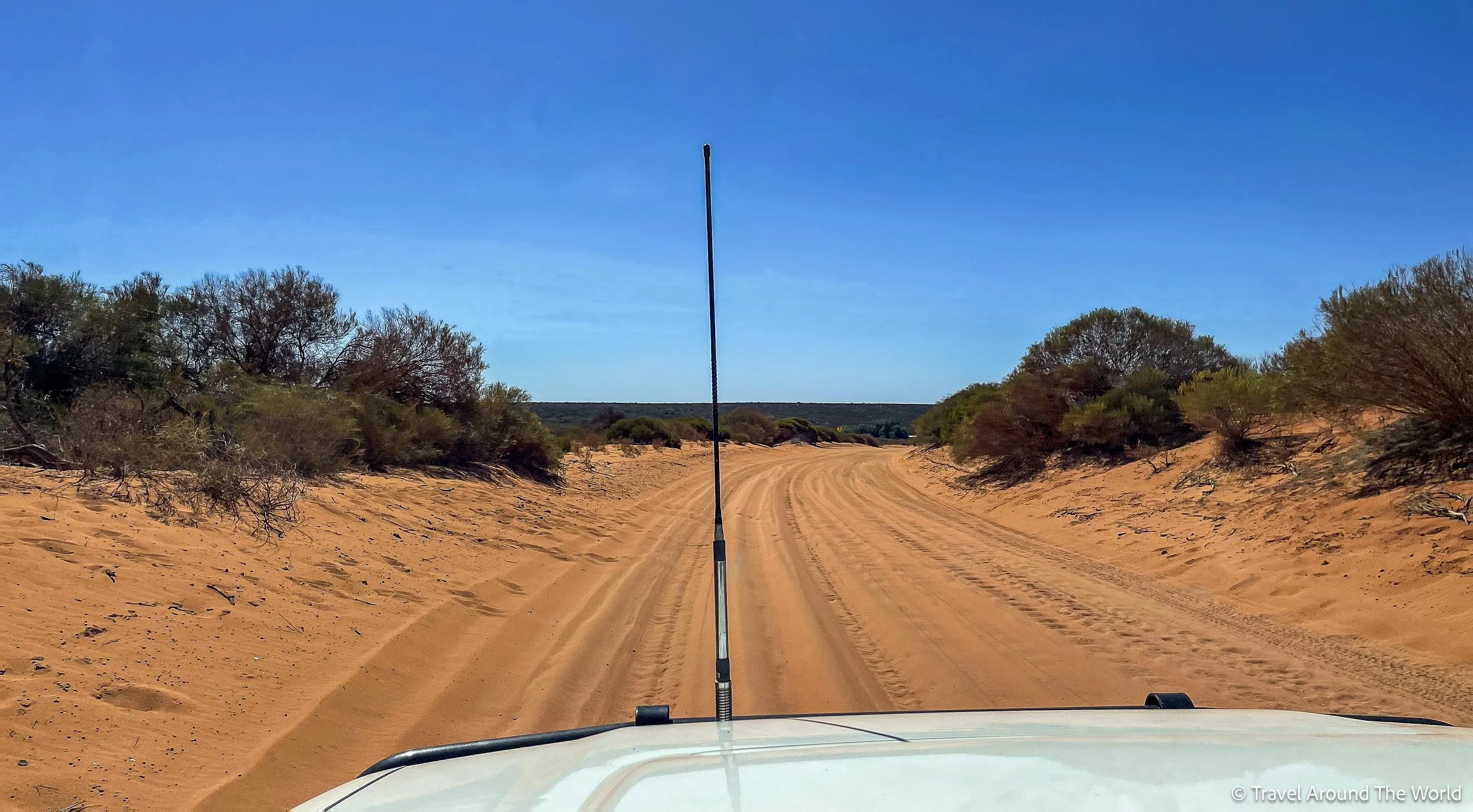 Schliesslich war es dann so weit: Wir kamen weder vorwärts noch rückwärts aus der Sandkuhle raus und haben uns bereits schön eingegraben. Da wir leicht hinter einer Kurve versteckt waren, hat Michelle als Erstes den Verkehr im Auge behalten, während Basil angefangen hat zu schaufeln und den Reifendruck um weitere 5 psi zu reduzieren. Es dauerte keine 10 Minuten, da kam das erste Fahrzeug vorbei, welches auch gleich angehalten hat. Der freundliche Aussie mit seinem Kind ist uns gleich mit Rat und Tat zur Seite gestanden und meinte, dass wir den Reifendruck noch etwas mehr verringern sollen. Mit dem neuen Reifendruck von nur noch knappe 10 psi und langsamen Rückwärtsfahren sind wir problemlos wieder freigekommen. Wir waren unglaublich dankbar für seine Einschätzung, da es uns nicht nur an Erfahrung in solchen Situationen fehlte, sondern wir auch jedes Risiko vermeiden wollten, um irgendeinen Schaden an einem Mietfahrzeug zu verursachen. Kurze Zeit später sind unsere beiden Retter und wir dann wieder losgefahren.