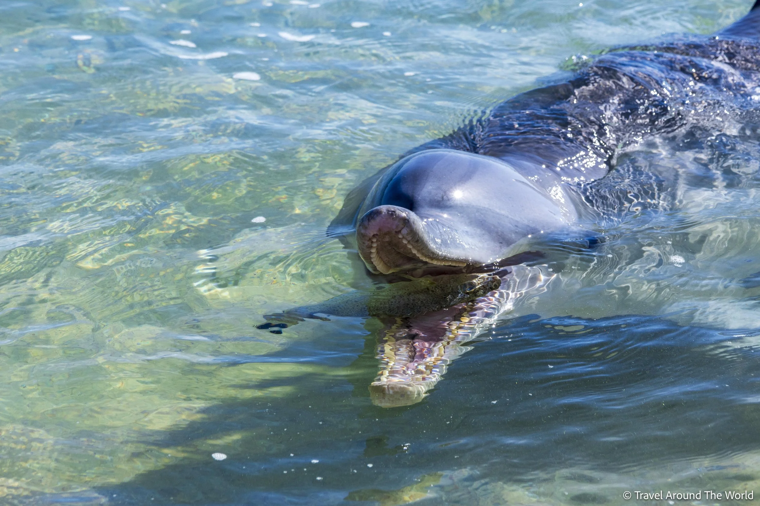 Der Ort Monkey Mia (nicht viel mehr als ein grosser Campingplatz mit guter Infrastruktur) ist seit Jahrzehnten dafür bekannt, dass sich Delfine (Grosse Tümmler) in der Bucht aufhalten. Während früher die Tiere noch angefasst und gestreichelt werden durften, gibt es heutzutage strikte Verhaltensregeln. Allmorgendlich schwimmen einige Delfine bis fast an den Strand, etwa zeitgleich strömen dutzende Leute an denselben Strandabschnitt (bei unserem Besuch waren es wohl an die 200), um die Delfine aus nächster Nähe zu erleben. Überwacht und geleitet wird das Spektakel vom Parks and Wildlife Service.