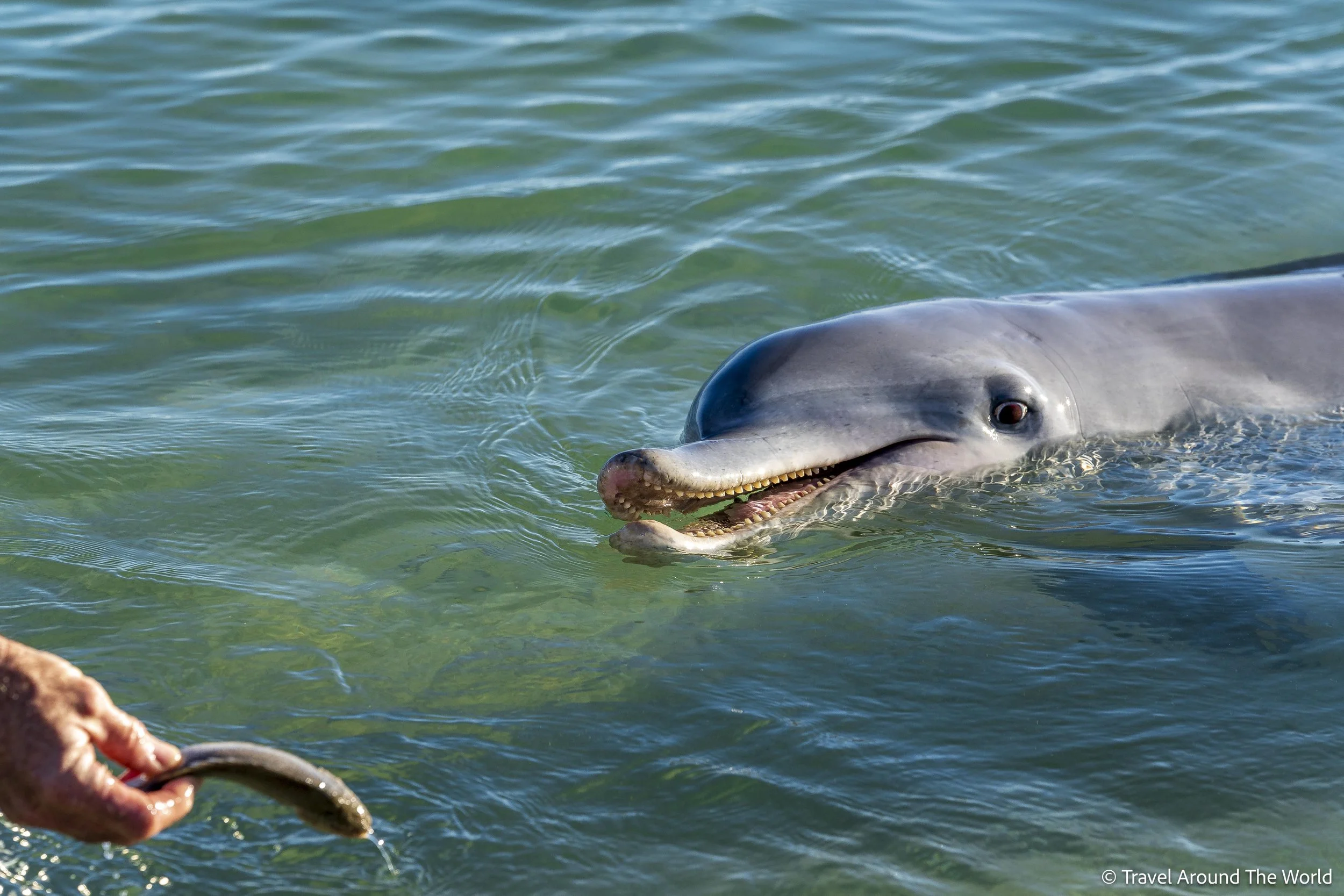 Es sind immer etwa die gleichen Tiere, die mehr oder weniger permanent in der Bucht von Monkey Mia leben. Pro Vormittag finden maximal 3 Fütterungen (von drei Delfinen auf’s Mal) statt, ab 12 Uhr wird strikt nicht mehr gefüttert. Es ist genau vorbestimmt, welche Delfine Fisch erhalten (beschränkt auf immer dieselben 5 Weibchen). Nur weil ein Delfin angeschwommen kommt, heisst es folglich nicht, dass er automatisch gefüttert wird – er kann auch leer ausgehen. Die Menge an Fisch ist sehr gering, sie macht nicht mal 1/10 des Tagesbedarfs aus – die Delfine werden somit nur mit einem kleinen Happen versorgt, den restlichen Tagesbedarf müssen sie sich selbst fangen. Die Fische werden ausnahmslos den Mitarbeitenden des Parks and Wildlife Service und ihren Helfer/innen verfüttert, die Besucher/innen sind lediglich Zuschauer/innen. Ob ein Delfin vorbeischaut, wie lange er bleibt und ob er am gleichen Morgen nochmals zurückkommt, ist völlig dem Tier überlassen. Die Tiere werden nicht in ein Becken oder einen abgesperrten Bereich «getrieben» – die Tiere kommen vom Meer und können jederzeit wieder dorthin zurück. Um den Fisch zu bekommen, müssen sie auch keine Kunststücke oder ähnliches vollführen (es ist keine Show à la SeaLife). Ist der Eimer mit den Fischen leer, so wird er mit einem Gutsch Meerwasser ausgespült – ein Zeichen für die Delfine, dass es momentan nichts mehr zu holen gibt.