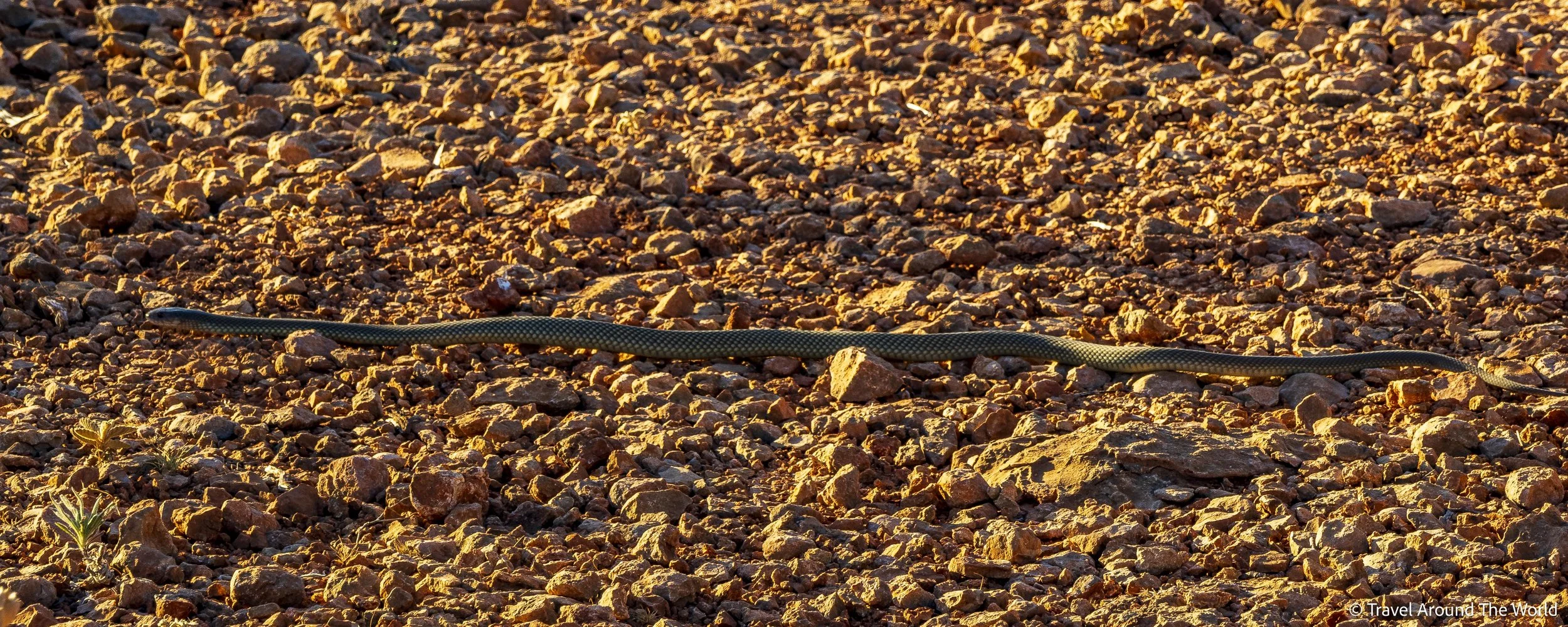 Wie wir später von einem Parkranger erfahren haben, war es in der Tat – oh Wunder – eine giftige Schlange. Eine SEHR giftige sogar, nämlich eine Mulga Snake (King Brown Snake)! Er meinte, dass immer alle nur vom (Inland)Taipan als giftigste Schlange Australiens sprechen, aber diese hier, die Mulga, sei wahrscheinlich mindestens genauso giftig! Ihr Biss habe eine der höchsten Giftkonzentrationen und zu allem Übel beisse sie meistens gleich mehrfach zu. Ja dann, gute Nacht auch! Wir ziehen jetzt wieder schön brav unsere Wanderschuhe an, auch zum «nur kurz schauen».