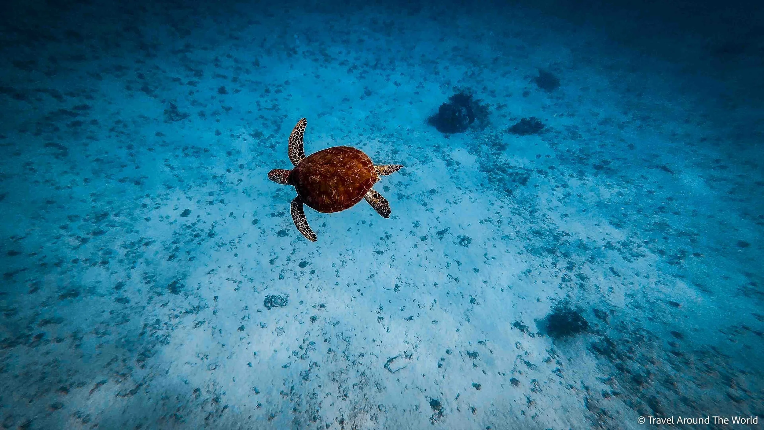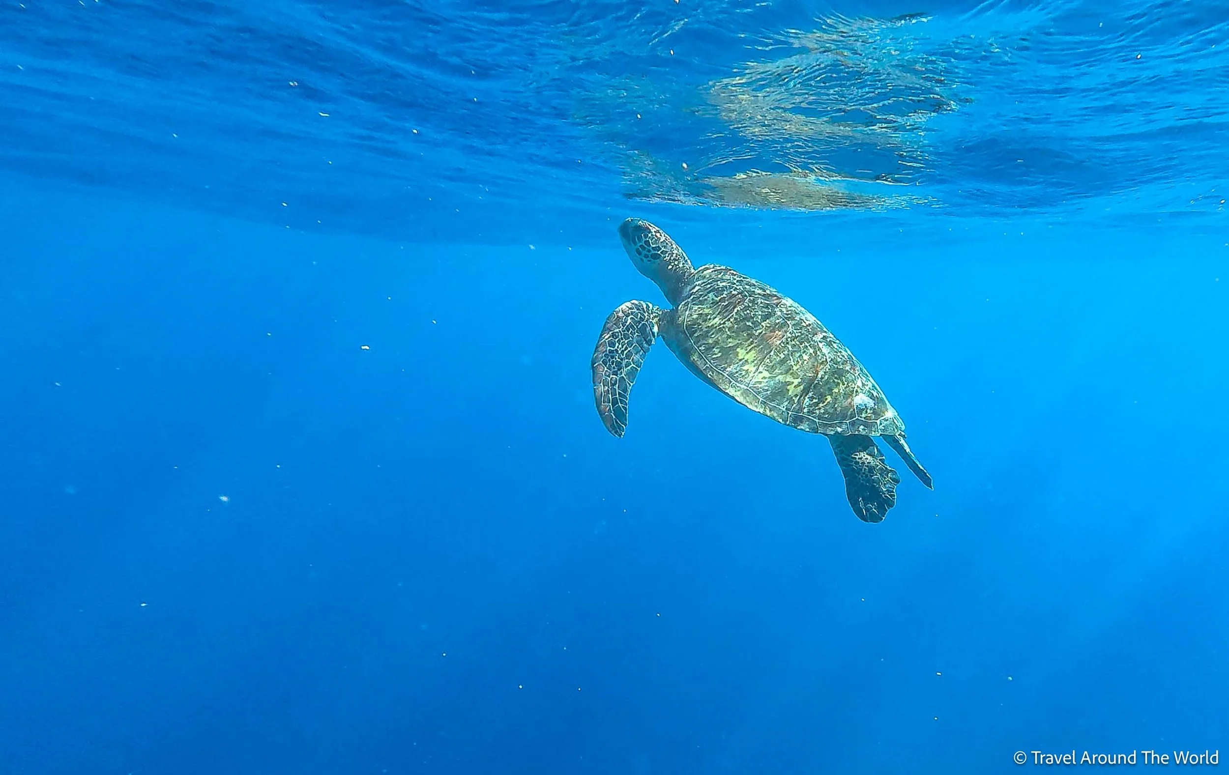 Wir beobachten sie beim Fressen, wenn sie – wie ein Fähnchen im Wind – senkrecht im Wasser schweben, beim Schwimmen sowie beim Luftholen. Sie lassen sich von uns nicht stören und wir dürfen recht nahe an die Schildkröten rangehen. Falls es einer dann doch etwas zu bunt wird, macht sie eins, zwei Flossenschläge und schon ist sie weg. Dennoch sollte man nicht zu lange bei einem einzelnen Tier verweilen, um es nicht unnötigem Stress auszusetzen. Mitunter sind wir so vom Anblick dieser Tiere gefesselt, dass wir gar nicht mitbekommen, wie unser Guide schon wieder weitergezogen ist. Wenn wir dann aufblicken, ist er meistens schon wieder ein paar Meter weiter und zeigt bereits auf eine neue Schildkröte.