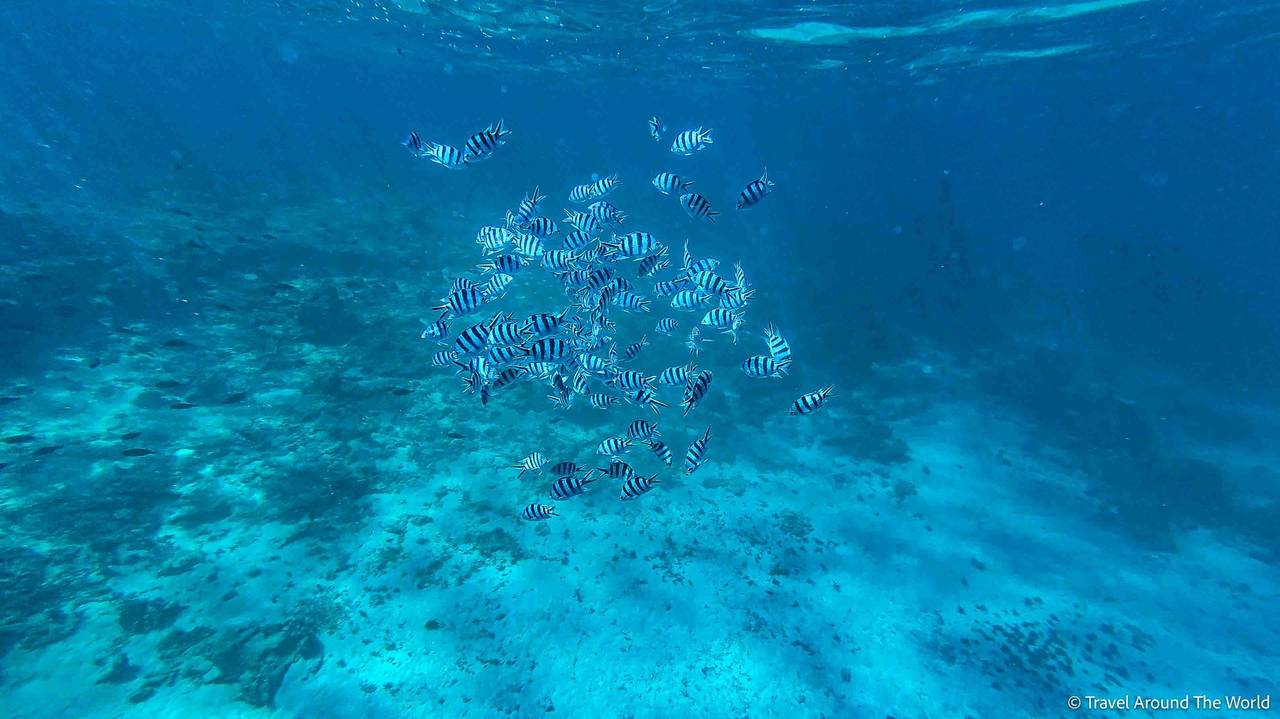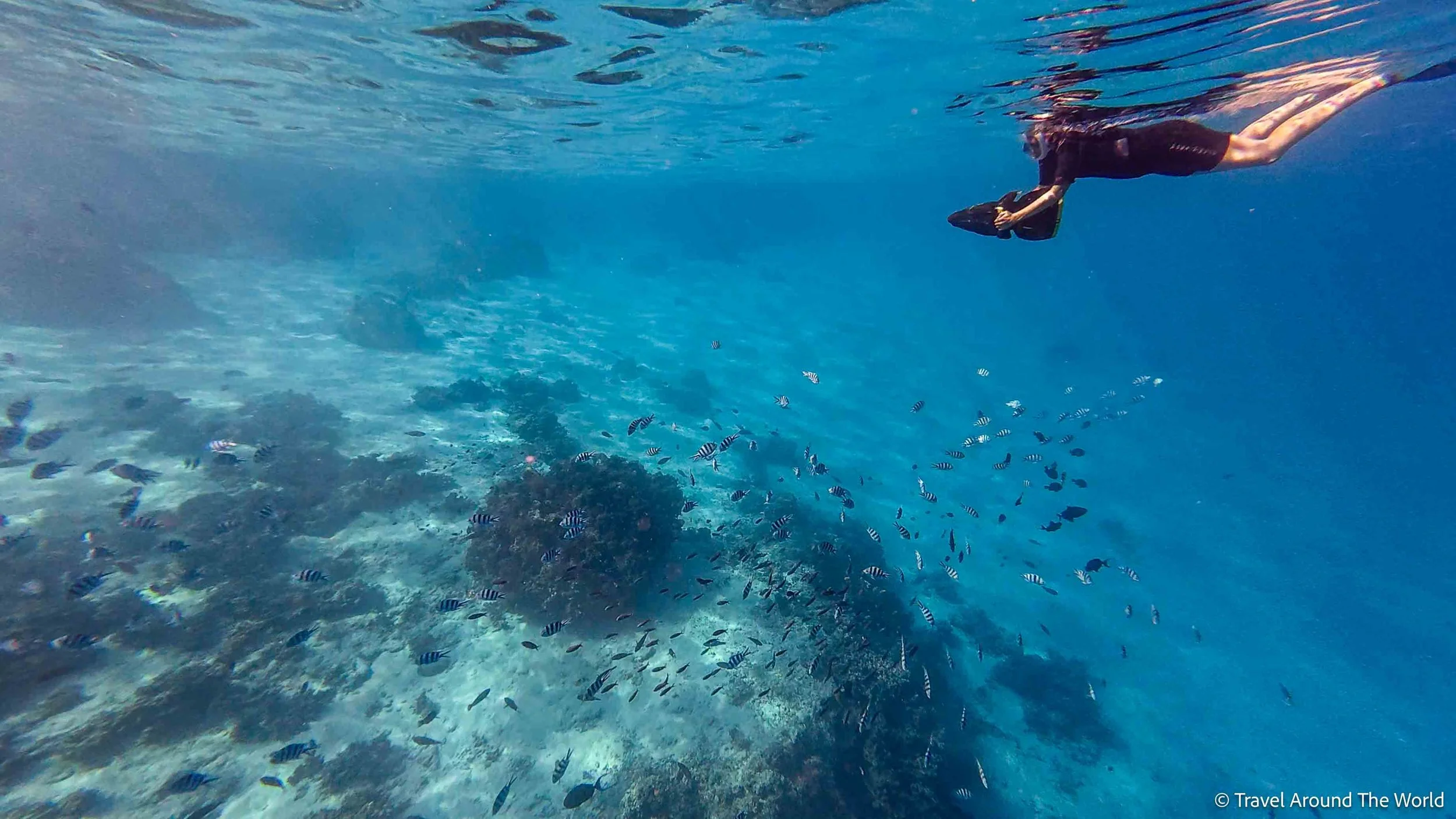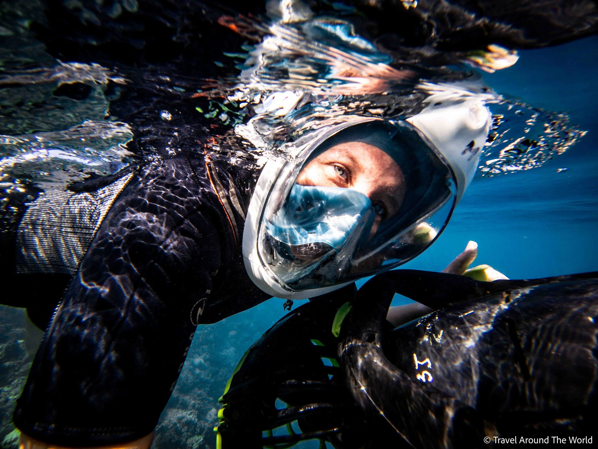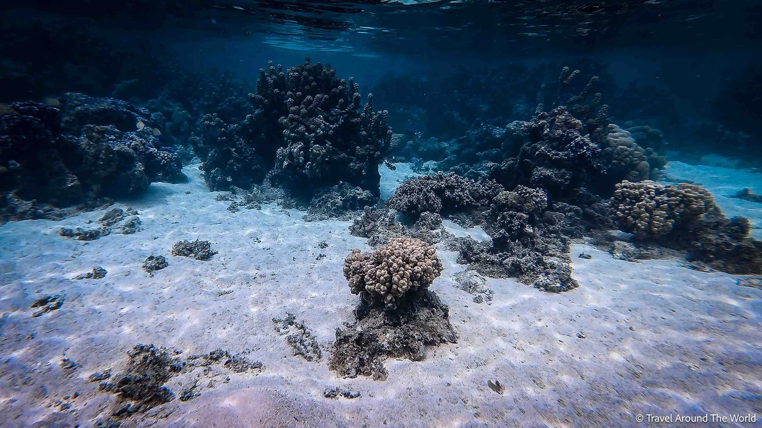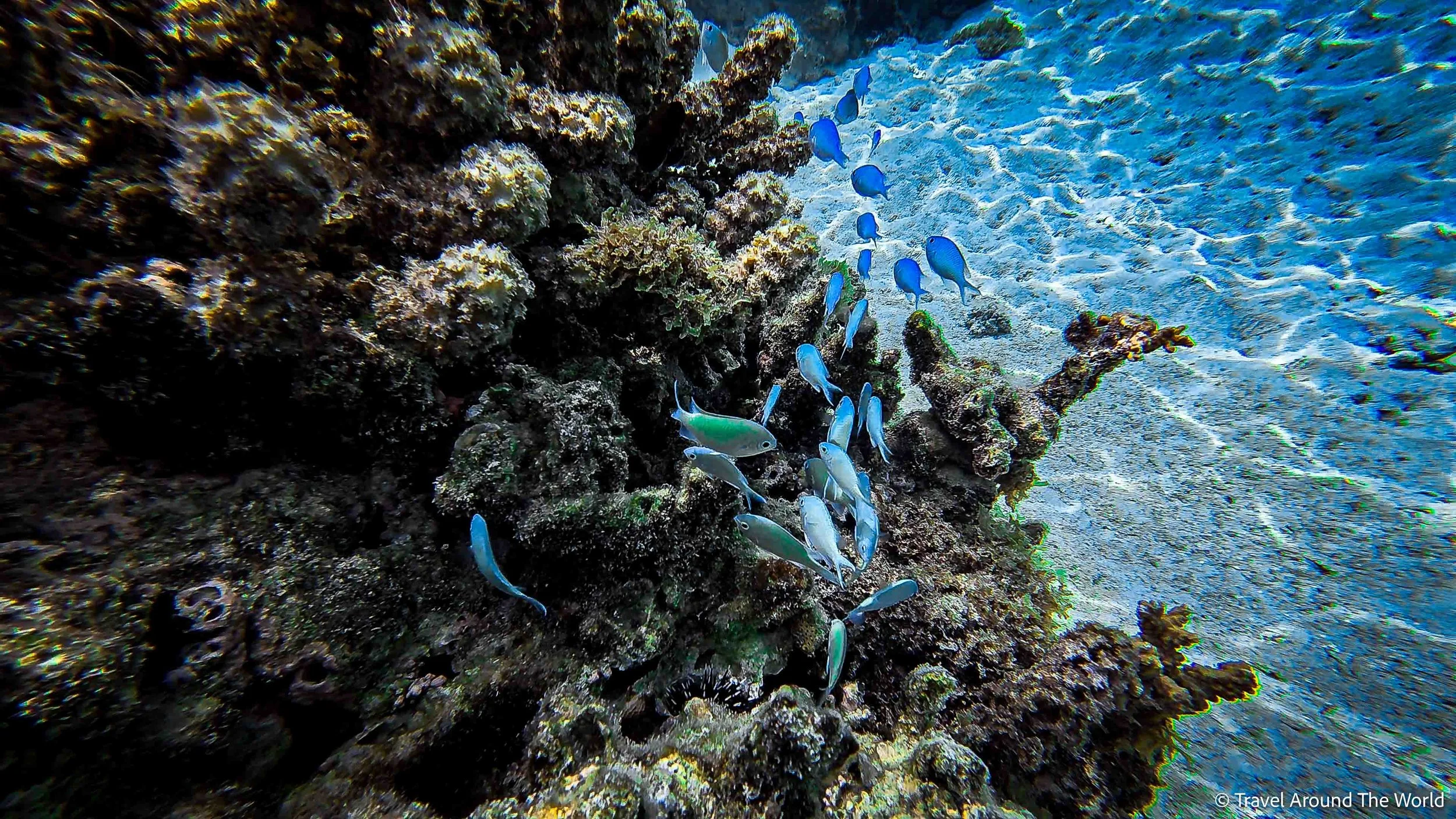 Wir hatten auch die Vorstellung, dass wir dieses «Aquarium-Feeling» direkt vom Strand unserer Hotels erleben können. Auch das ist nicht der Fall (zumindest bei vielen Hotelanlagen nicht). Je nachdem befinden sich zwar einige Korallenblöcke auf dem Hotelareal, aber wirklich was Buntes oder Eindrückliches haben wir hier nicht entdecken können. Umso wichtiger ist es deshalb, dass solche Touren gebucht werden. Denn wer sich nur kurz von der Strandliege für einen kurzen «Schwumm» ins Meer bewegt und sich danach den Rest des Tages auf der Liege sonnt, der wird von der magischen Unterwasserwelt nicht viel mitbekommen. Zu dieser Erkenntnis sind wir schnell gekommen. So ist aus unserem ursprünglichen Plan von unseren «Ferien vor dem Reisen» und damit verbunden einem «Entspannen in der Südsee» (lies dazu auch unseren vorherigen Blogeintrag) nicht ganz so viel geworden. Es wäre einfach Jammerschade gewesen, wenn wir all diese Erlebnisse zugunsten von Erholung nicht hätten machen können. In unseren Augen war es eine Zeit des «aktiven Entschleunigens», denn obwohl wir oft unterwegs waren, war den Rhythmus dennoch ein anderer. Wir mussten uns lediglich rechtzeitig am Treffpunkt einfinden, die restliche Planung und Organisation liegt dann in den Händen der Guides. Nie hatten wir das Gefühl, durch die Gegend zu hetzen. Sobald man im Wasser ist, bleibt die Zeit stehen – in dieser völlig anderen Welt vergisst man alles um sich herum.