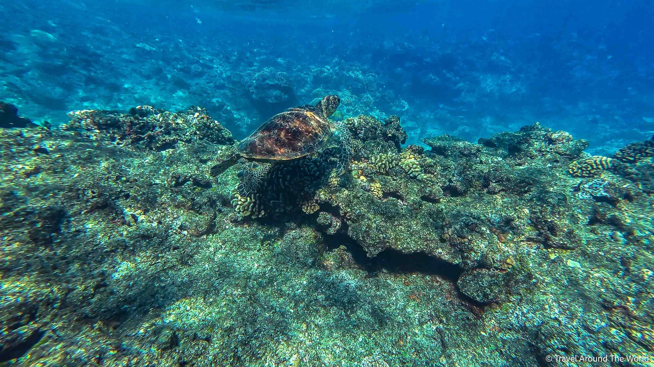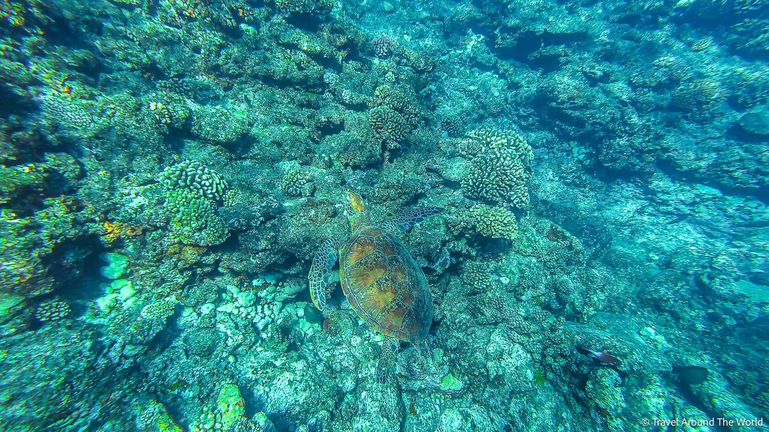 Generell dürfen wir uns wirklich nicht beklagen, wir haben auf Französisch-Polynesien so viele besondere Tierbegegnungen machen dürfen. Ganz hoch oben auf unserer Highlight-Liste steht ein bestimmter Ort vor Tahiti, wo sich zahlreiche Schildkröten aufhalten. Unsere Guides zeigen uns eine Schildkröte nach der anderen. Obwohl diese Tiere auch nicht sonderlich klein sind, sehen wir sie manchmal fast nicht, weil sich ihr Panzer farblich perfekt an die Korallen anpasst. Sobald wir eine Schildkröte gesichtet haben, möchten wir sie genau betrachten: