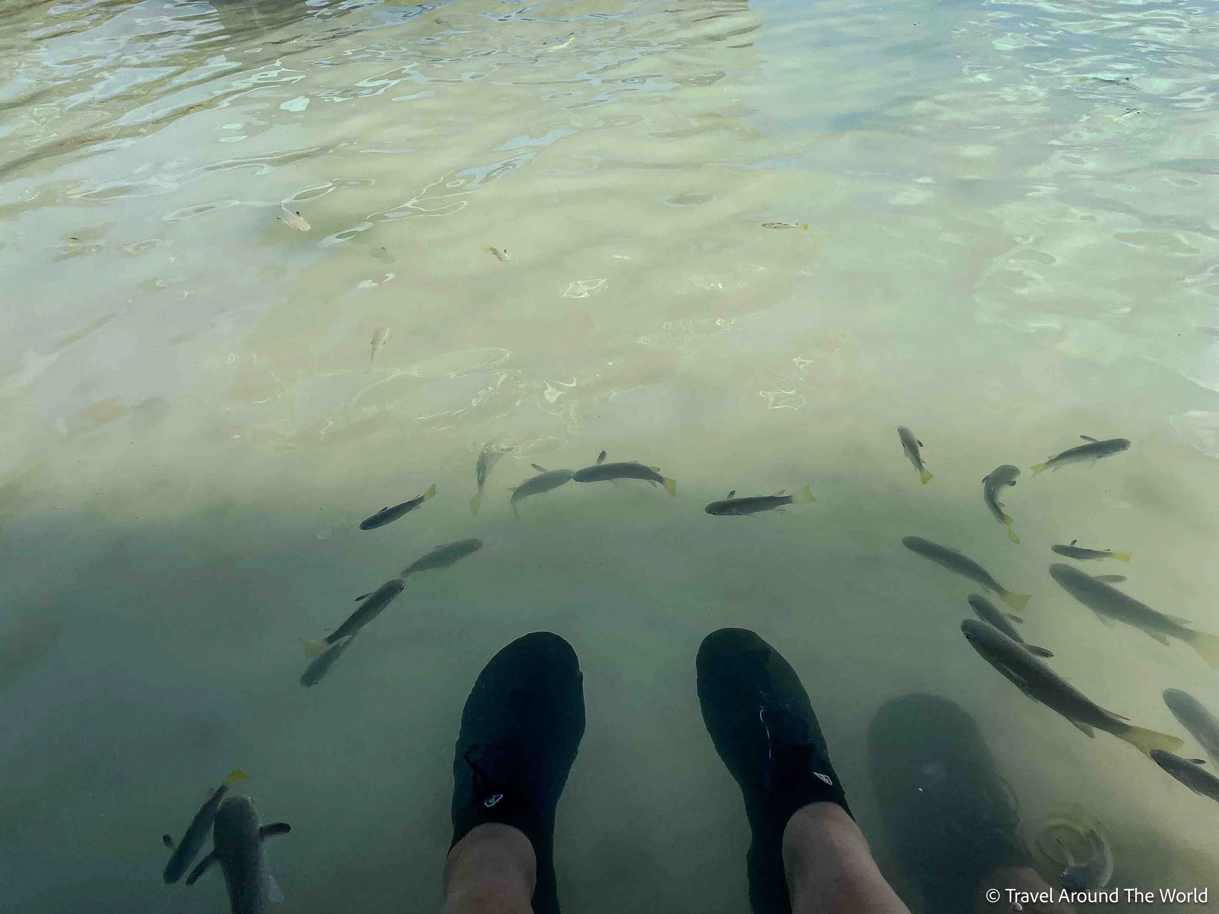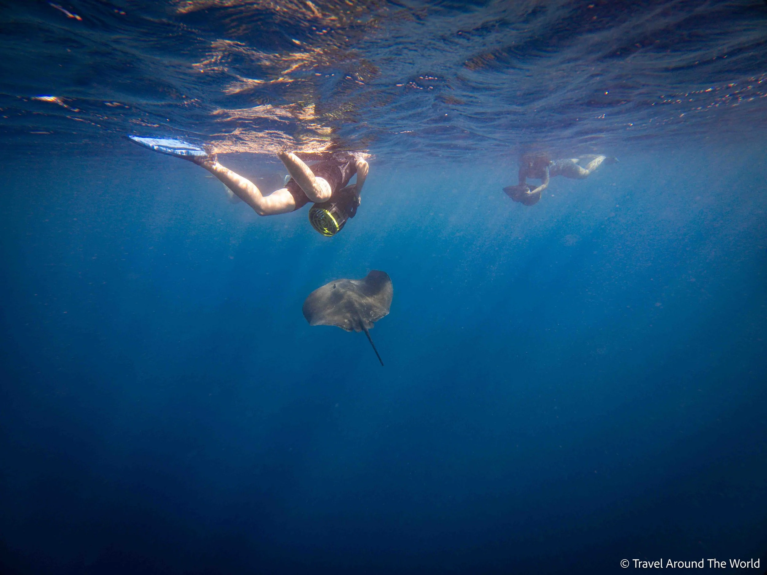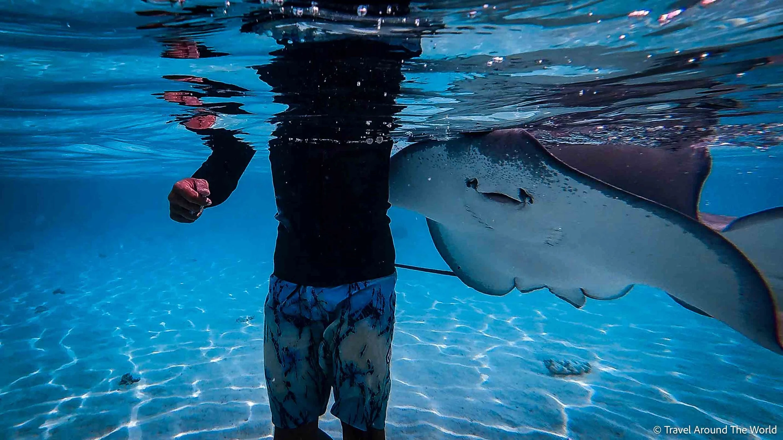 Dank guter Instruktion und Begleitung von erfahrenen Guides ist der Besuch einer Lagune mit diesen beiden Tierarten allerdings unbedenklich. Sie sind sich den Touristentrubel auch durchaus gewohnt und sehr tolerant. Wir sind total fasziniert von diesen Tieren – kaum hält man den Kopf unter Wasser, schon sieht man irgendwo einen Hai oder einen Rochen vorbeiziehen und das mit einer Ruhe und Gelassenheit, die erstaunt. Sind wir doch eher ein bisschen aufgeregt und aus dem Häuschen, wenn plötzlich nur einen Meter neben dir, ein Hai seelenruhig an dir vorbeischwimmt.
