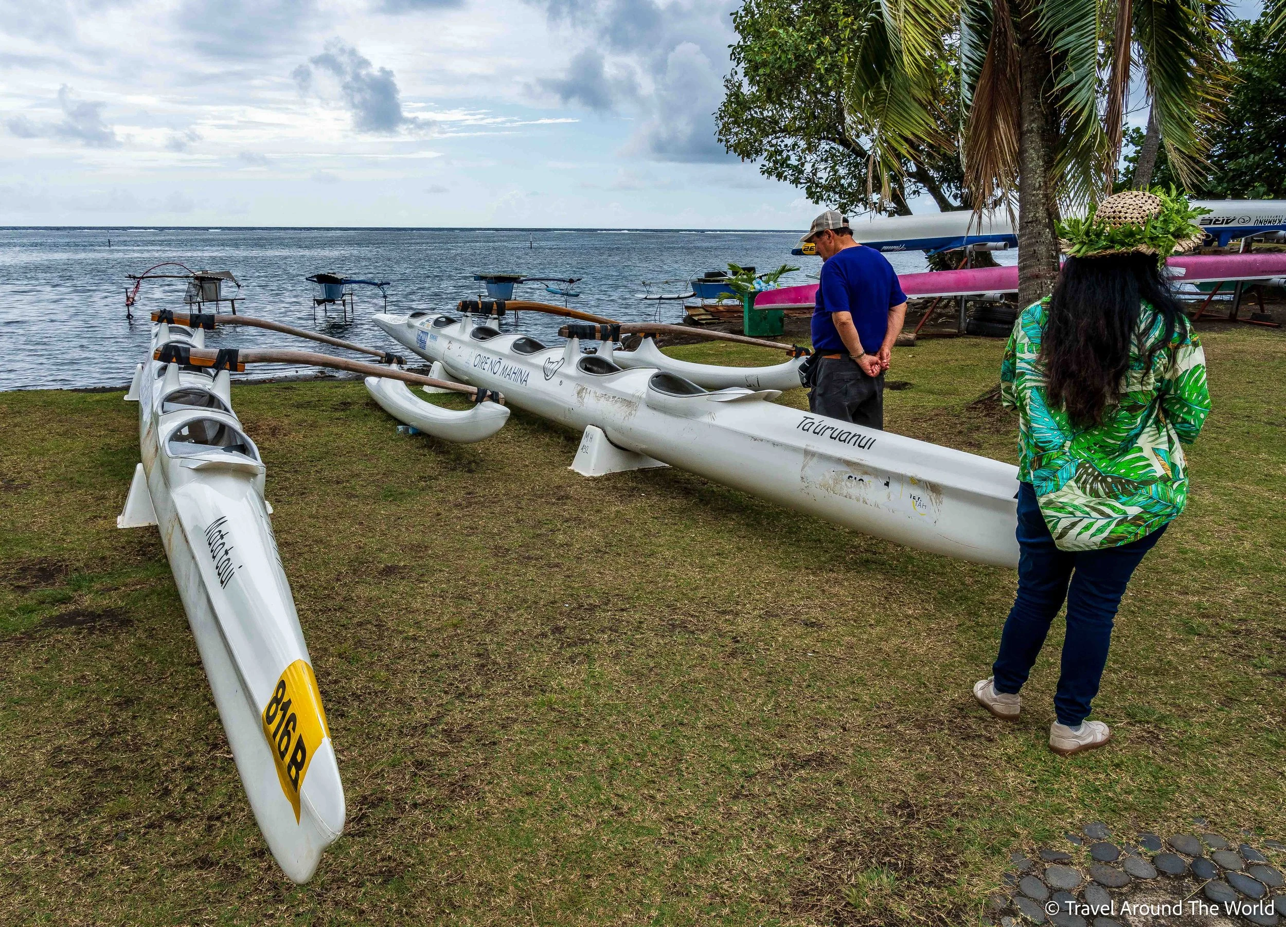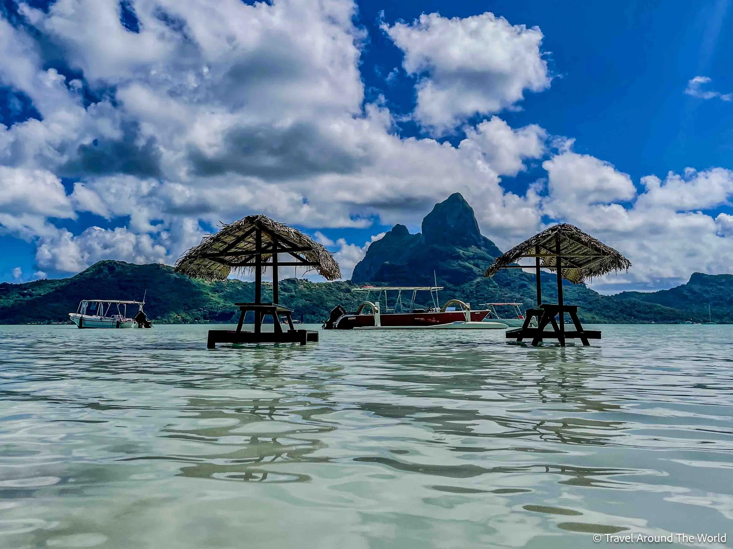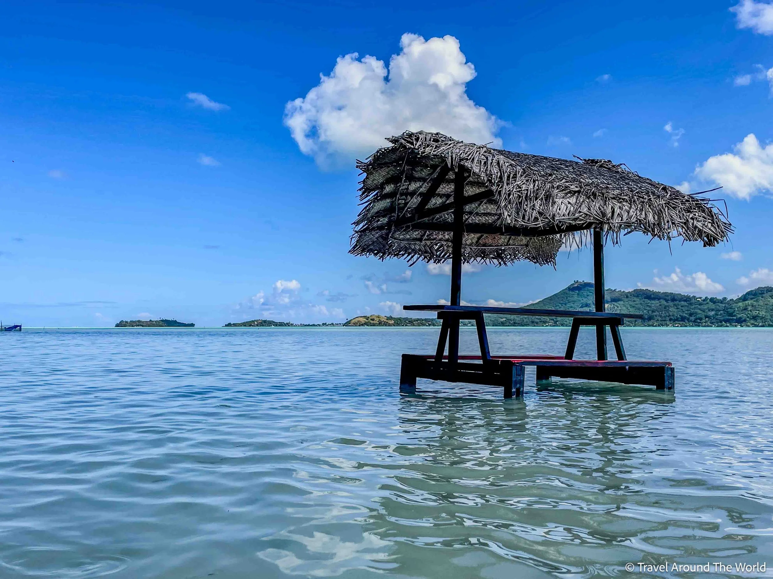 Ständig aufs Meer schauen, nach Tieren Ausschau halten, schnorcheln – das macht hungrig. Viele Ausflüge werden deshalb mit zwei Optionen angeboten: «nur Ausflug» oder «Ausflug mit Mittagessen». Wir entscheiden uns – nicht zuletzt aus Kostengründen – meistens für die Variante ohne Mittagessen. Einmal jedoch wollen wir uns ein typisches Essen auf einem «Motu» (einem kleinen, flachen Inselchen) nicht entgehen lassen. Und es lohnt sich! Als wir ankommen, ist das Buffet bereits angerichtet. Mit einem Teller voller lokaler Köstlichkeiten suchen wir uns einen Tisch. Ein Tisch unter Palmen am feinen Sandstrand? Langweilig! Wir setzen uns lieber an einen Tisch, der direkt im seichten Wasser steht. Genüsslich verzehren wir unser Mittagessen und werden dabei von ebenso hungrigen Fischen umringt. Sie drängen sich in Scharen um unsere Füsse und hoffen, dass ein paar Leckerbissen vom Tisch runterfallen. Jaaa, wir wissen es, man sollte wilde Tiere nicht füttern, aber hier ist uns dann leider doch ab und zu «versehentlich» mal ein wenig Reis ins Wasser gefallen.