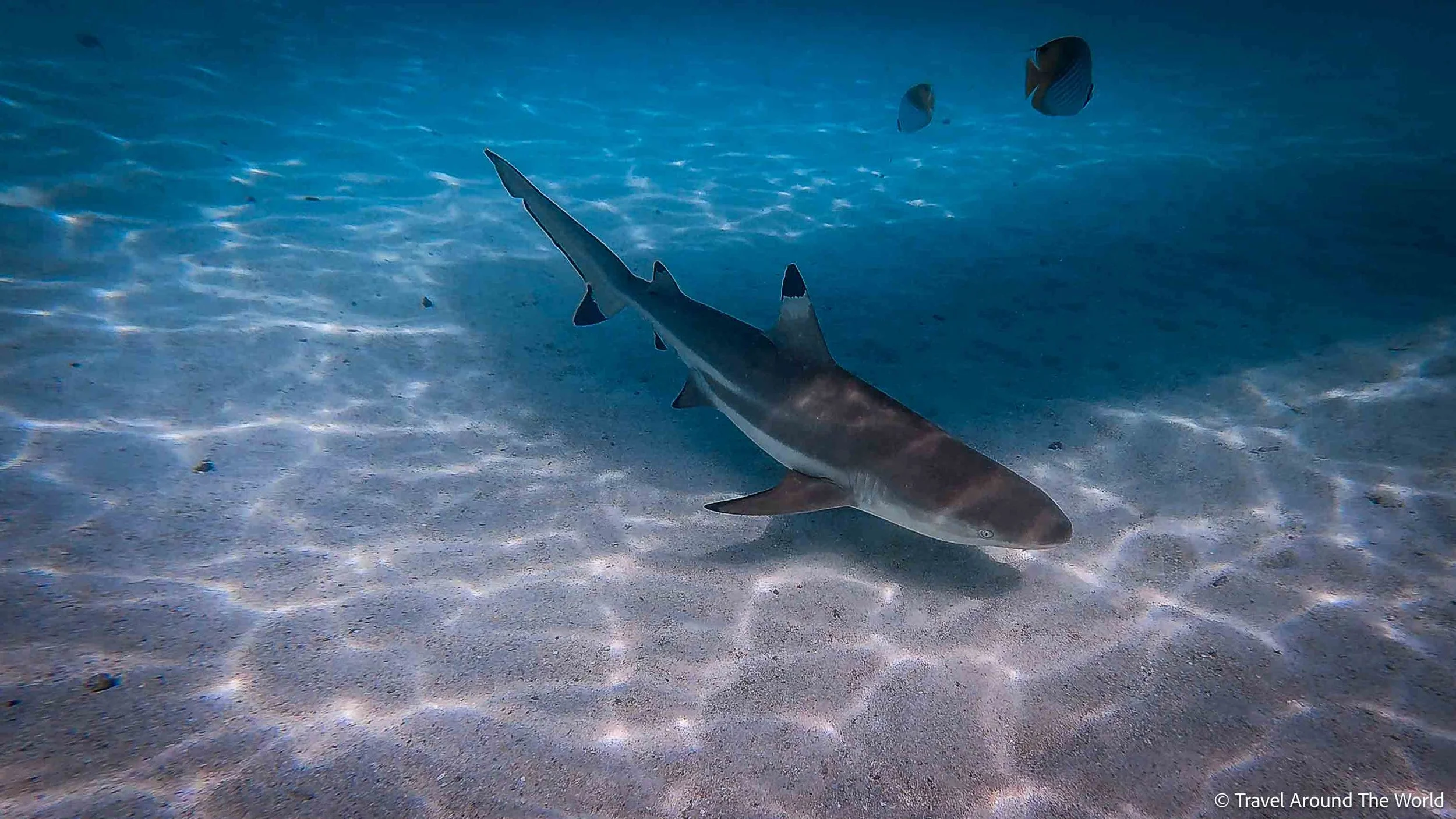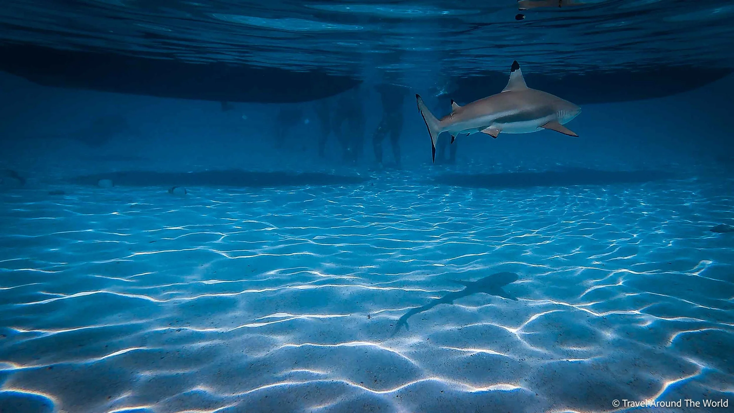 In seichten Lagunen stehend, können wir auf Tuchfühlung mit Stachelrochen gehen. Die neugierigen, freundlichen Wesen kommen – wenn sie das Gefühl haben, dass du Futter für sie hast – wirklich ganz nah ran. Wie Hundewelpen «springen» sie manchmal an dir hoch und lassen sich sogar von dir streicheln. Ihre Haut ist samtig weich, ganz anders als wir es uns vorgestellt haben. Wenn es ihnen zu viel wird, gleiten sie ruhig wieder davon. Ein bisschen mehr Distanz – was wahrscheinlich im gegenseitigen Interesse liegt – halten die Riffhaie. Zwar kommen auch sie bis auf rund einen Meter an dich heran, doch vom «Streicheln wollen» oder bedrängen dieser Tiere sollte man absehen. Auch wenn sie – wie die Stachelrochen –, friedlich und ruhig durchs Wasser patrouillieren und eine entspannte Atmosphäre herrscht, so sind es doch wilde Tiere, denen man mit Respekt begegnen sollte. Haie haben bekanntlich Zähne – meistens sogar mehrere Zahnreihen – und ja, Haie können beissen, wenn sie sich bedroht fühlen. Genauso, wie Stachelrochen ihren Stachel einsetzen können.