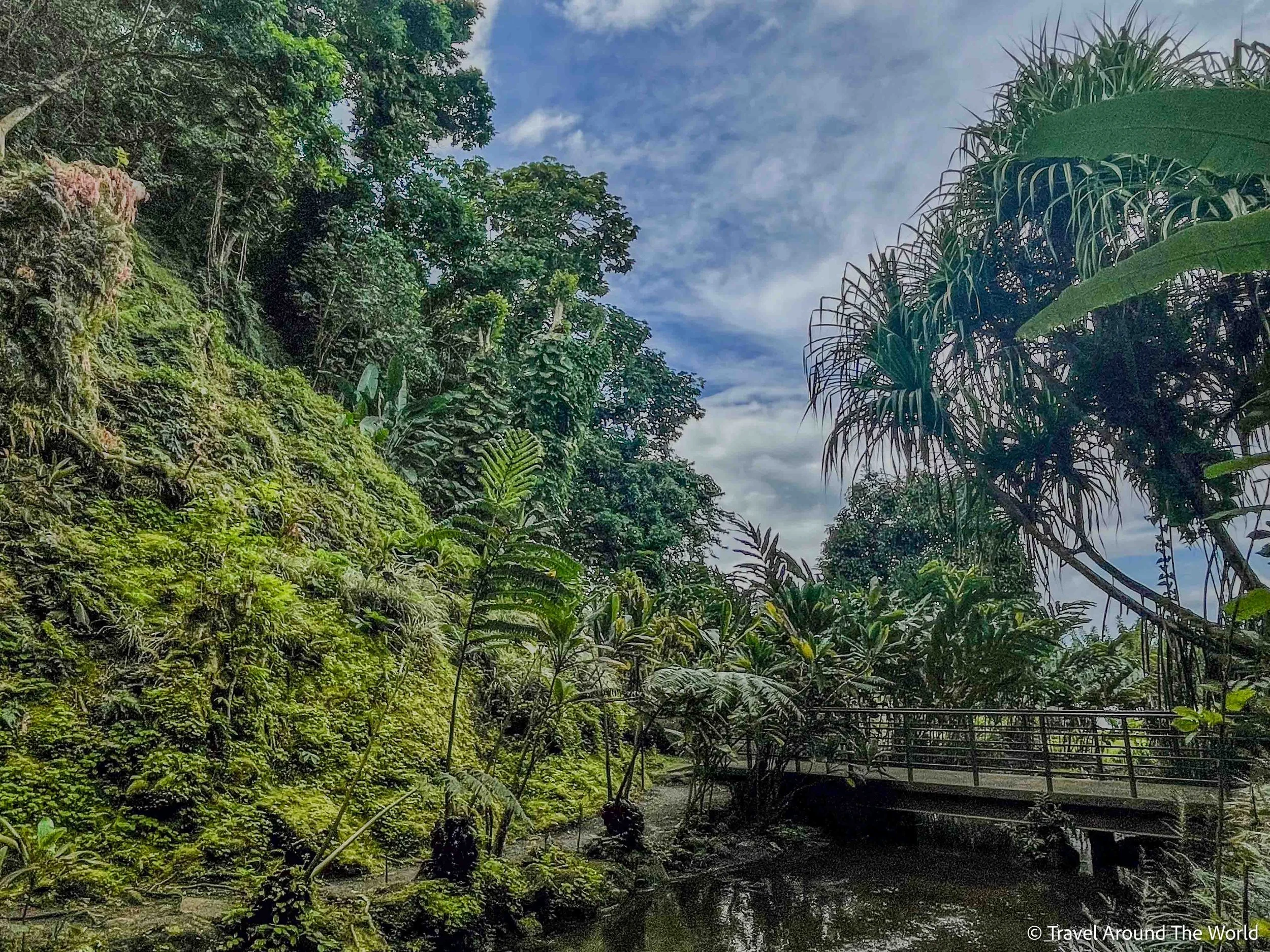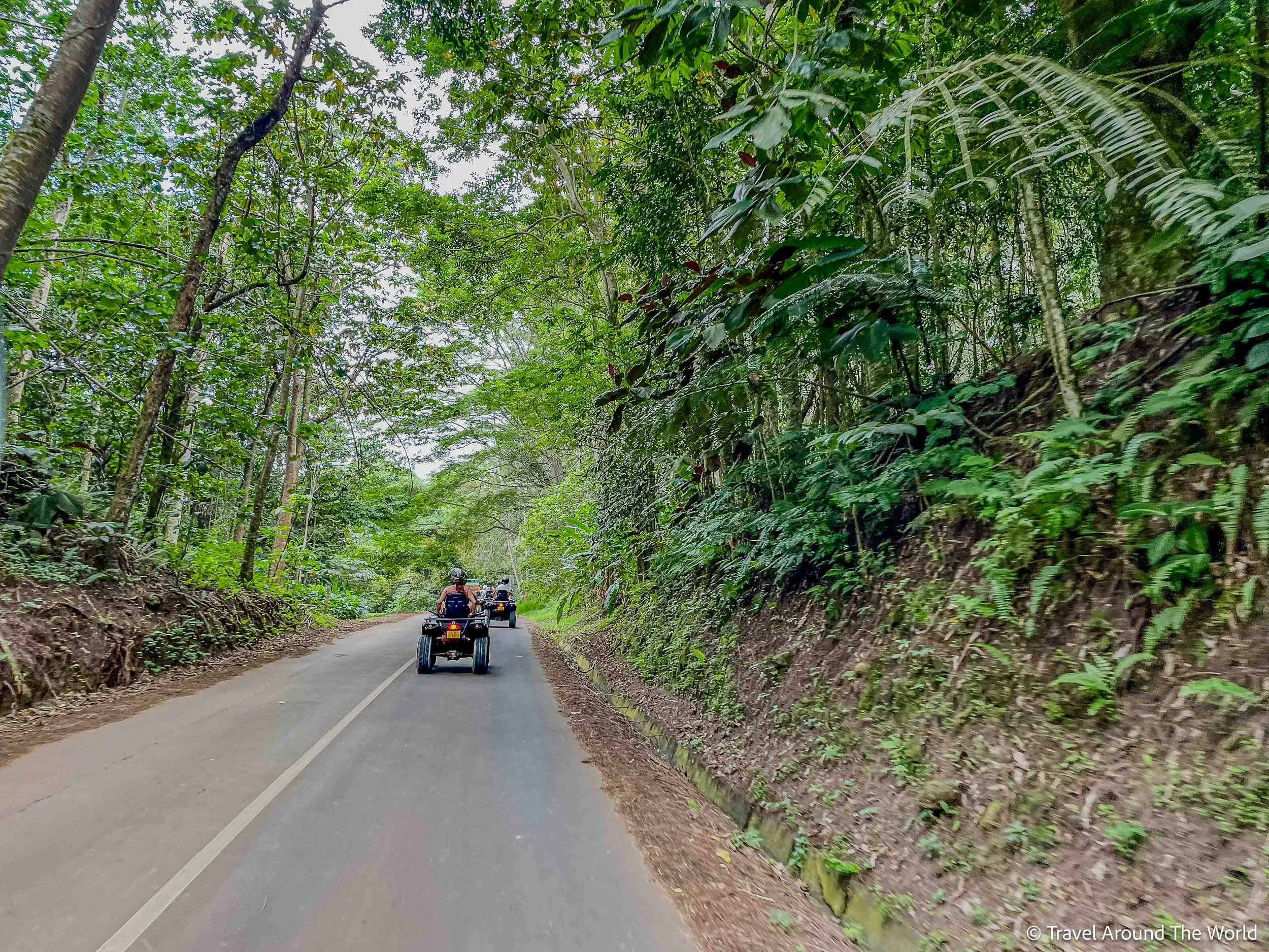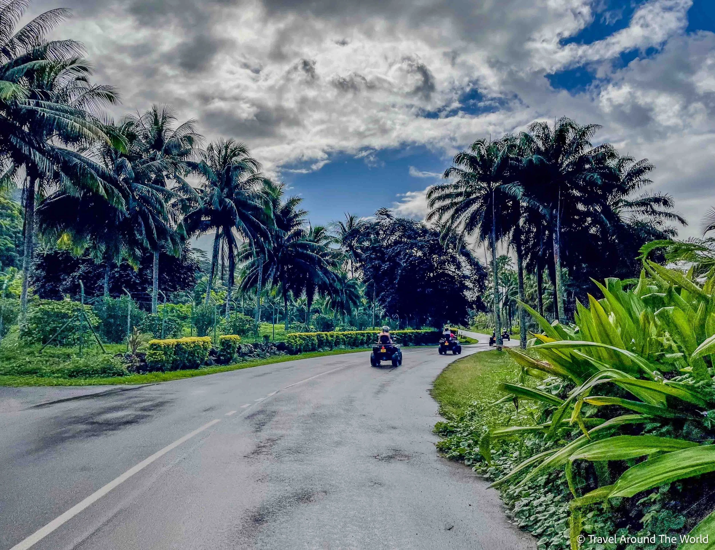 Am Nachmittag geht’s per Quad (ATV) weiter. Nach der rasanten Fahrt auf dem Wasser wirkt diese Tour fast etwas gemütlich. Wir tuckern hintereinander her, fahren auf kurvigen, steilen Strässchen zu unterschiedlichen Aussichtspunkten und bekommen dabei die gesamte Wetterpalette Mooreas zu spüren. Zwischendurch sind wir in den Regenponchos unterwegs und versuchen, uns die Berge durch die Nebel- und Wolkenschwaden vorzustellen, dann wieder zieht es auf, die Sonne zeigt sich und wir können auf das glitzernde Meer hinunterblicken. Der obligate Stopp in einem lokalen Restaurant inklusive Degustation darf natürlich auch nicht fehlen. Wir kosten verschiedene Marmeladen und schlürfen einen leckeren Smoothie aus vielen, frischen Früchten.