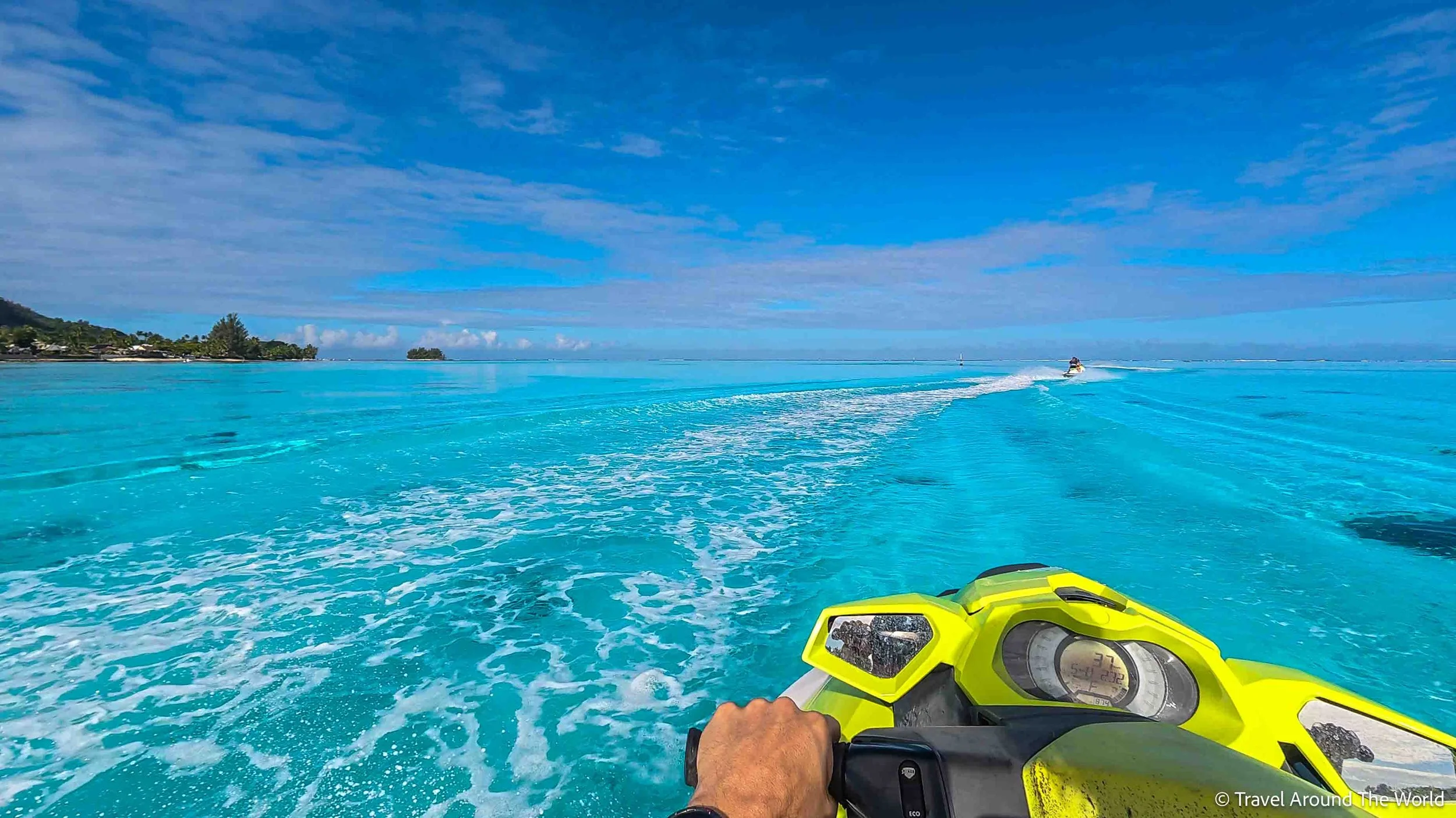 Die Regeln sind schnell erklärt: je schneller du fährst, desto stabiler ist dein Jetski. Etwas gewöhnungsbedürftig ist es schon, wenn man sich mit einem neuen Gefährt vertraut macht und dies gleich im «Vollgas-Modus» tun soll. Mit bis zu 70 km/h bretterten wir hinter unserem Guide her, immer darauf bedacht, in seiner Fahrspur zu bleiben. Er kennt sich hier top aus, kennt jede Untiefe. Am besten ist es demnach, wenn man mit seiner Geschwindigkeit mithalten kann. Wir überwinden uns also und ziehen mit – entgegen unserem Naturell, bei einer neuen, unbekannten Aktivität zuerst langsam und vorsichtig zu agieren. Während sich der Fahrer voller Konzentration in seinen/ihren eben erst erlernten Jetski-Fertigkeiten übt, bleibt dem Sozius Zeit, sich umzusehen. Im Innern des Riffs ist das Wasser flach und die Fahrt somit angenehm und sanft. Staunend lässt man die Umgebung auf sich wirken: Linkerhand ziehen die üppig bewachsenen, grünen Hänge der Insel vorbei, wir selbst bewegen uns auf kristallklarem Wasser fort, so klar, dass man vielerorts bis auf den Grund sieht. Die Farben wechseln je nach Wassertiefe von dunkelblau bis türkis. Rechterhand nur Wasser, soweit das Auge reicht. Verlässt man die vom Riff geschützten Gewässer, ist man auf dem offenen Ozean… Nach einer «Schnorchelpause» in der Lagune, machten wir uns auf zu einem beliebten Surf-Spot, wo sich nebst Surfern auch gerne Delfine aufhalten. Dieses Mal treffen wir allerdings nur auf Surfer. Der Guide fragt unsere Gruppe, ob wir «hinter» die Wellenbrecher und über das offene Meer zurückfahren möchten. Wir wollen :-) So schwierig ist Jetski-Fahren nun auch wieder nicht, man kriegt schnell ein Gespür dafür – dachten wir! Auf der spiegelglatten Lagune mag das auch zutreffen. Ganz anders sieht es aber «dort draussen» aus. Wirklich langsamer – den Bedingungen angepasst – sind wir nicht unterwegs. Noch immer brausen wir mit rund 60 km/h übers Meer. Der Sozius hockt jetzt nicht mehr locker flockig da, schaut in der Gegend rum und knipst noch ein paar Fotos. Eher klammert er/sie sich an den/die Fahrer/in und versucht, den nächsten Aufprall zu antizipieren und so gut wie möglich abzufedern. Der/die Fahrer/in wiederum versucht, die Wellen möglichst optimal zu erwischen, den Jetski stabil und gleichzeitig das Tempo und die Spur des Guides zu halten. Das Herz pumpt, das Adrenalin rauscht – Action pur! Um den Nervenkitzel noch etwas zu erhöhen – vor allem aber, weil Michelle auch mal noch selbst fahren will – machen wir bei einem Stopp im offenen Meer noch einen Fahrerwechsel. Beginnt man normalerweise auf einem Pony am Führstrick, ist sie hier gleich auf’s Rodeo-Pferd aufgestiegen. Etwas erschöpft, aber mit einem breiten Grinsen auf den Gesichtern, treffen wir alle glücklich und unbeschadet wieder beim Ausgangspunkt ein. Was für ein Abenteuer! Schon jetzt steht fest, dass dies nicht unsere letzte Jetski-Tour in unserem Leben bleiben soll.