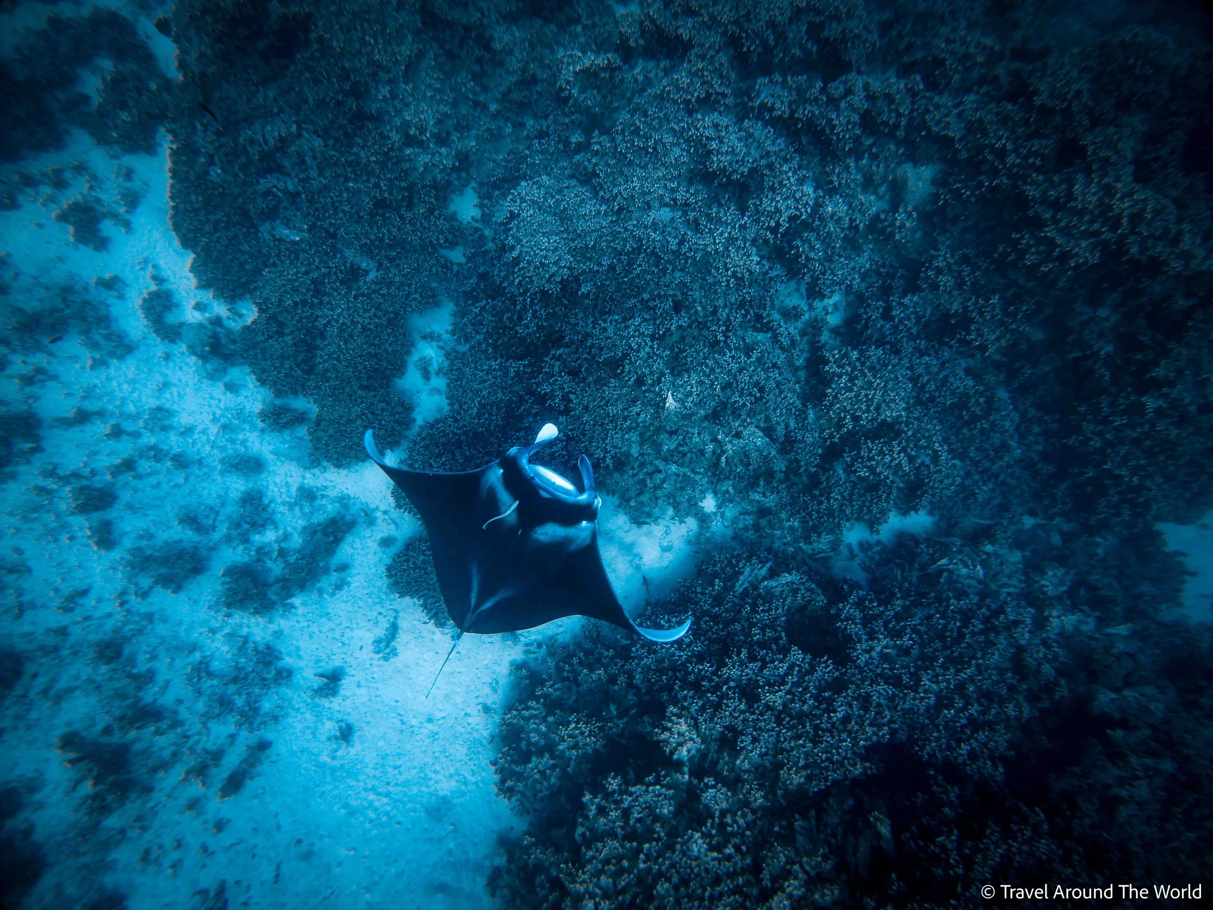 Ein Stopp bei den Riffhaien und Stachelrochen gehört bei praktisch jeder Tour auf Moorea und Bora Bora zum Pflichtprogramm. Weitere Stars der Unterwasserwelt sind die eleganten Manta-Rochen. In den Gewässern um Moorea kommen sie nicht vor, doch auf Bora Bora bietet sich uns die Chance, diese sanften Riesen aus nächster Nähe zu erleben. Sie kommen an bestimmte Orte im Korallenriff, die ihnen als Putzstationen dienen. An diesen Putzstationen schwimmen sie langsam hin und her, um Putzerfischen die Möglichkeit zu geben, sie von Parasiten zu befreien. Mit einer «Flügelspannweite» von bis zu 9 Metern schweben sie unter dir hindurch. Es ist ein unglaubliches Gefühl, ein so grosses Tier in freier Wildbahn beobachten zu dürfen. Ihre Grösse, ihre Schwerelosigkeit, ihre ruhigen Bewegungen und ihr dennoch schnelles Vorankommen erinnern uns an unsere Begegnungen mit Walhaien in West Australien (den dazugehörigen Blogeintrag findest du hier).