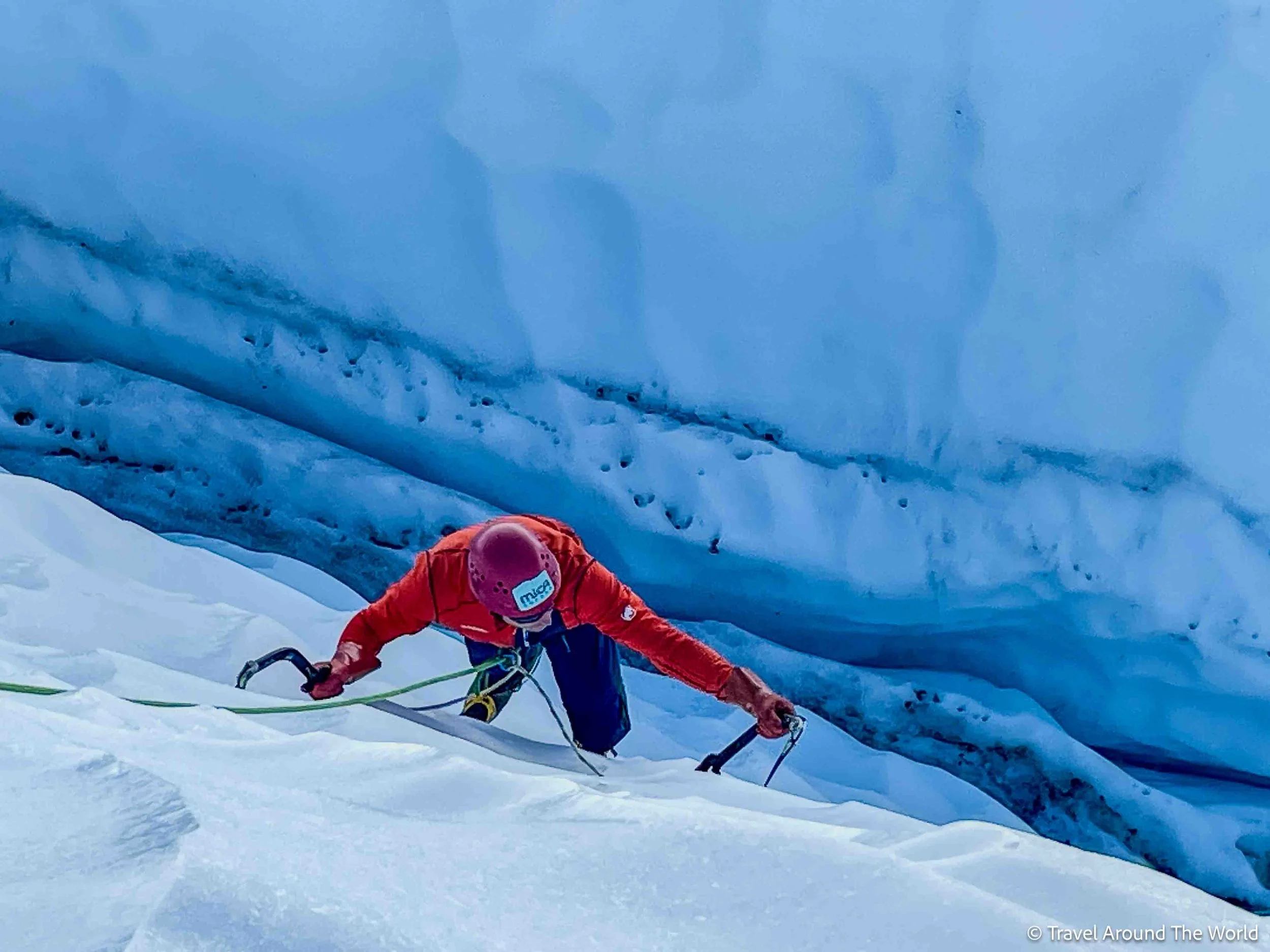 Per Auto rumpeln wir zuerst die unebene Schotterstrasse bis zum Gletscher hinunter. Hier schultern wir unsere Rucksäcke und bestaunen die Gletscherkante, die sich im spiegelglatten Gletschersee spiegelt. Bis zu unserem Klettergebiet ist es noch ein weiter Weg. Wir überqueren ein paar schwimmende Brücken und laufen dann etwa eine Stunde lang über Schutt und Geröll der Gletschermoräne entlang bis wir schliesslich unsere Steigeisen montieren und auf Eis weitergehen. Unser Guide schlägt ein straffes Tempo ein, viel Zeit zum Stehenbleiben und sich umschauen bleibt nicht. Der Fokus ist klar: möglichst viel Zeit zum Klettern haben. Ein guter Plan, denn später bleibt noch genügend Zeit, um die Umgebung aus Schnee und Eis auszukundschaften, da jeweils nur eine Person am Klettern ist, während die übrigen drei «Pause» haben.