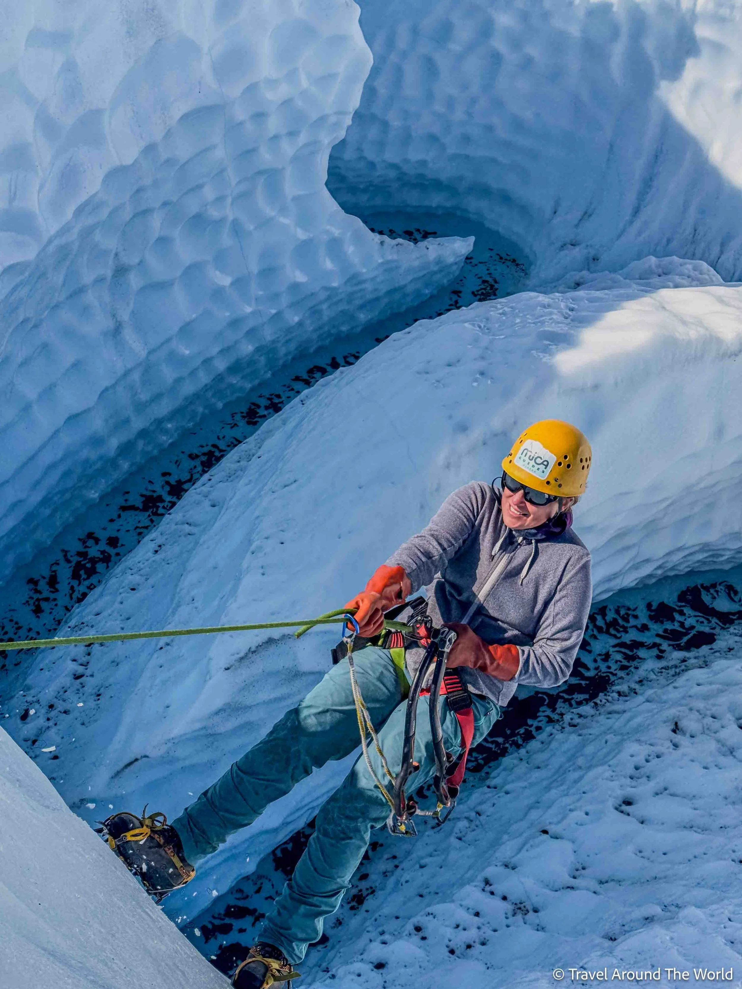 Der zweite Klettergang ist bereits eine Stufe schwieriger: Wir werden zuerst in eine Gletscherspalte abgeseilt, die wir – leicht nach rechts traversierend – queren müssen. Basil macht es wieder vor, pendelt freudig in den Canyon runter und klettert danach wie ein Wiesel wieder zu uns hoch. Michelle hat dieses Mal ihren schwierigen Part – das Abseilen – zuerst hinter sich zu bringen und ist umso erleichterter, als sie «nur» noch hochklettern muss.