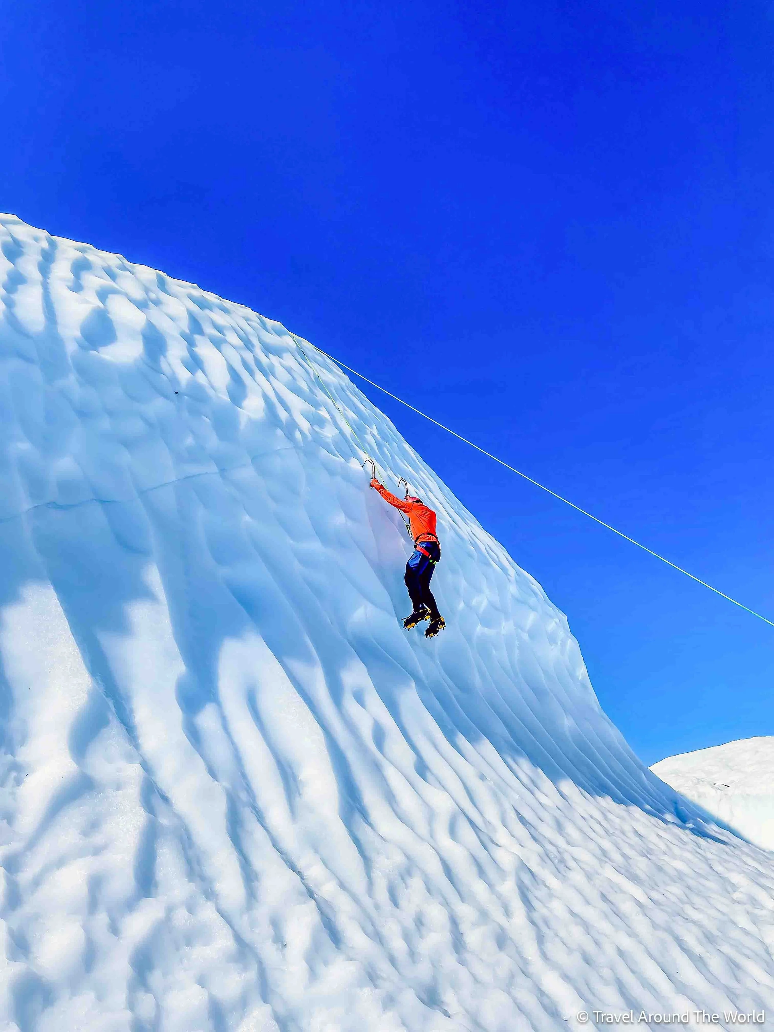 An einer Übungswand trainieren wir die Grundtechniken und merken schnell: Das wird ein Ganzkörpertraining. Müde Glieder und Muskelkater sind vorprogrammiert. Ebenfalls schnell draussen haben wir, dass wir unsere Tritte mit den Eiskrallen und die Schläge mit den Eispickeln besser einmal kräftig und präzise ausüben, anstatt mehrmals «nachzupickeln». Denn genau dies zehrt extrem an den Kräften. Viel wichtiger ist aber die Erkenntnis, dass es uns jetzt schon unglaublich viel Spass macht: Wir sind mitten auf einem Gletscher (mal wieder bei Prachtwetter), wir können etwas komplett Neues ausprobieren und unsere Grenzen neu ausloten.