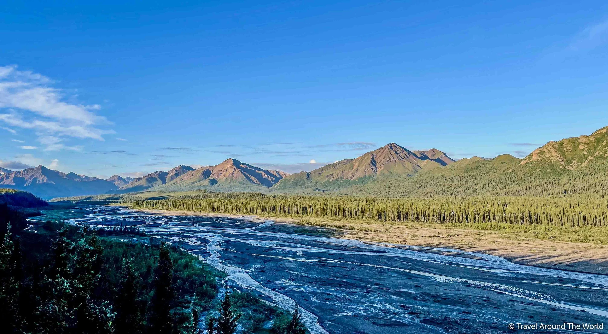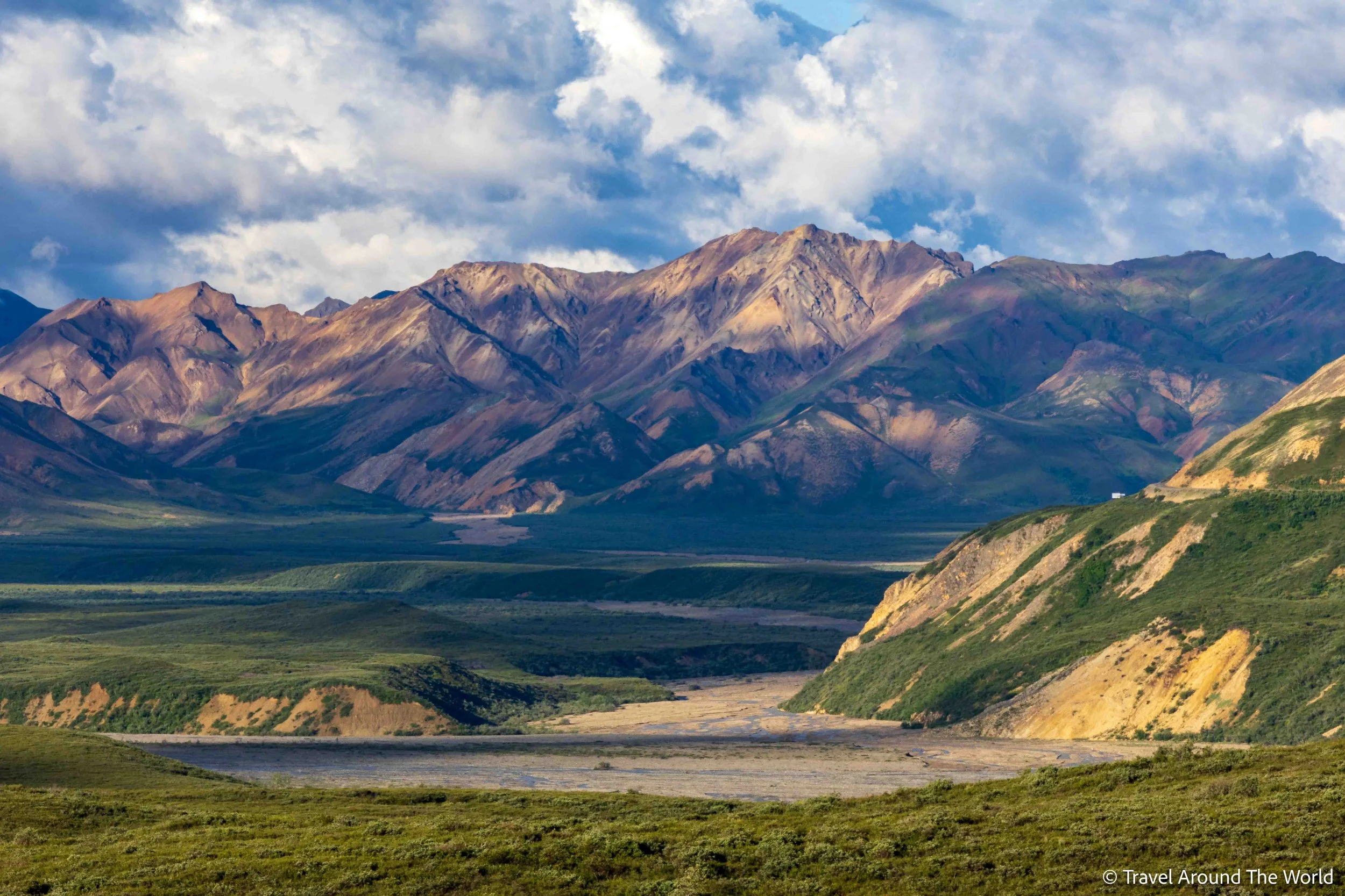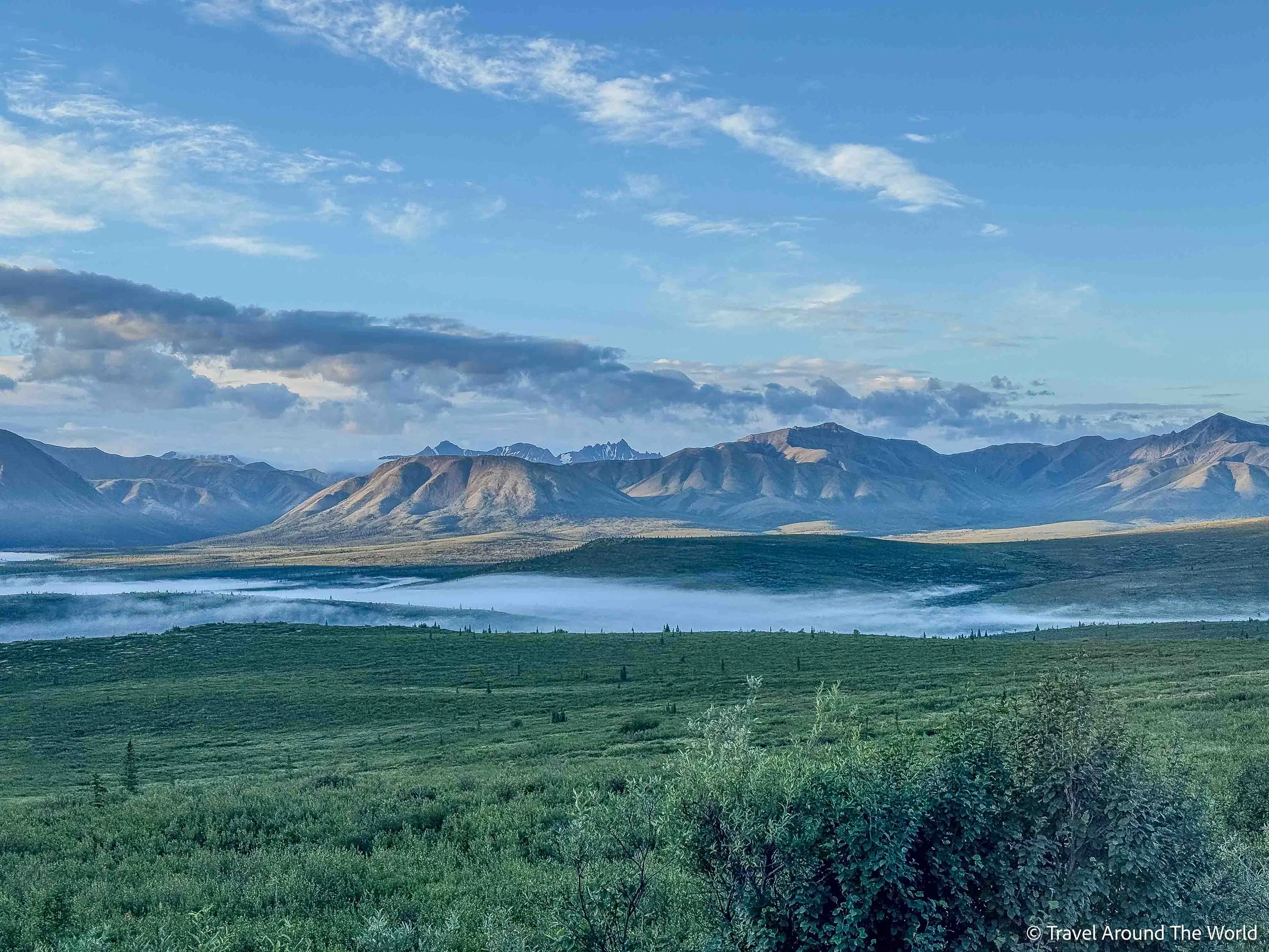 Auch landschaftlich lässt der Park nichts zu wünschen übrig. Sogar wer bloss die Bustour macht, kann mit reinem «aus dem Fenster» schauen, wahnsinnig viel sehen: wie sich langsam das Licht verändert und so im Schatten gelegene Hänge auf dem Rückweg plötzlich in helles Licht getaucht sind. Wie sich der Teklanika River in vielen verästelten Armen seinen Weg durch das dunkle Kiesbett sucht. Wie Berge in verschiedensten Gelb-, Orange- und Ockertönen leuchten oder wie die Wiesen noch taunass in einem umso satteren Grün glänzen. Und auch wenn der Guide uns keine zu grossen Hoffnungen für den Denali gemacht hat, so blicken wir doch immer wieder in die Richtung, wo der Berg eigentlich sein sollte. Seine Prophezeiung bewahrheitet sich – heute bleibt uns die Sicht auf den Denali verwehrt. Doch auch ohne Blick auf den Denali war es ein eindrücklicher Morgen. Mehr Eindrücke vom Denali National Park findest du in dieser Galerie.