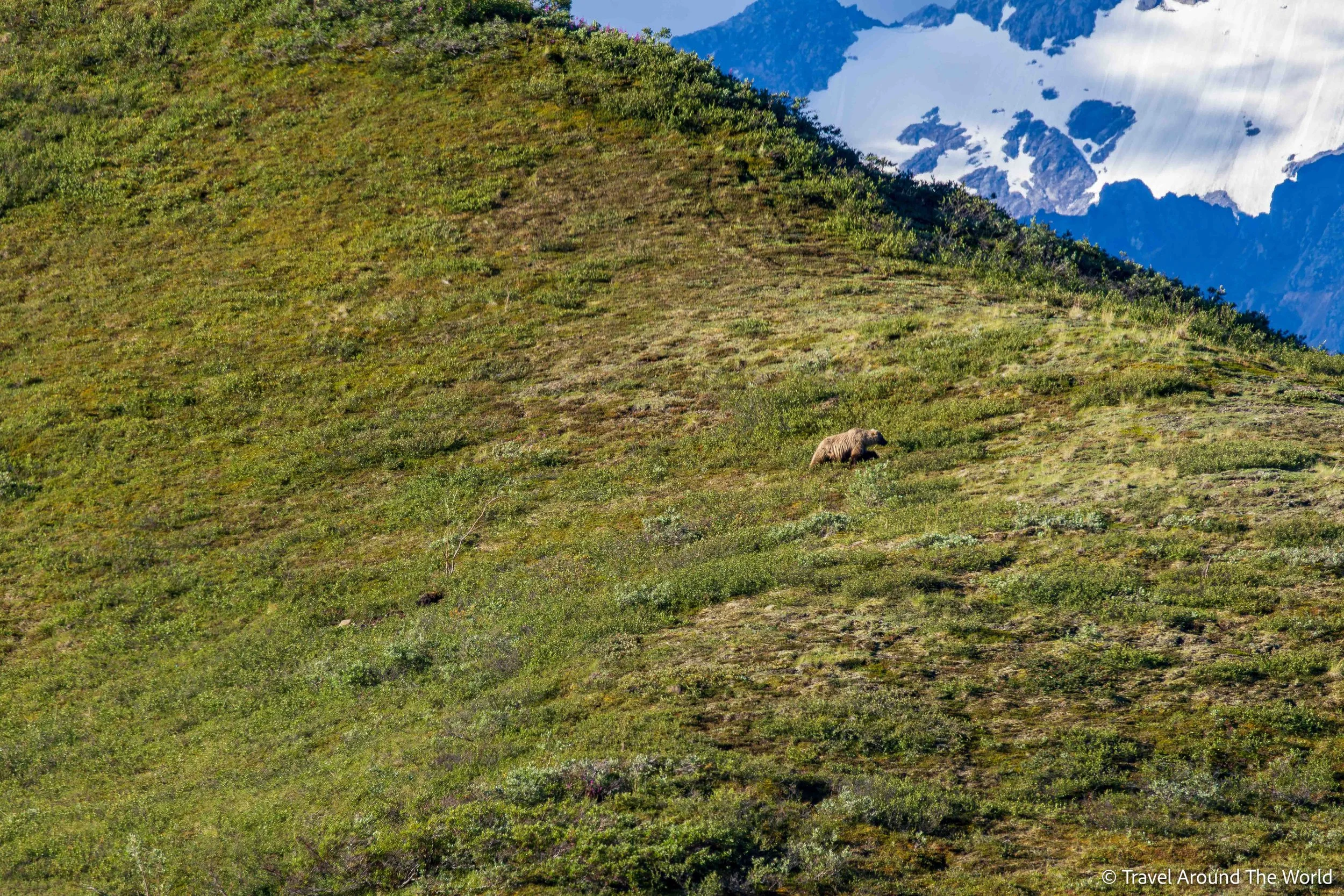 Den Denali National Park möchten wir natürlich auch noch «vom Boden aus» erkunden. Es gibt genau eine Strasse, die in den rund 24'500 km2 grossen Park hineinführt. Man stelle sich das vor: eine einzige Strasse auf einer Fläche, die mehr als halb so gross wie die Schweiz ist! Diese Strasse ist knapp 150 km lang, aufgrund eines Erdrutsches vor ein paar Jahren ist sie jedoch zurzeit nur noch bis knapp zur Hälfte befahrbar. Zudem ist nur ein kurzer Abschnitt für Privatfahrzeuge geöffnet: Für Erkundungen, die weiter als die ersten 24 km in den Park hineinführen, muss auf das parkeigene Shuttlesystem zurückgegriffen werden. So buchen auch wir die beliebte «Tundra Wilderness»-Bustour, wo wir uns in gut fünf Stunden bis zum Erdrutsch und wieder zurück kutschieren lassen. Wir machen uns die langen Tage zunutze und wollen die Ruhe der frühen Morgenstunden geniessen. Um zehn vor Fünf stehen wir beim Treffpunkt – einem Hotel für Kreuzfahrttouristen – bereit. Wie gewünscht 15 bis 20 Minuten vor Abfahrt. Obwohl es noch so früh ist, ist bereits viel los. Was wir (und viele andere) nicht wissen: wir sind nicht auf dem ersten Bus, sondern erst auf dem zweiten oder gar dritten, da vorher noch «Kreuzfahrt-Busse» starten. Wir stehen somit ein paar Mal in der falschen Schlange. Tatsächlich kommt unser Bus dann wirklich erst genau um 5:10 Uhr an – die 20 Minuten früher und das Anstehen in den falschen Schlangen hätten wir uns sparen können.