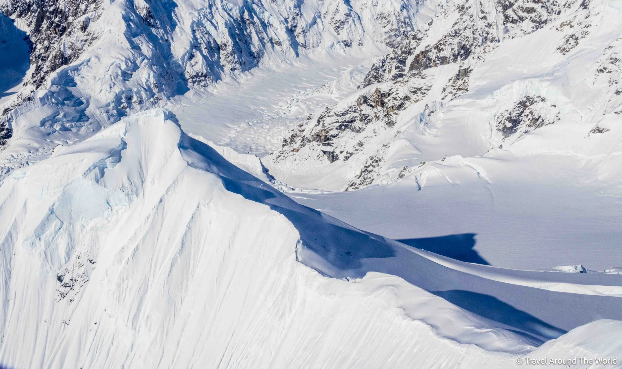 Allzu viel erwarten wir von ihm nicht. Er soll uns einfach heil wieder runterbringen. Es ist okay, wenn er sich bloss aufs Fliegen konzentriert und uns nicht noch mit einem durchgängigen Live-Kommentar beglückt. Wir beruhigen uns damit, dass er diese Route vermutlich schon hundertfach geflogen ist. Wie auch beim Eisklettern geben wir also die Kontrolle ab. Kurz darauf sind wir in der Luft, der Start hat schon mal einwandfrei geklappt. Der Kanadier, der auf dem Co-Piloten-Sitz Platz nehmen durfte, fragt – sicher nicht ganz ohne Hintergedanken – ob er denn schon lange Pilot sei und diese Route schon oft geflogen habe. Der Pilot bestätigt, dass er schon einige Jahre fliegt und diese Route bestens kennt. Das Wetter scheint uns keine Schwierigkeiten zu machen, für ihn also ein Kinderspiel. Während des gesamten Flugs ruckelt das Flugzeug kein einziges Mal. Besonders lehrreich ist der Flug nicht, aber wie gesagt – wir sind zufrieden, solange alles glatt läuft. Schon bald vergessen wir den Piloten komplett. Wir erreichen schnell die Berge und sind von einer imposanten Bergwelt umgeben. Manche Bergflanken so steil, dass kein Schnee an ihnen haften bleibt. Nur eine dünne Reifschicht überzieht sie nach einer kalten Nacht. Andere wiederum sind von einer dicken Schneeschicht überzogen. Gigantische Gletscher bahnen sich einen Weg durch die Täler oder hängen oben in den Gipfeln und überziehen teilweise ganze Berghänge. Licht und Schatten hinterlassen ein faszinierendes Spiel. Schnee- und Eisformationen bilden abstrakte Gemälde. Teilweise fliegen wir so tief, dass wir zwischen den Bergen hindurchfliegen und die Gipfel über uns in den Himmel ragen. Wir wissen nicht, wo wir hinschauen sollen. Michelle hat den Platz ganz hinten – auf einer 1½er-Sitzbank erhalten. Sie kann das Panorama sogar aus beiden Fenstern bestaunen, immer wieder wechselt sie von einem Fenster zum anderen. Der Flug ist absolut spektakulär!