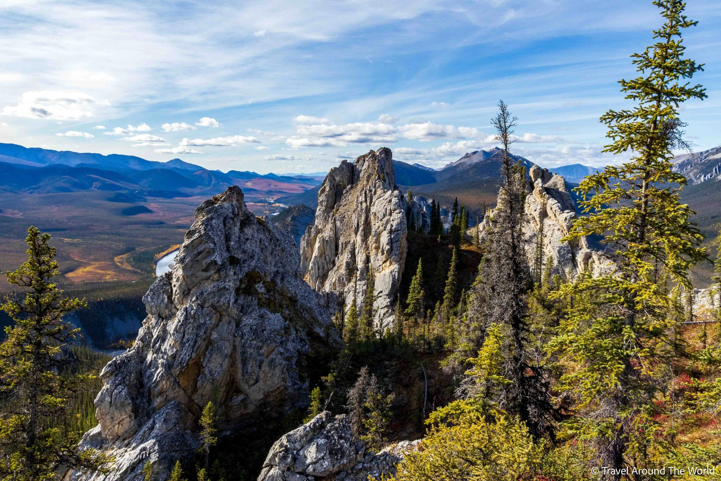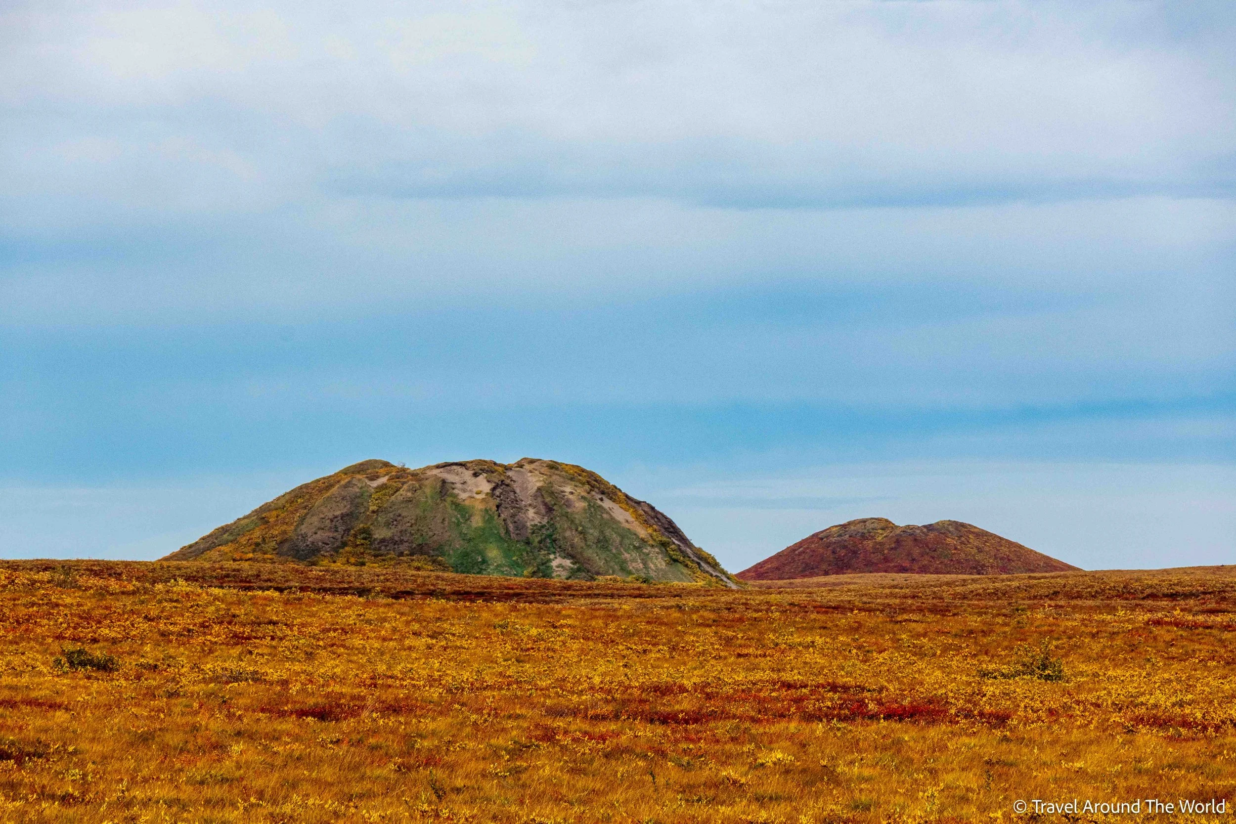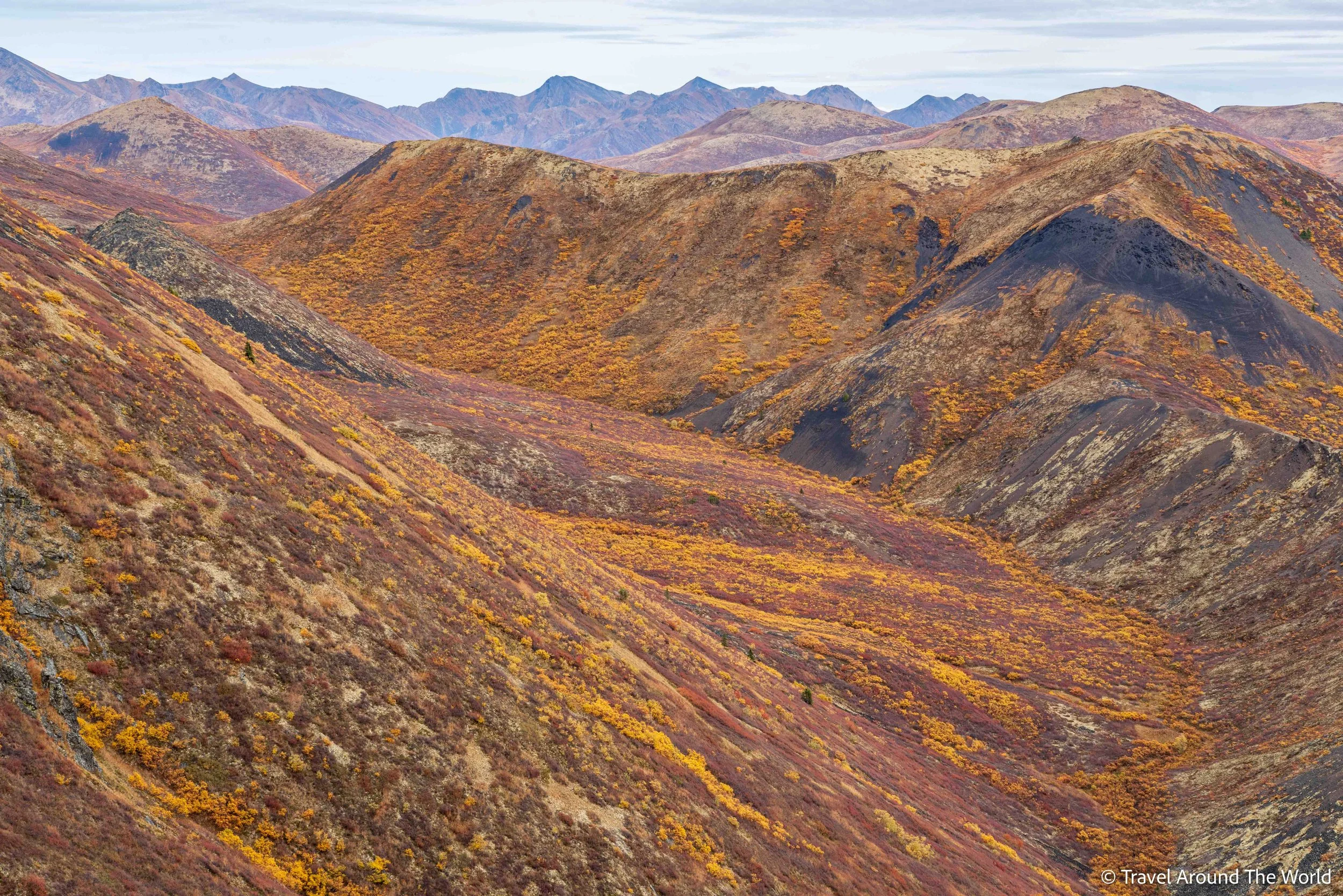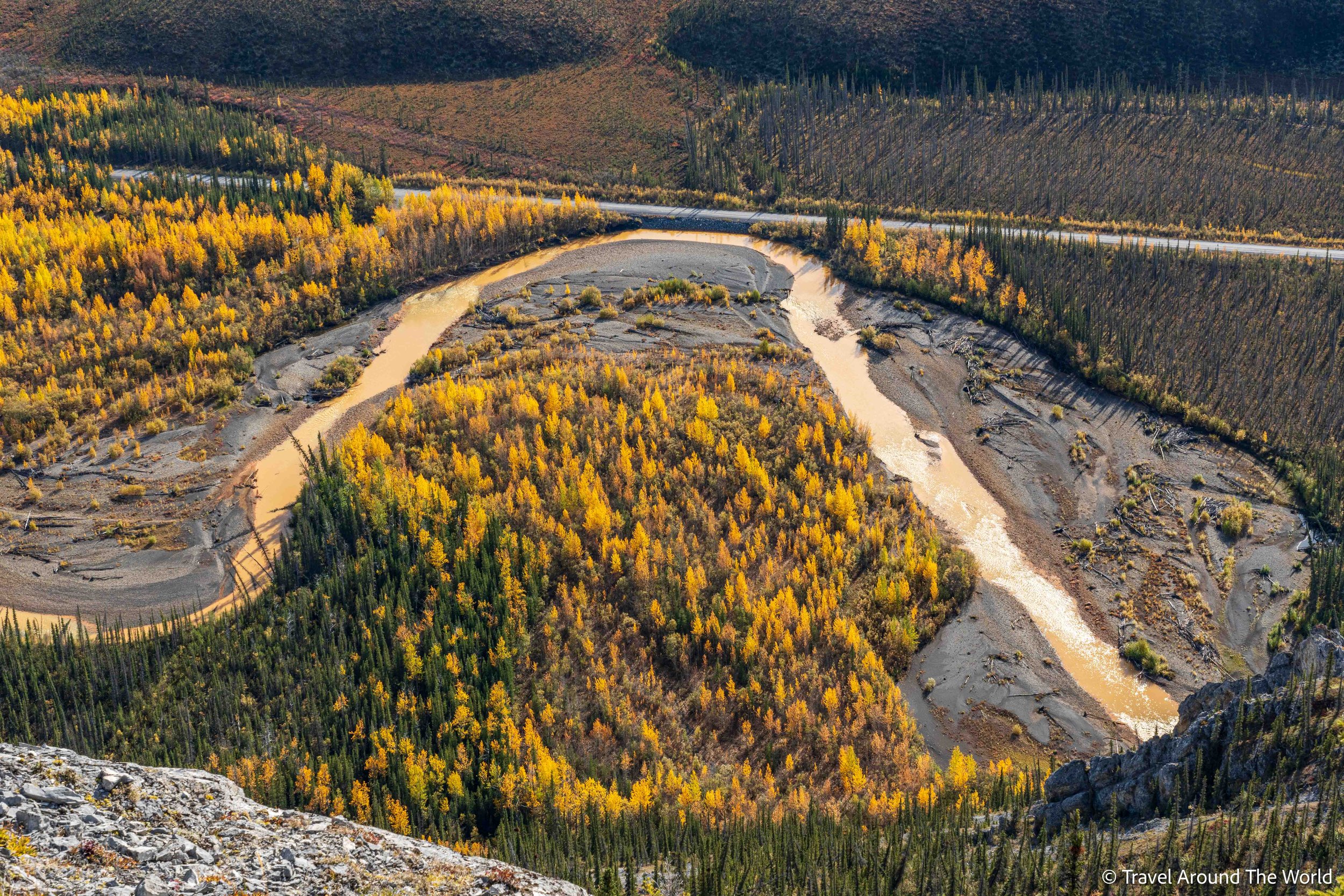 Ein bisschen paradox ist es schon: Der Dempster Highway führt einen tagelang durch die Wildnis. Trotzdem gibt es kaum Wandermöglichkeiten. Natürlich könnte man einfach querfeldein losmarschieren, aber ganz so einfach ist das in der buschigen Tundralandschaft dann doch wieder nicht. Offizielle Wanderwege gibt es praktisch nur im Tombstone Territorial Park. Nach den vielen Stunden und Tagen mit wenig Bewegung sind wir dankbar, als wir auf dem Rückweg einigermassen gutes Wanderwetter erwischen und die Gegend doch noch zu Fuss erkunden können. Auf dem Sapper Hill Trail gewinnen wir in kurzer Zeit an Höhe und können schon bald aus der Vogelperspektive auf den Dempster Highway und den mäandernden Fluss hinunterblicken. Es ist faszinierend, wie stark sich in den wenigen Tagen, die zwischen Hin- und Rückfahrt liegen, die Farben verändert haben. Der Herbst scheint nochmals viel weiter fortgeschritten zu sein. Lange wird es nicht mehr dauern, bis die Landschaft unter einer dicken Schneeschicht begraben wird. Der Dempster bleibt trotzdem befahrbar – im Winter führen sogar Eisstrassen über die zugefrorenen Flüsse.