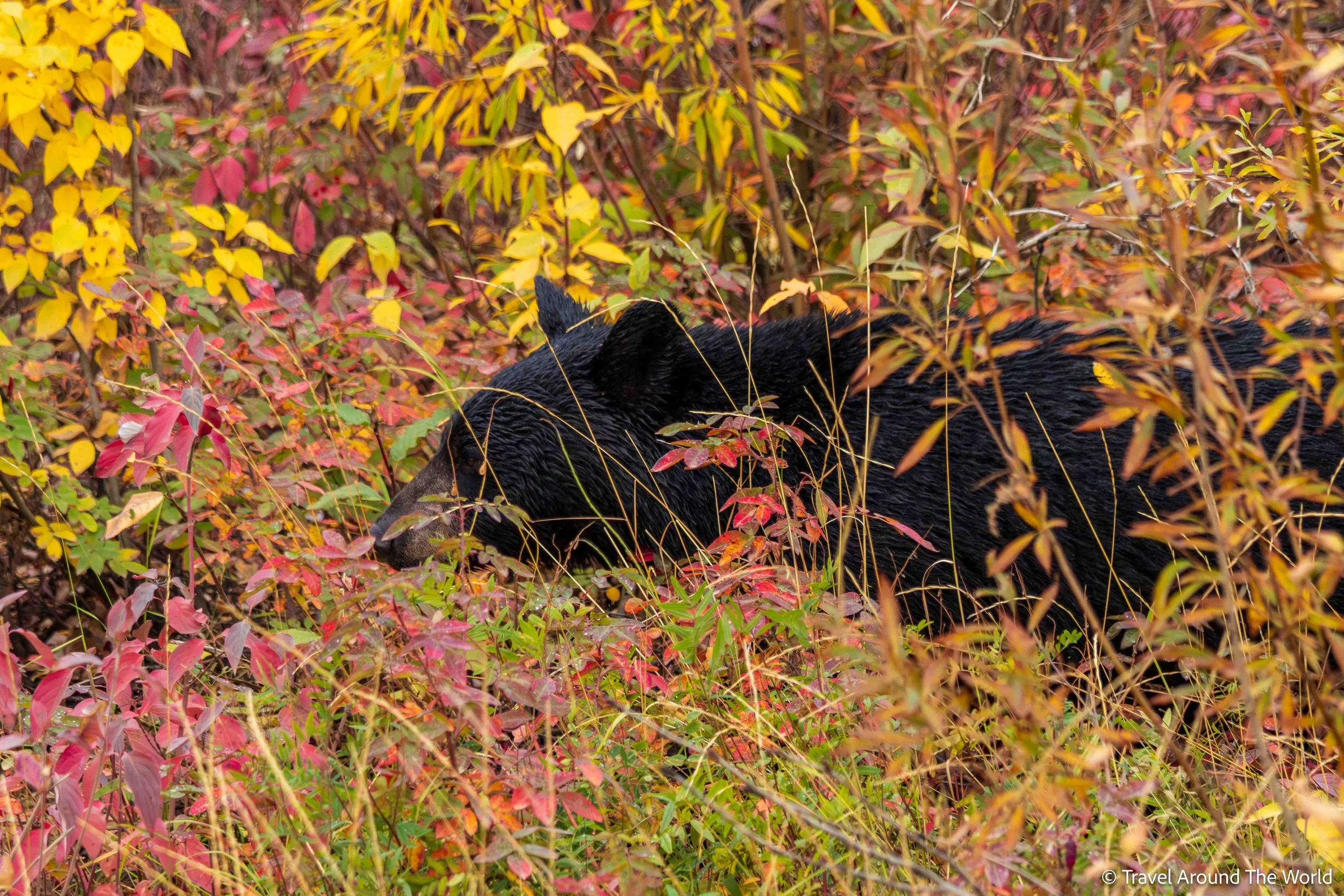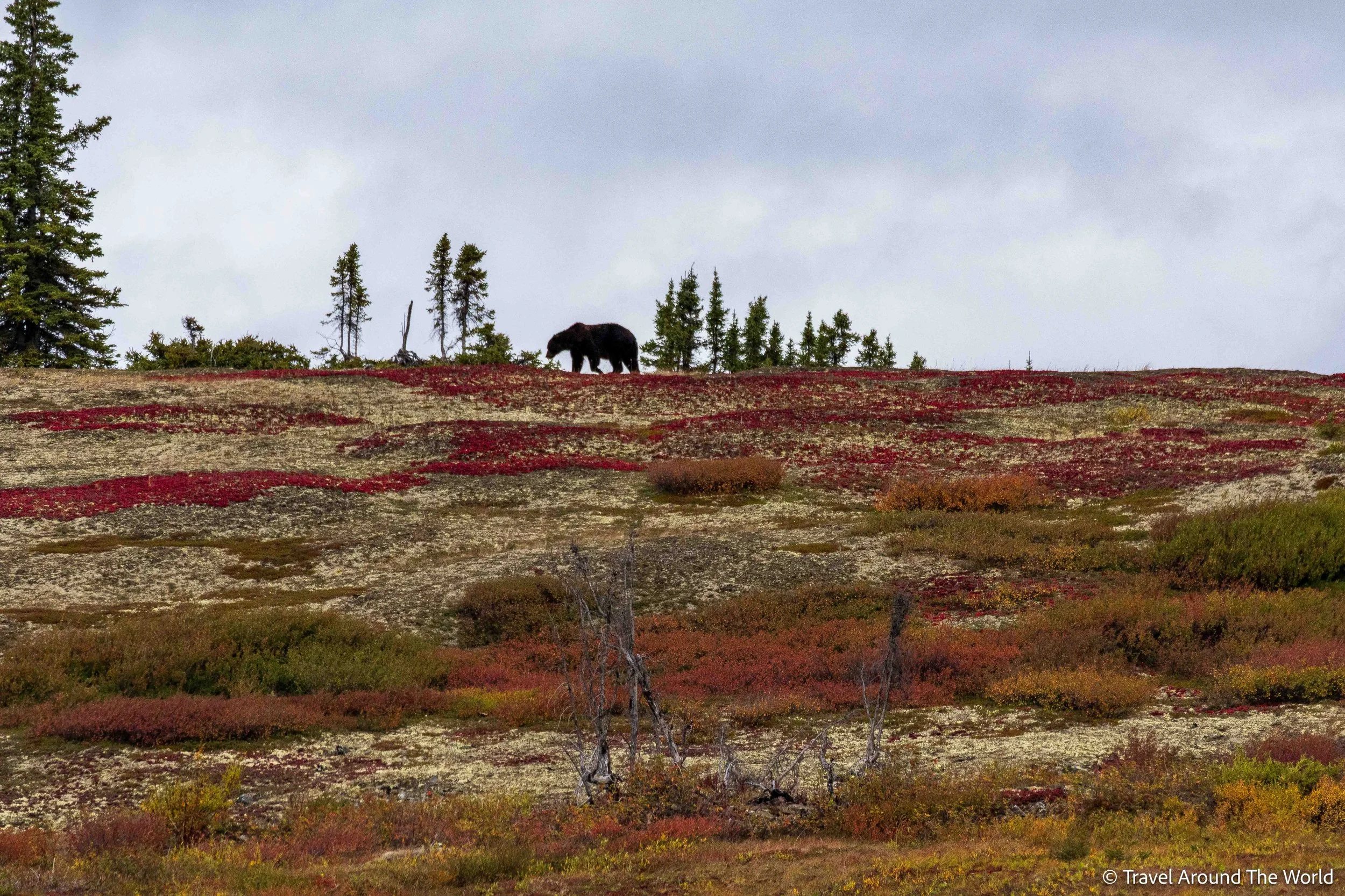 Am nächsten Morgen fahren wir zeitig los und begegnen lange Zeit keinem einzigen Fahrzeug. Wir geniessen die Ruhe und die friedliche Stimmung und halten dabei fleissig weiter Ausschau. Es scheint einfach zu sein, ein grosses Tier wie ein Karibu oder einen Bären in einer baumlosen Tundra-Landschaft ausfindig zu machen. Doch weit gefehlt. Wenn sich das Tier nicht genau in dem Moment bewegt, in dem man seinen Blick in diese Richtung schweifen lässt, hat man fast keine Chance, dieses auszumachen. Zu gut fügt es sich in die gelb-orange-rot-braune Umgebung ein. Plötzlich nehmen wir einen braunen Fleck wahr, der sich scheinbar bewegt. Wir halten am Strassenrand an und versuchen mit unserem Feldstecher den besagten braunen Fleck wieder zu finden. Handelt es sich tatsächlich um ein Tier oder ist es doch nur ein «Caribush» oder «Felsenbären» (mehr dazu findest du in diesem Blog)? Wir entdecken den Fleck wieder, der sich als waschechter Grizzlybär entpuppt. Da er sich ziemlich weit entfernt aufhält, hoffen wir, dass er früher oder später näher an die Strassse rankommen wird. Über eine halbe Stunde sitzen wir mit unseren Kameras und Feldstechern bewaffnet im Auto und beobachten, wie sich der Bär langsam von Beerenstrauch zu Beerenstrauch bewegt. Anstatt auf uns zuzukommen, bewegt er sich hügelaufwärts und gibt schliesslich eine perfekte Silhouette auf dem Hügelkamm ab, bevor er aus unserem Sichtfeld verschwindet. Was für ein Glück, dass wir genau zur richtigen Zeit an den richtigen Ort geschaut haben (und es nicht in einer Baustelle war).