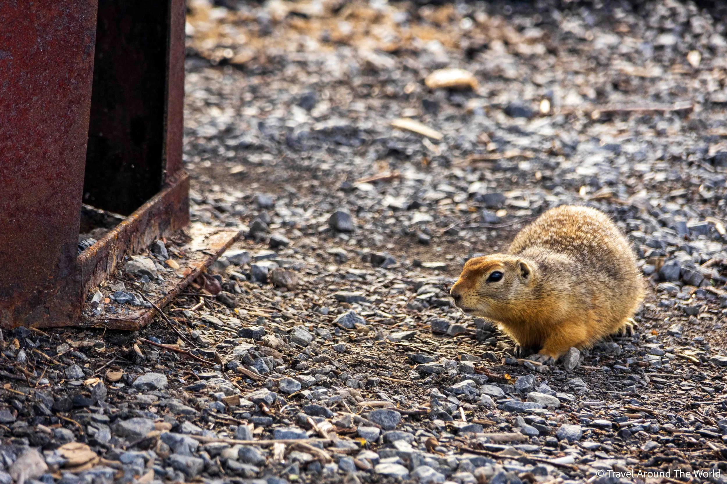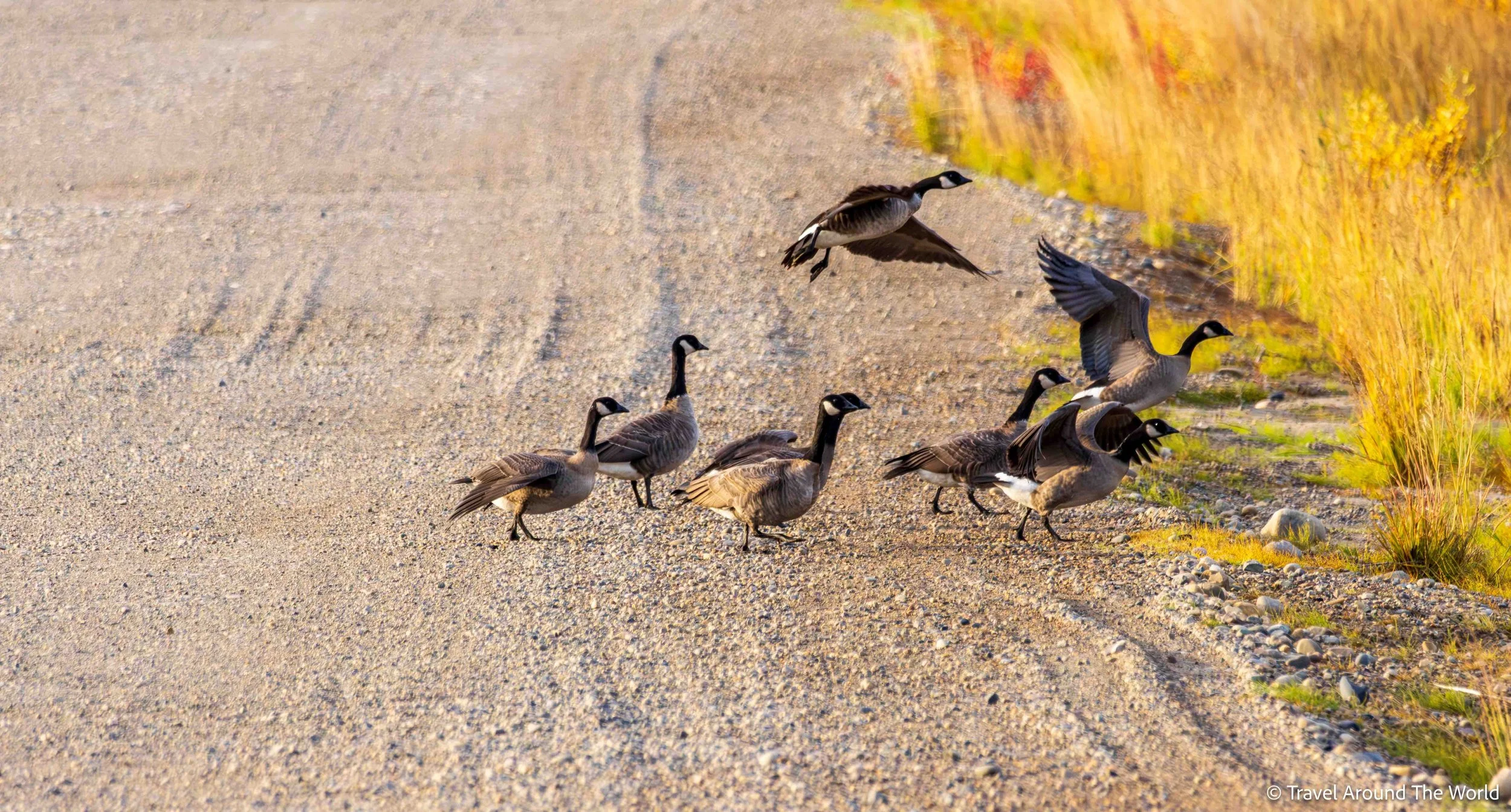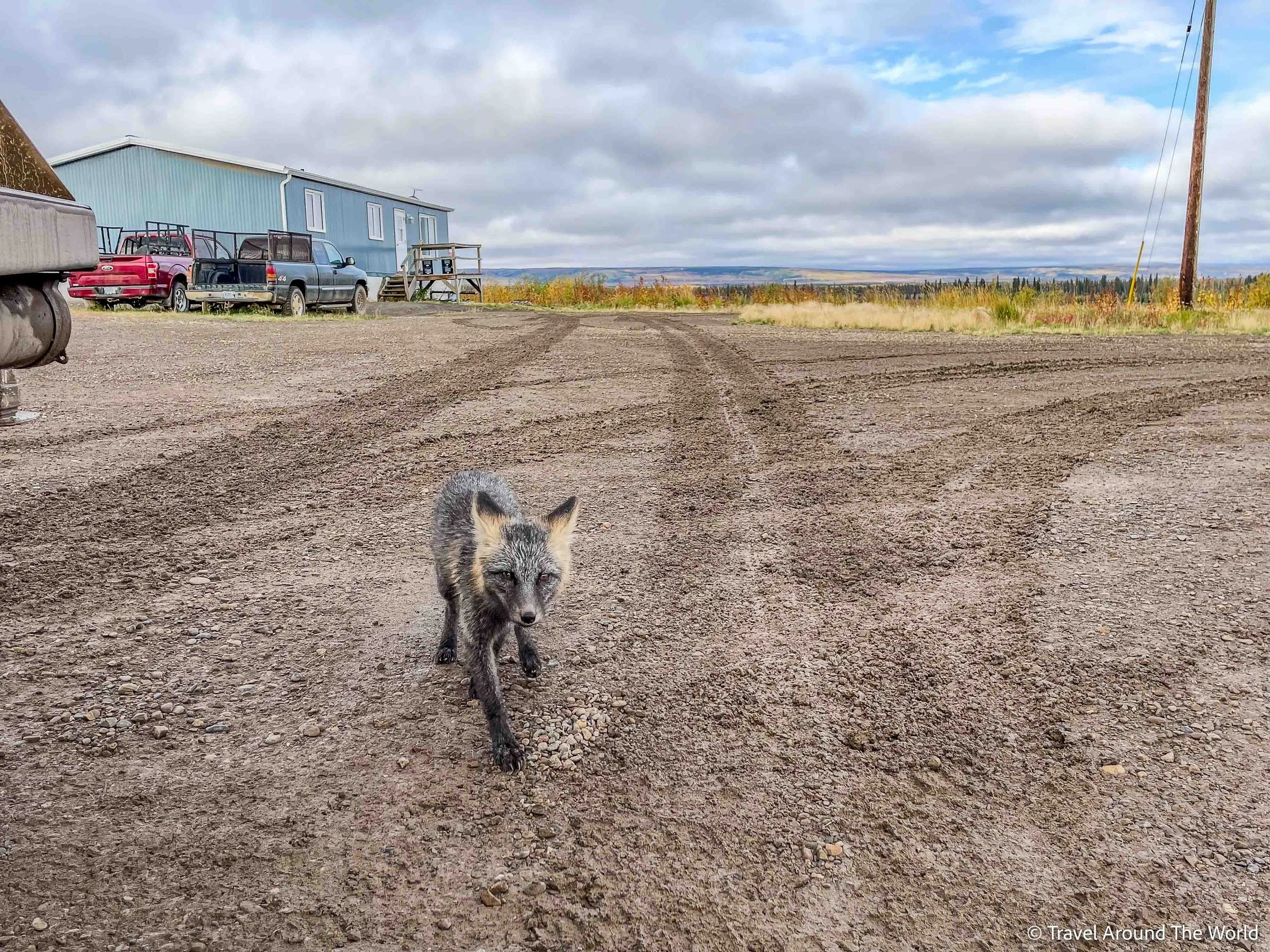 Wir freuen uns sehr, als wir einen Schwarzbären am Strassenrand entdecken. Obwohl er nur wenige Meter von uns entfernt durch das Gebüsch wandert und nach reifen Beeren sucht, können wir immer nur kurz einen Blick auf ihn erhaschen. Für ein gutes Foto ohne Zweige im Bild reicht es nicht. Wie sich im Nachhinein zeigt, ist dieser Schwarzbär tatsächlich der einzige, den wir auf unserer gesamten Zeit in Alaska und Kanada sehen (während wir bei den Braunbären auf rund 30 Tiere gekommen sind). Beim Tanken in Fort McPherson gesellt sich plötzlich ein neugieriger Silberfuchs zu uns. Ganz vorwitzig kommt er sehr nah an uns ran und hofft wohl auf ein Häppchen. So ist es ein ständiges «Stop and Go». Hier eine schöne Landschaft, da ein Schneehuhn, wieder ein besonders schöner Hügel, … Irgendwann kommen wir natürlich auch wieder an der Baustelle mit dem Lotsenfahrzeug vorbei. Wir trauen unseren Augen nicht, als direkt neben der Strasse mitten im Baustellengebiet vier Karibus stehen. Das kann doch nicht wahr sein! Jetzt fahren wir fast 2000 Kilometer durch die Wildnis, wobei etwa 10 Kilometer durch Baustellen sind. Und genau hier – im Lärm und Staub von Baumaschinen – stehen vier Karibus und wir können nicht mal anhalten. Wenn das kein perfektes Beispiel für eine selbsterfüllende Prophezeiung ist.