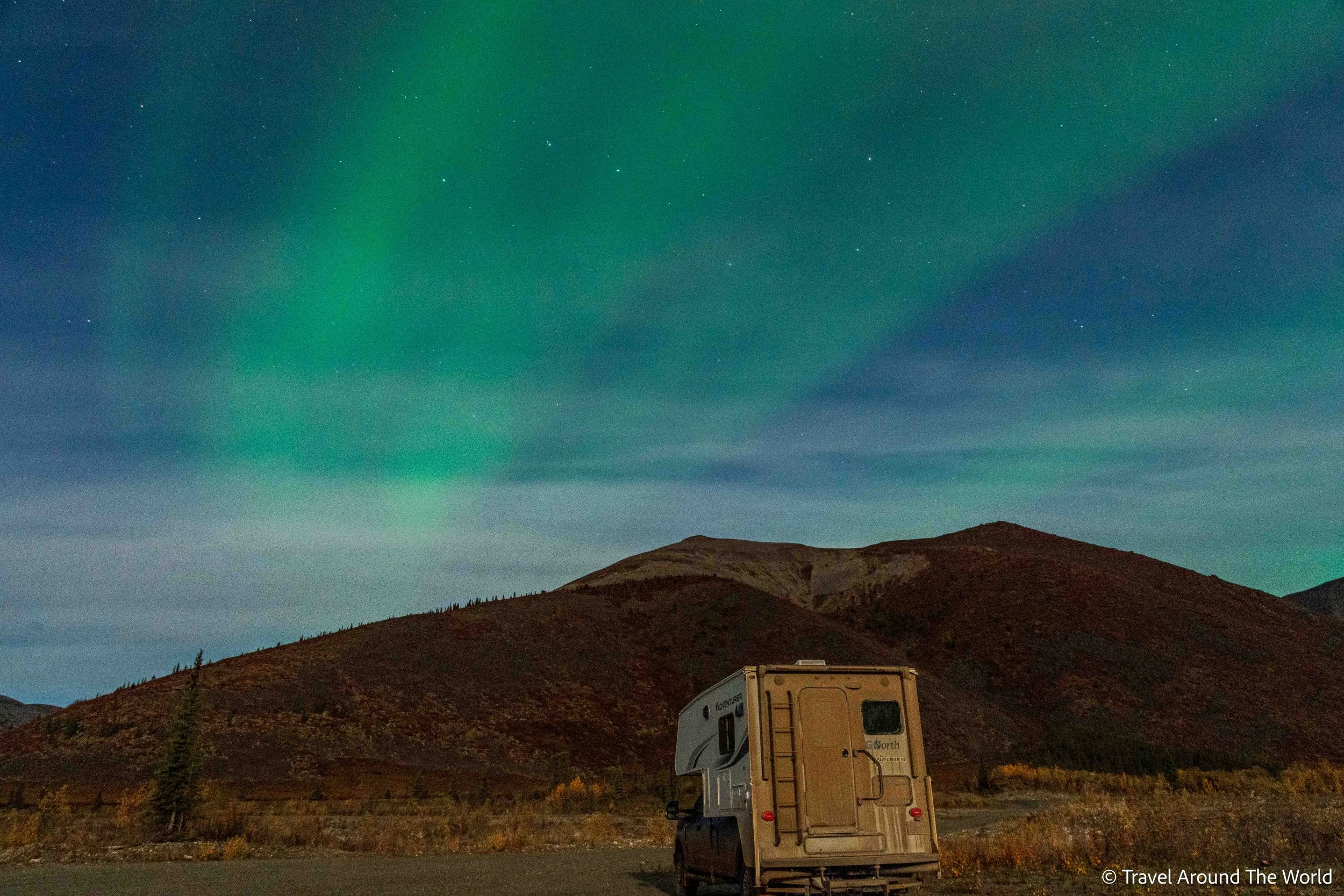 Gemäss einer Rezension auf der iOverlander-App, unserer «Camping-Bibel», steht uns der allerschönste Platz jedoch noch bevor. Sie haben dort sowohl auf dem Hin- wie auch auf dem Rückweg übernachtet und fänden es das schönste Plätzchen auf dem ganzen Dempster. Also wirklich ganz, ganz toll! Dieses Prachtstück möchten wir uns nicht entgehen lassen. Als wir ankommen, vergewissern wir uns nochmals auf der App, ob wir richtig sind. Sind wir. Diesen Platz haben wir auf dem Hinweg auch schon gesehen. Er ist schön, keine Frage, aber auf dem Dempster ist es praktisch überall schön(er). Wir finden es lustig, wie unterschiedlich doch Geschmäcker sind und lassen es uns dann aber doch nicht nehmen, über Nacht hier zu bleiben. Später am Abend werden wir noch mit einem Nordlicht belohnt – eben doch ein spezielles Fleckchen.
