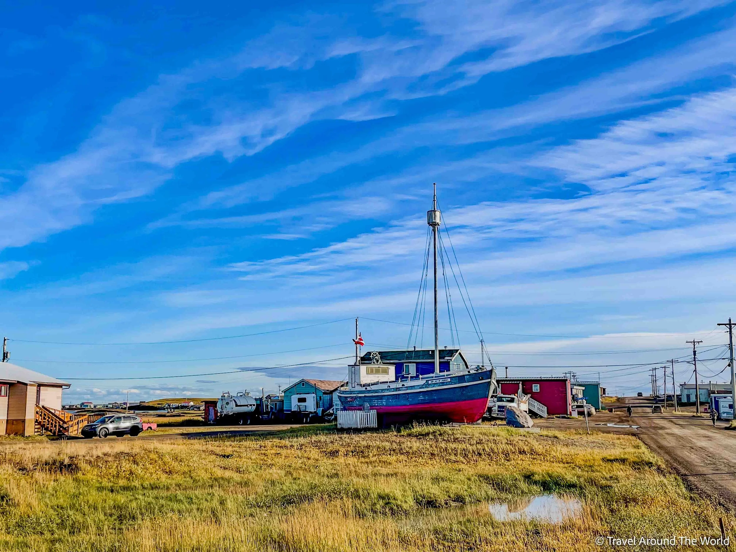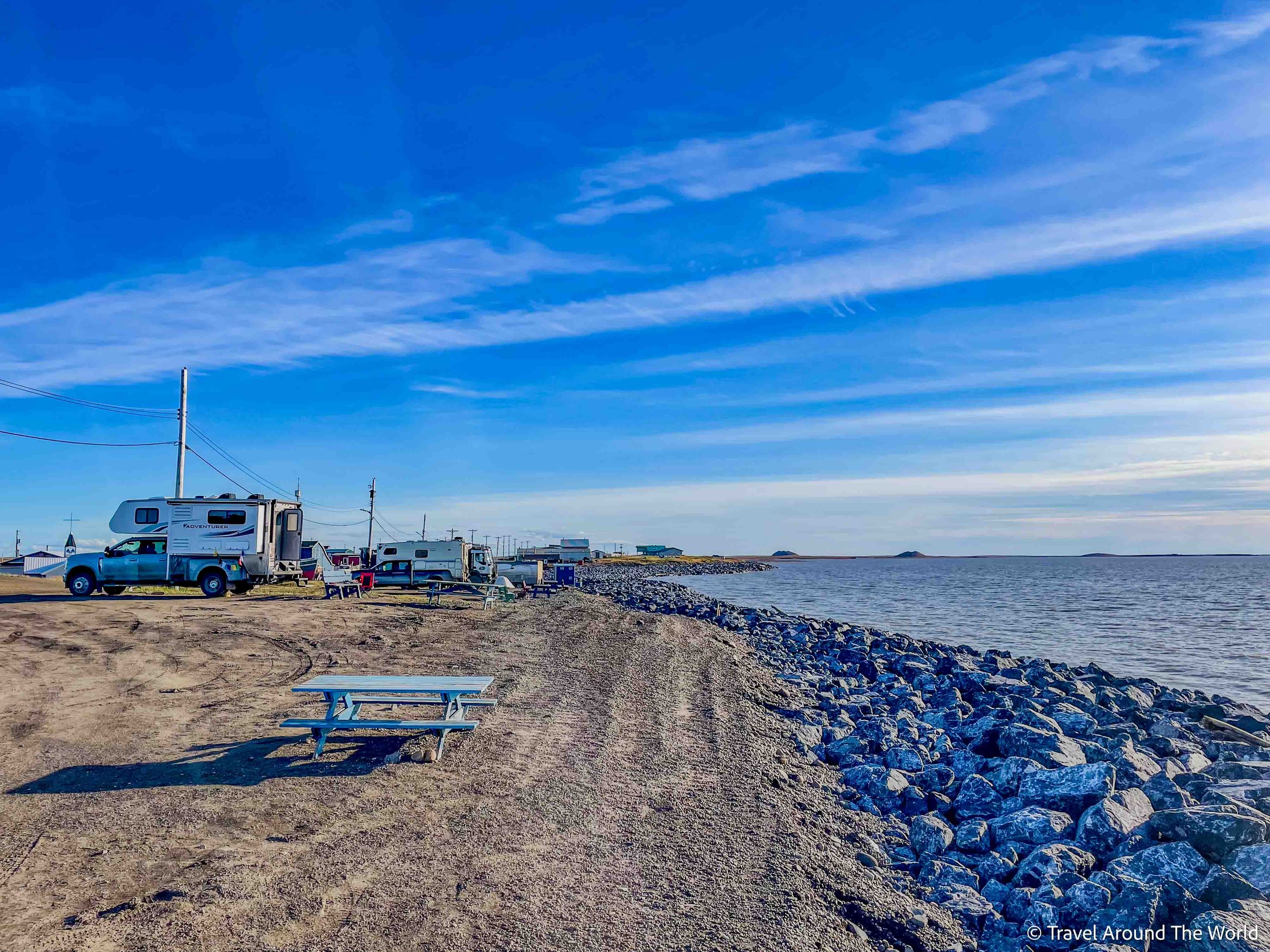 Wenn die Strassenverhältnisse es zulassen und wir gut vorwärtskommen, möchten wir heute gerne bis ans Ende der Strasse in Tuktoyaktuk (kurz: Tuk) fahren. Die beiden kurzen Fährfahrten bringen wir ohne allzu lange Wartezeiten hinter uns. Weil es ein so schöner Tag ist und wir noch genügend Vorräte haben, beschliessen wir, Inuvik erst auf dem Rückweg einen Besuch abzustatten und stattdessen weiterzufahren. Das Landschaftsbild ändert sich nochmals komplett: nördlich von Inuvik verschwinden auch die letzten Bäume. Stattdessen schlängelt sich die Strasse durch ein Labyrinth von vielen kleinen Seen, durch arktische Tundra mit flammenden Sträuchern und herbstlich gefärbten Flechten. Kurz bevor wir Tuk erreichen, sehen wir die ersten Pingos in der Ferne. Sie sehen aus wie kleine Vulkane, sind in Wirklichkeit jedoch erdbedeckte Eiskerne – ein seltenes Naturphänomen, das in Permafrostgebieten vorkommt. Dann erreichen wir Tuk – nach über 900 Kilometern durch nahezu unberührte Wildnis, wo wir lediglich an drei Siedlungen vorbeigekommen sind: Fort McPherson (ca. 700 Einwohner), Tsiigehtchic (ca. 200 Einwohner) und Inuvik (ca. 3500 Einwohner). In Tuk leben rund 1000 Einwohner. Hier, im hohen Norden Kanadas, wo die Strasse direkt am Arktischen Ozean endet. Im Besucherzentrum ausserhalb der Ortschaft buchen wir einen Stellplatz auf dem Campingplatz, der sich am äussersten Zipfel befindet. Wir erkundigen uns, wie es der Gemeinde gehe, da wenige Tage vor unserer Ankunft ein heftiger Sturm über Tuk gefegt ist. Häuser wurden beschädigt, Strassen geflutet, Boote zerstört und eine Menge Treibholz angeschwemmt. Sie seien zwar noch mit Aufräumarbeiten beschäftigt, aber das Wasser habe sich zum Glück rasch wieder zurückgezogen. Der Sturm war übrigens der Grund, weshalb die Heilsarmee auf dem Weg hierher war – sie haben Hilfsgüter gebracht.