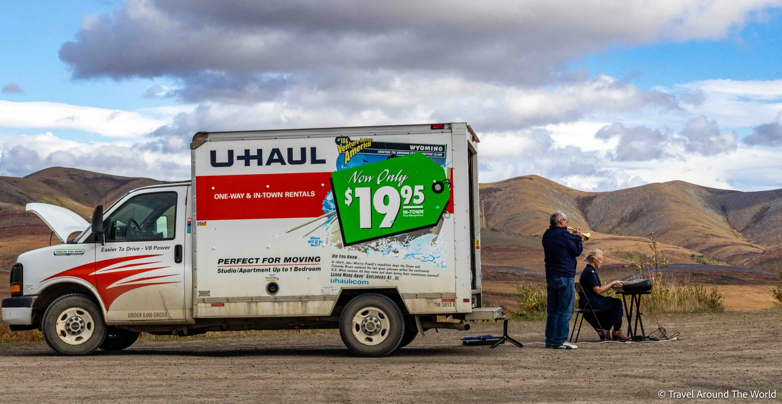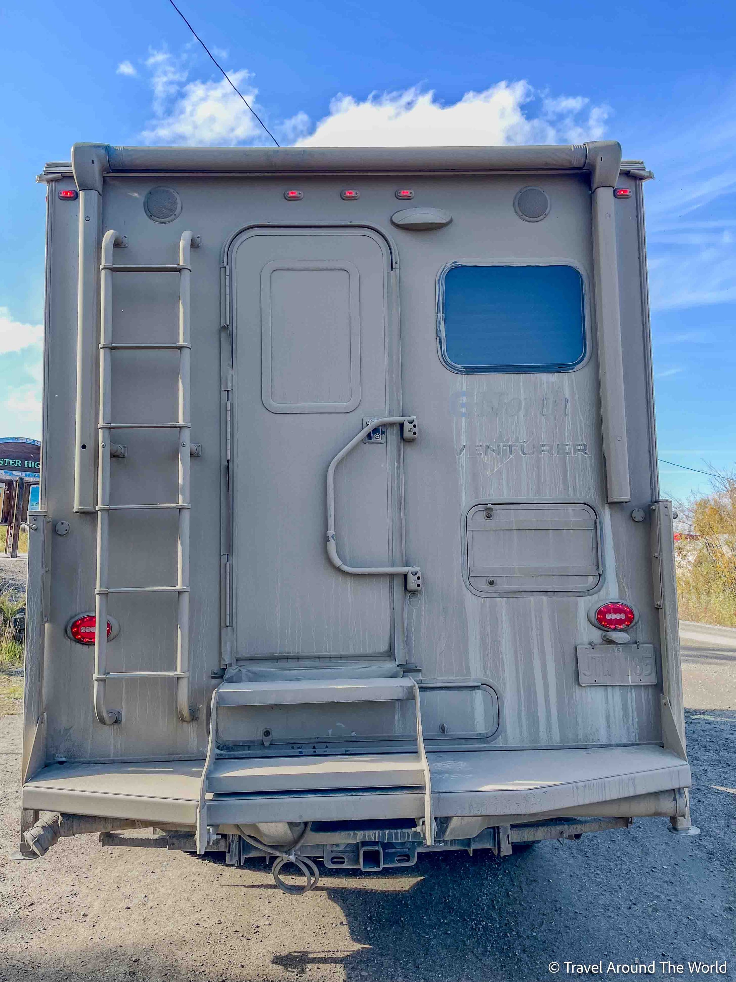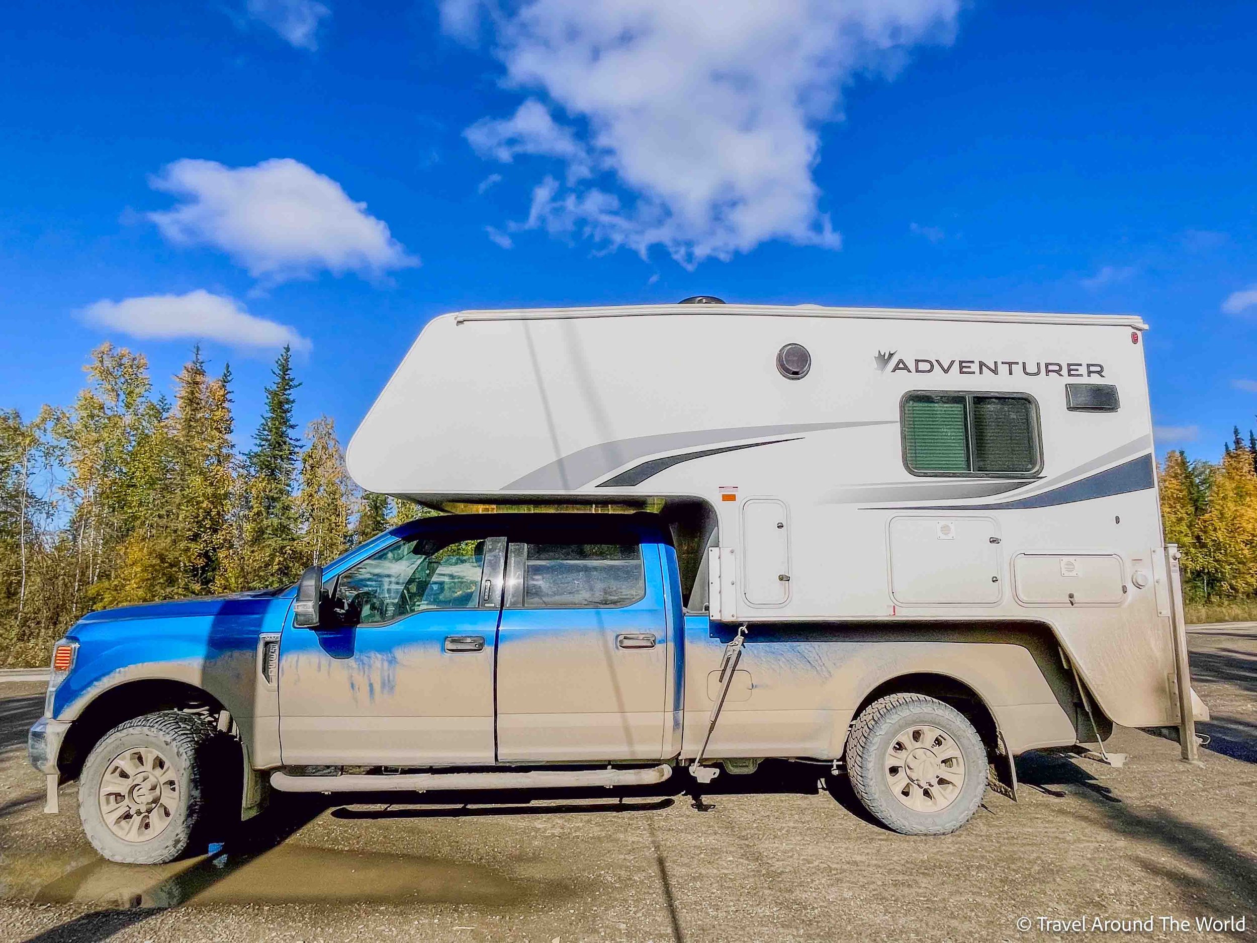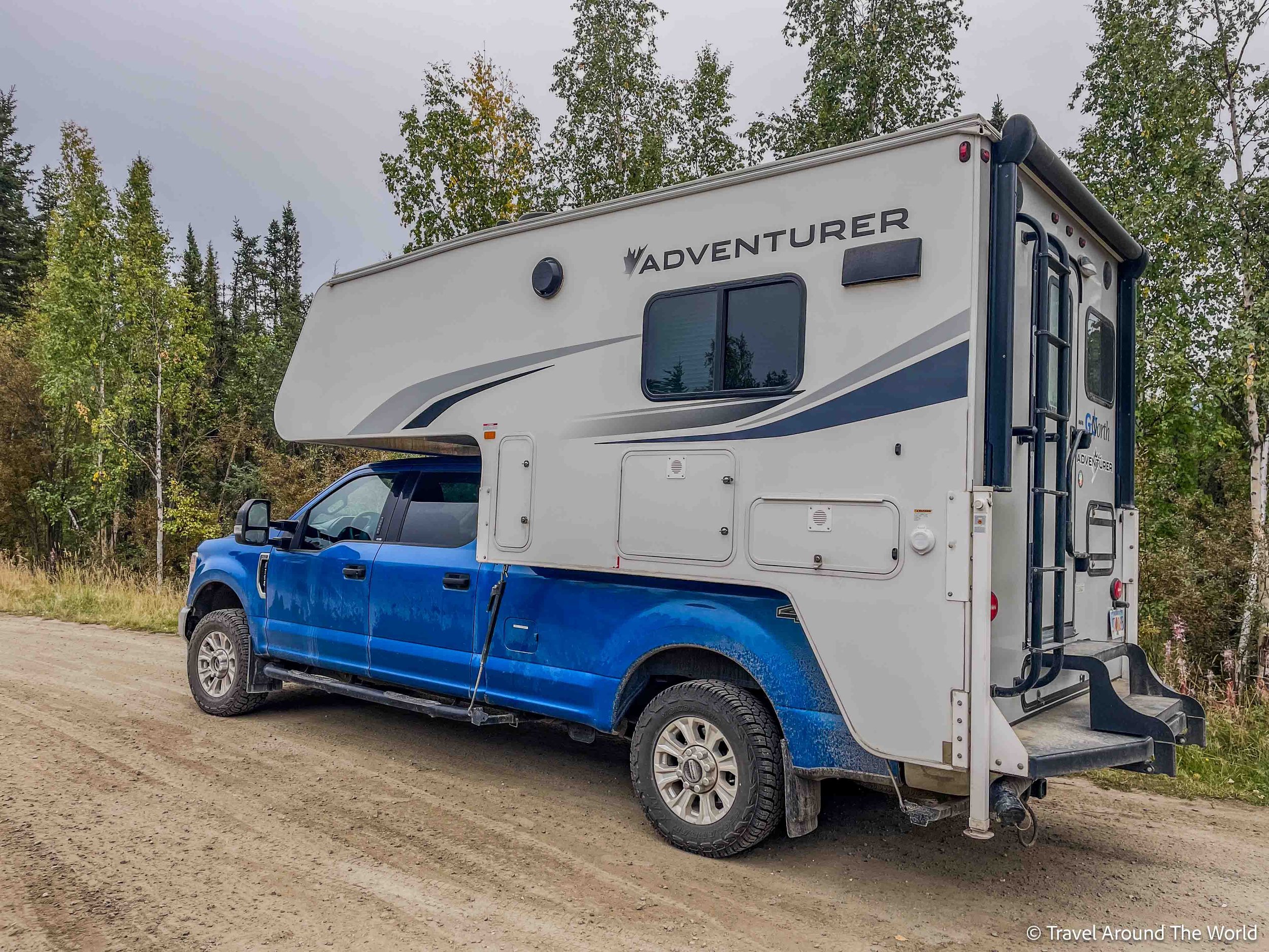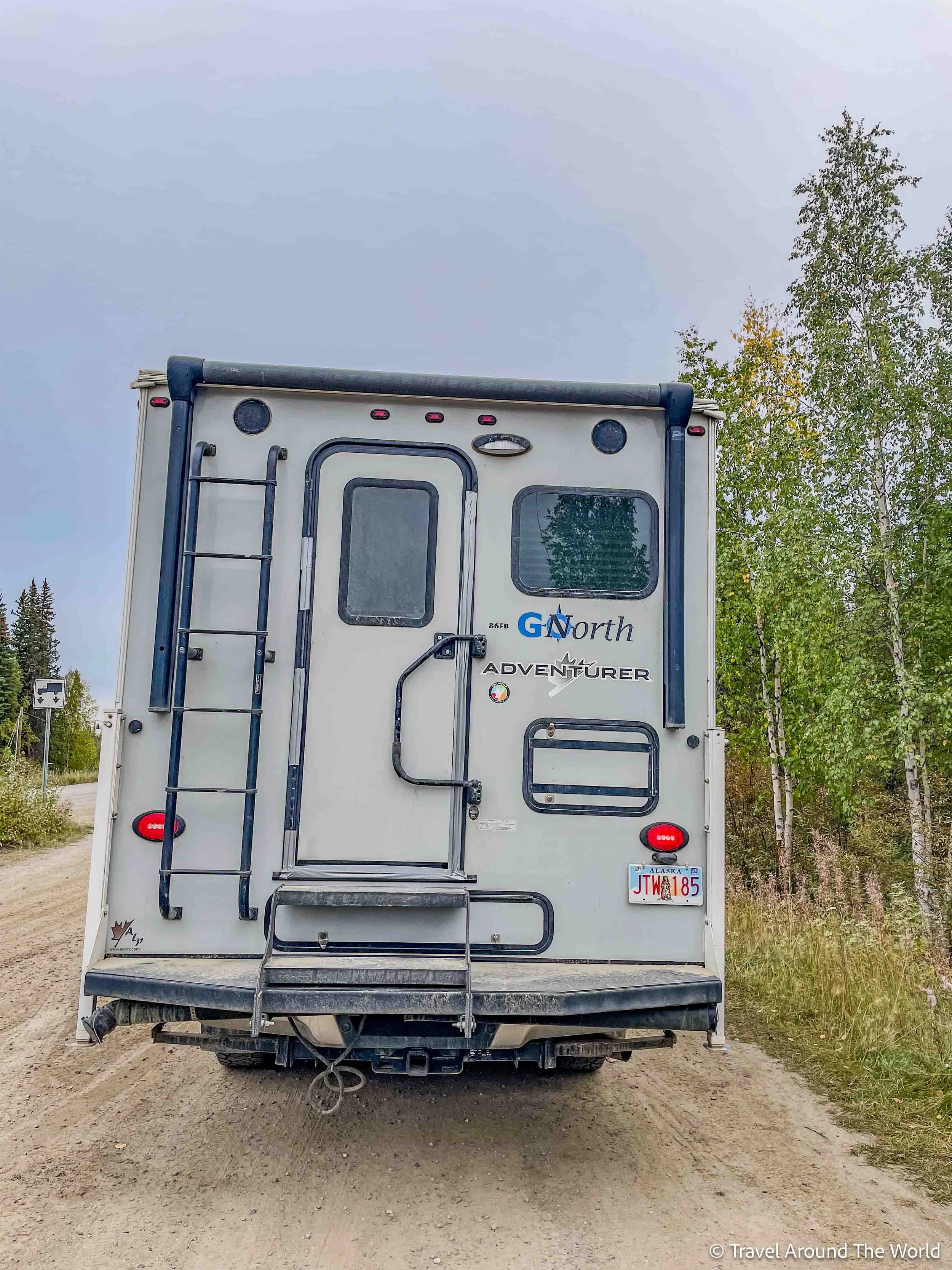 Ausgerüstet mit neuer Musik und ausreichend Lebensmitteln starten wir nach zwei Tagen in Dawson City in unser nächstes Abenteuer: auf dem legendären Dempster Highway geht es bis zum Arktischen Ozean hinauf (und auf gleichen Weg auch wieder zurück). Etwas mulmig ist uns schon zumute, denn im Netz kursieren die wildesten Geschichten. Von Leuten, die im Strassengraben gelandet sind, bis hin zu Diskussionen, ob denn nun zwei oder gar drei Ersatzreifen mitgeführt werden sollten. Auch über verschiedene Methoden, um (zu viel) Staub im Fahrzeuginneren zu vermeiden, haben wir einige Tipps gelesen. Kurz nach dem Abzweiger von der Hauptstrasse auf den Dempster halten wir deshalb nochmals kurz an und greifen auf eins unserer Lieblingswerkzeuge zurück: Klebeband. Schon in Australien hat es uns zur Bekämpfung unseres Mottenproblems gute Dienste erwiesen (mehr dazu kannst du in diesem Blog lesen). Hier soll es uns helfen, die Hecktüre zusätzlich abzudichten. Es sah zwar ziemlich krass aus, gebracht hat es aber nicht viel – der Staub findet dennoch seinen Weg in die Kabine. Boden, Tisch, Sitzbank, Küche, sogar die Pfannen in der Schublade sind mit einer Staubschicht überzogen. In den nächsten Tagen steht Putzen weit oben auf unserer ToDo-Liste… Wie man sich denken kann, ist es alles andere als praktisch, wenn man sich die einzige Tür in die Wohnkabine zuklebt. Doch was tut man nicht alles für ein bisschen weniger Staub… Nachdem wir auch noch das obligate Vorher-Selfie gemacht haben, geht es nun wirklich los!
