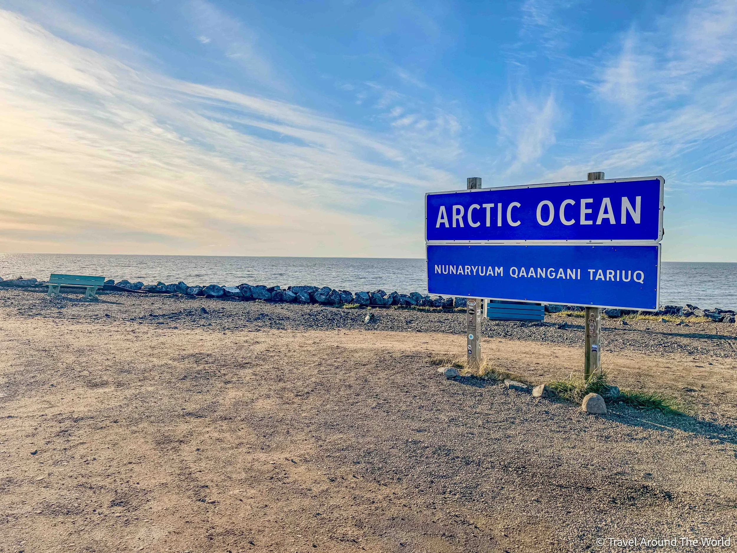 Als wir durchs Dorf fahren, fällt uns tatsächlich vor allem das viele Treibholz auf. Die Strassen sind jedoch wieder normal befahrbar. Wir fahren bis ans Ende der Strasse, wo sich der Campingplatz und das berühmte blaue «Arctic Ocean»-Schild befindet. Irgendwie surreal, plötzlich hier zu sein. Die Strecke hat uns so unglaublich gut gefallen, dass wir uns jetzt schon auf die Rückfahrt freuen. Zuerst aber möchten wir diesen speziellen Ort geniessen und uns einen Pausentag gönnen. Wäre ja zu schade, wenn man einfach nur rechtsumkehrt machen und gleich wieder südwärts fahren würde. Für viele darf ein Bad im arktischen Ozean nicht fehlen – wir beschränken uns darauf, bis zu den Knien hineinzuwaten. Auf dem Campingplatz treffen wir auf die beiden Einheimischen Tina und ihre Mutter. Sie berichten uns von dem Sturm: Davon, dass Stürme an und für sich nichts Ungewöhnliches für sie seien. Normalerweise treten sie jedoch nicht zu dieser Jahreszeit auf. Von unserem Logenplatz direkt am Meer geniessen wir einen zauberhaften Sonnenuntergang. Bevor wir ins Bett gehen, sehen wir sogar noch ein schwaches Nordlicht über uns tanzen. Eine ruhige Nacht wird es allerdings nicht. Es stürmt erneut ziemlich stark und angesichts der Bilder und Erzählungen des erst vor wenigen Tagen durchgezogenen Sturms fühlen wir uns auf dem exponiert liegendem Campingplatz nicht wirklich wohl. Wir stehen sogar mal auf und gehen nach draussen, um zu sehen, wie hoch die Wellen gegen den Steinwall schlagen.