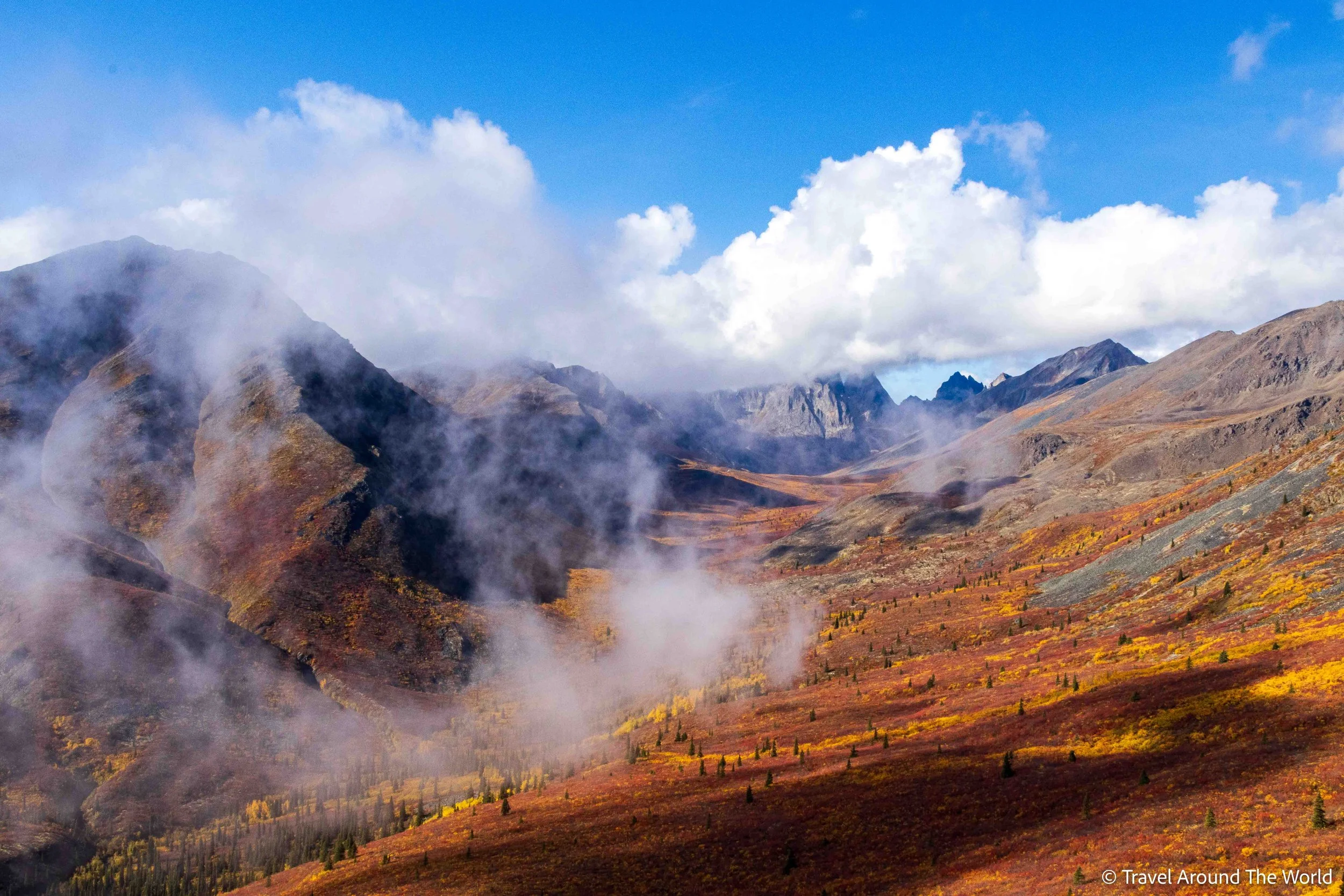 Auf zwei weiteren kurzen Wanderungen kommen wir etwas von der Strasse weg und können Einblicke in Seitentäler gewinnen. Am Aussichtspunkt des Grizzly Lake Trails hoffen wir zusammen mit ein paar anderen Wandernden, dass sich der Nebel verzieht und die Sicht auf die schroffen, kantigen Berge freigegeben wird. Ganz gelingt es nicht, doch es reicht aus, um für einen nächsten Besuch eine Mehrtageswanderung ins Hinterland des Tombstone Territorial Parks ins Auge zu fassen. Es ist einfach wunderschön. Wir haben die Gegend in all ihren Facetten erlebt: bei Sonne und Nebel, bei Regen und Wind, in Staub und Schlamm – und in den intensivsten Herbstfarben. Das ist Natur vom Feinsten.