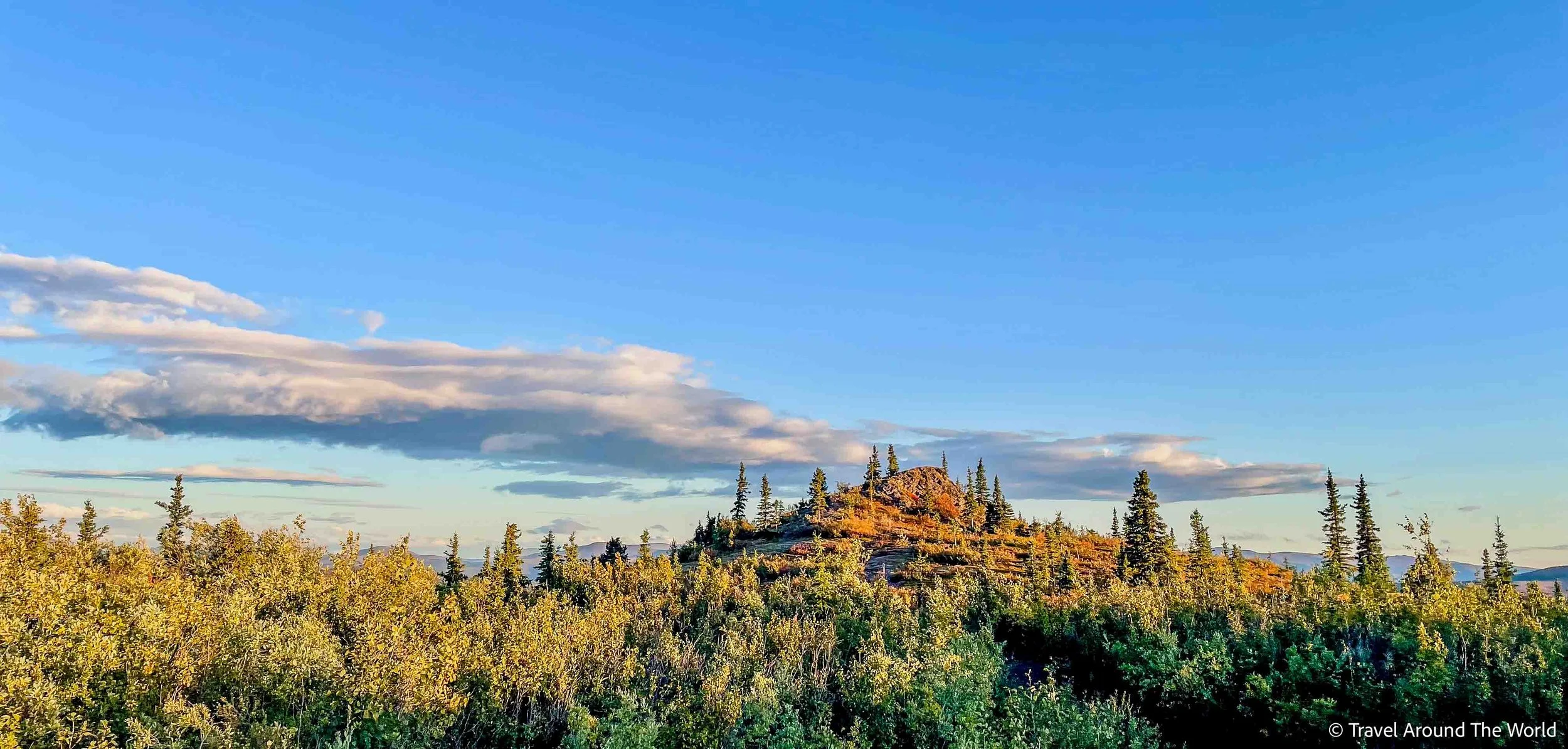 Nach fünf wunderschönen Wochen in Alaska verlassen wir diesen fantastischen Bundesstaat fürs Erste (kleiner Spoiler: wir werden noch zwei weitere Male von Kanada zurück über die Grenze nach Alaska hüpfen). Wir begeben uns auf den Weg nach Dawson City und wählen dazu die Route über den Top of the World Highway. Die unbefestigte Strasse schlängelt sich den Bergrücken entlang. Da man immer wieder über die Baumgrenze hinauskommt, bieten sich – bei guten Wetterverhältnissen – tolle Panoramablicke. Als wir mitten im Nirgendwo die Grenze nach Kanada überqueren, schüttet es wie aus Kübeln. Der Zollbeamte möchte sein überdachtes Häuschen bei diesem Wetter auch nur ungern verlassen. Nach einem kurzen Blick auf unsere Pässe und ein paar Fragen, ob wir Kinder, Tiere, Feuerholz, Waffen oder Drogen mit uns führen, sind wir nun also in Kanada angekommen. Von der schönen Landschaft sehen wir erst mal nicht viel: nebst dem Regen verschleiert Nebel die Umgebung, zudem weht ein starker Wind. Keine guten Voraussetzungen also, um an einem exponierten Ort wie dem Top of the World Highway zu campen. Aber einfach nur durchfahren möchten wir auch nicht. Unser Plan ist demnach, gleich nach der Grenze einen möglichst geschützten Platz zu suchen. Zum Glück finden wir bald eine einigermassen geeignete Stelle und parken den Camper. Später gesellen sich noch zwei weitere Camper zu uns. Wo wir sonst beim Wildcampen meistens für uns allein standen oder andere Fahrzeuge zumindest weit verstreut waren, kauern nun plötzlich drei Camper dicht zusammen. Unser Camper ruckelt zwar ein wenig im Wind, doch dafür «verbläst» es über Nacht die Wolken und den Nebel. Am nächsten Morgen bestaunen wir bei knackigen -1°C die Aussicht über die bewaldeten Hügelketten, die sich bis zum Horizont erstrecken. Und noch etwas nehmen wir wahr: praktisch über Nacht ist es Herbst geworden. In die vielen Grüntöne hat sich heimlich ein Goldgelb geschlichen und erste orangerote Farbtupfer setzen Akzente. Bei schönstem Wetter setzen wir unsere Fahrt fort und erreichen – nach einer kurzen Fährpassage über den Yukon River – Dawson City. Hier findest du weitere Impressionen zur Fahrt von Valdez in Alaska über den Top of the World Highway bis nach Dawson City.