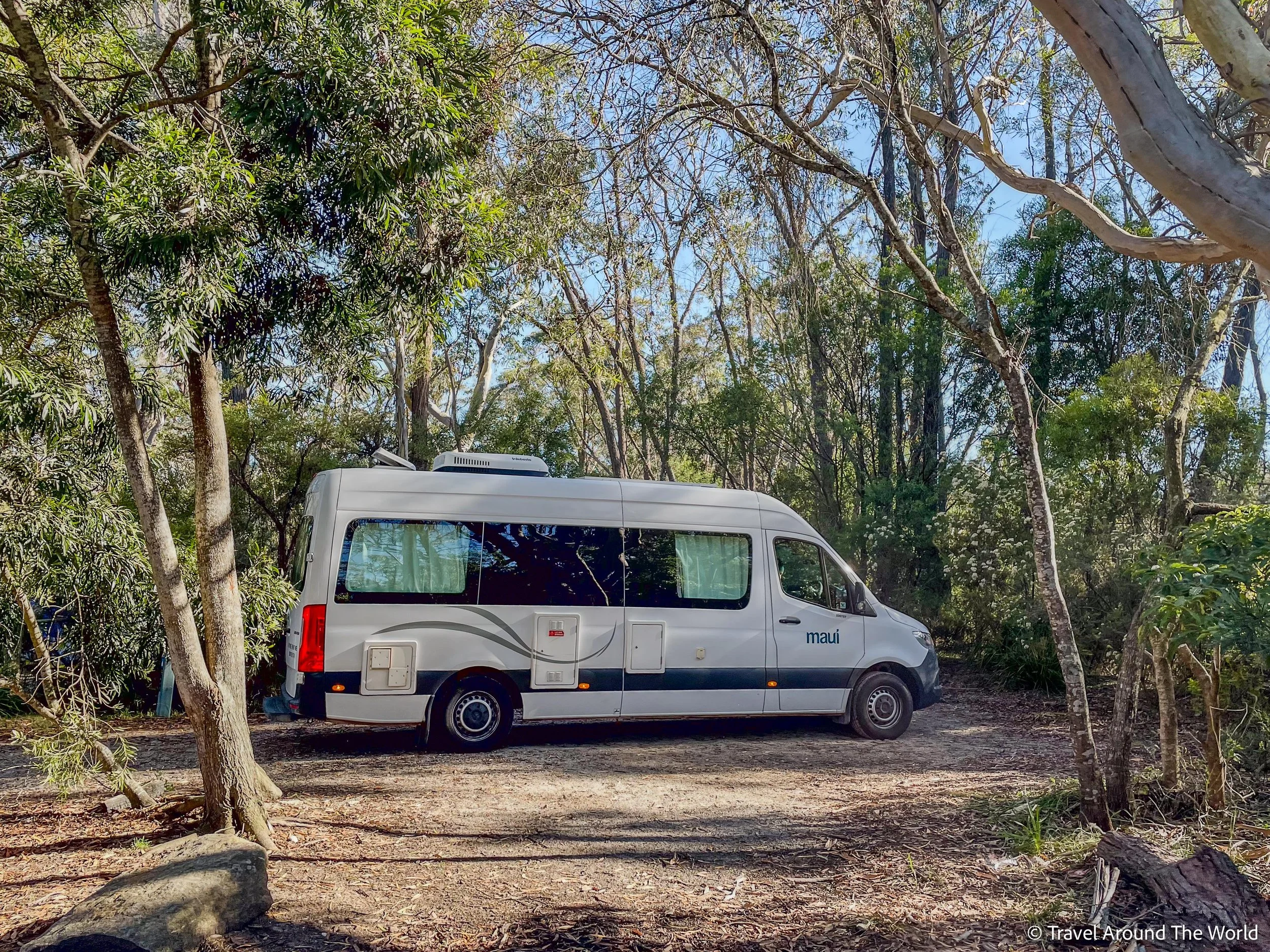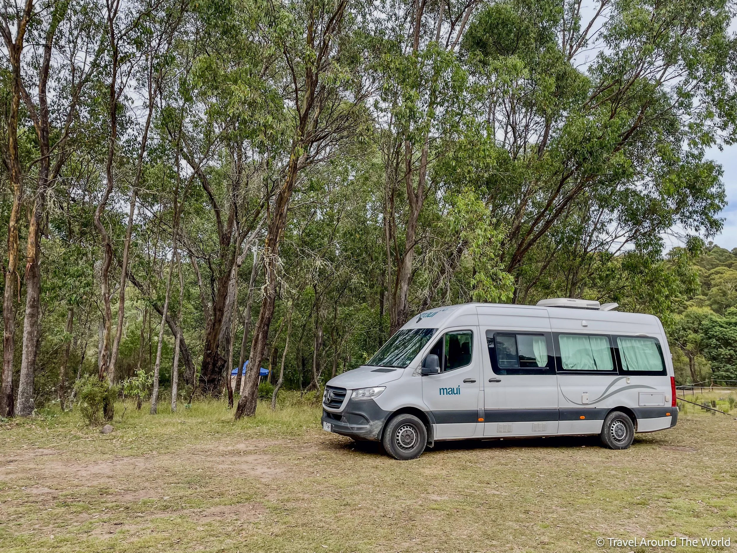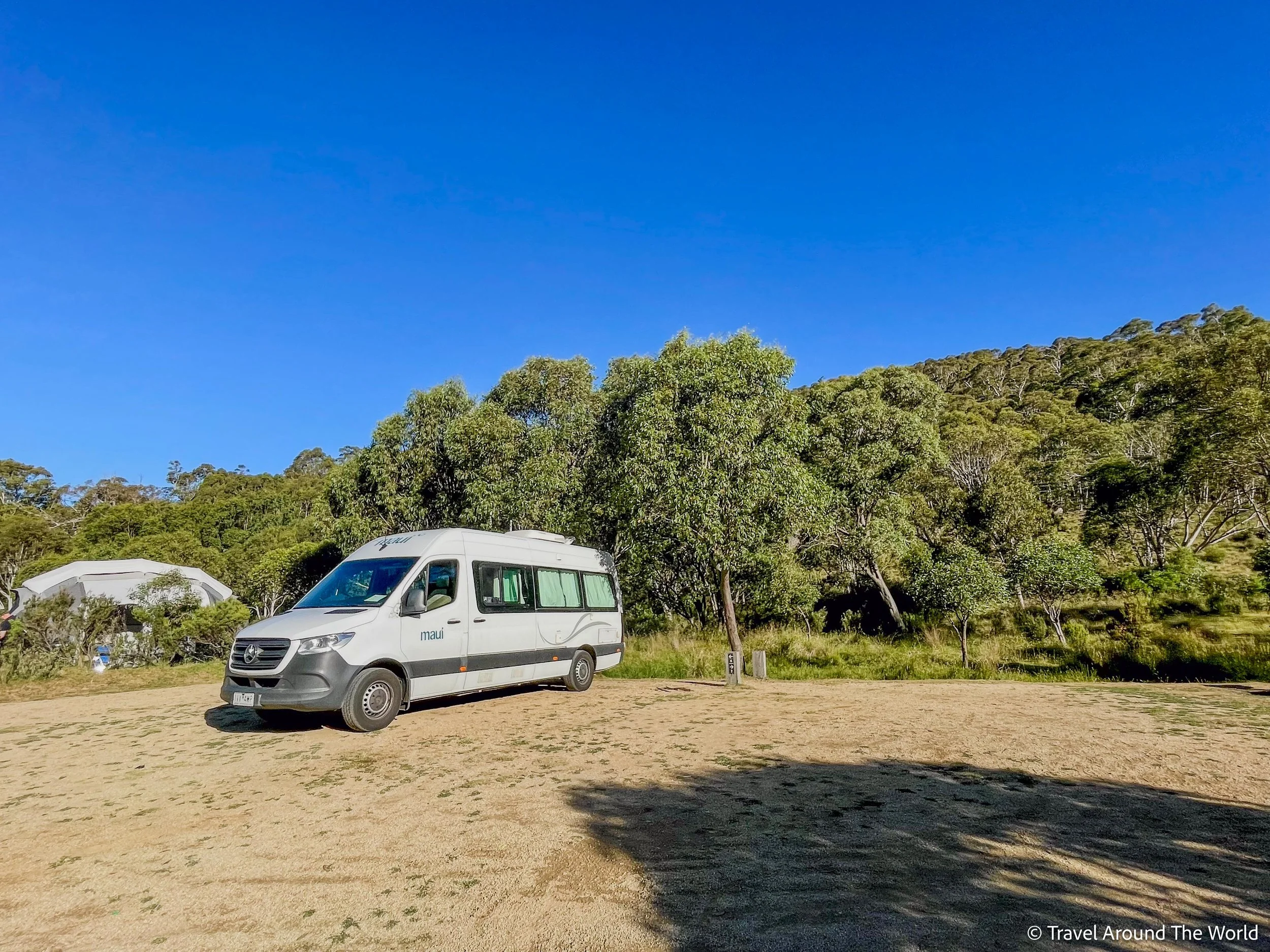 Anders als in Kanada und den USA, wo eine Fahrzeugübernahme in den meisten Fällen erst nachmittags möglich ist, kann in Australien der Camper häufig schon morgens übernommen werden (ohne Aufpreis). Wir haben uns für 09:30 Uhr angemeldet, um die Übernahme in Ruhe machen zu können, genügend Zeit für den ersten Einkauf und das Einräumen unseres Gepäcks sowie die Fahrt auf unseren ersten Campingplatz in den Blue Mountains zu haben. Bei unserem australischen Campervermieter verlässt man sich darauf, dass die Kunden pflichtbewusst die Videos in der App schauen und dann wissen, wie der Hase – äh, der Camper – läuft. Das Fahrzeug wird einem nicht gezeigt und erklärt, sondern es wird lediglich nochmals kurz auf den Mietvertrag, die gewählte Versicherungsdeckung und inkludierten Leistungen eingegangen, dann wird einem auch schon der Schlüssel in die Hand gedrückt und es kann losgehen.